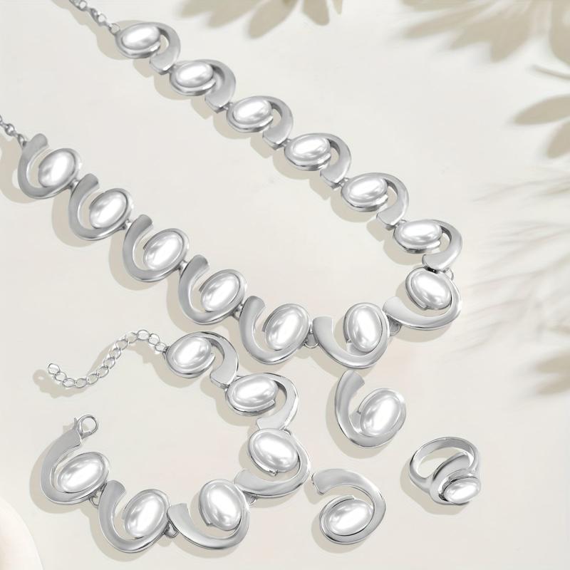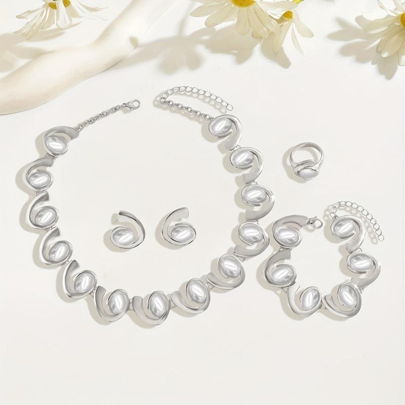 Elegant 4-piece jewelry set featuring a classic silvery 3D geometric spiral arrangement design with acrylic inlay. Perfect for parties or as a gift for family and friends.