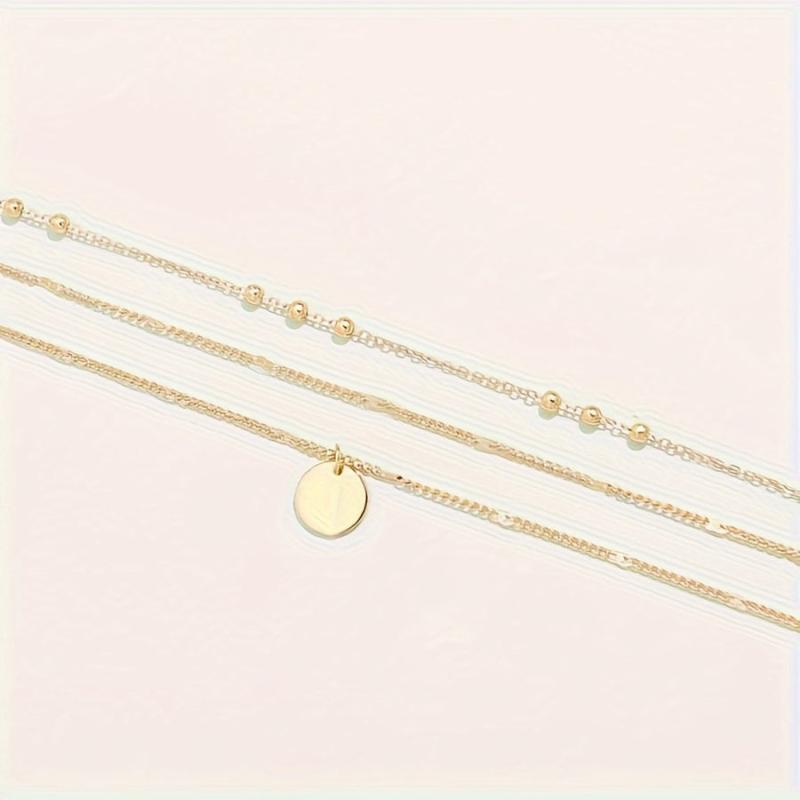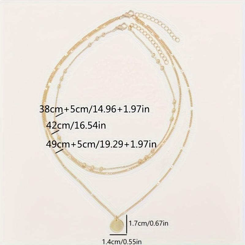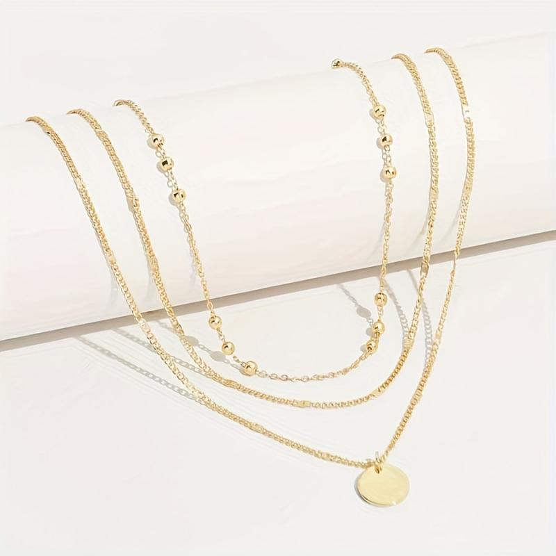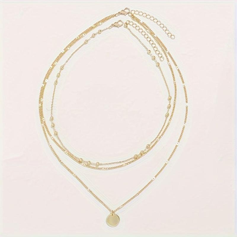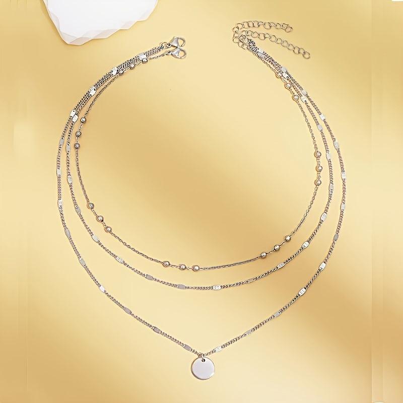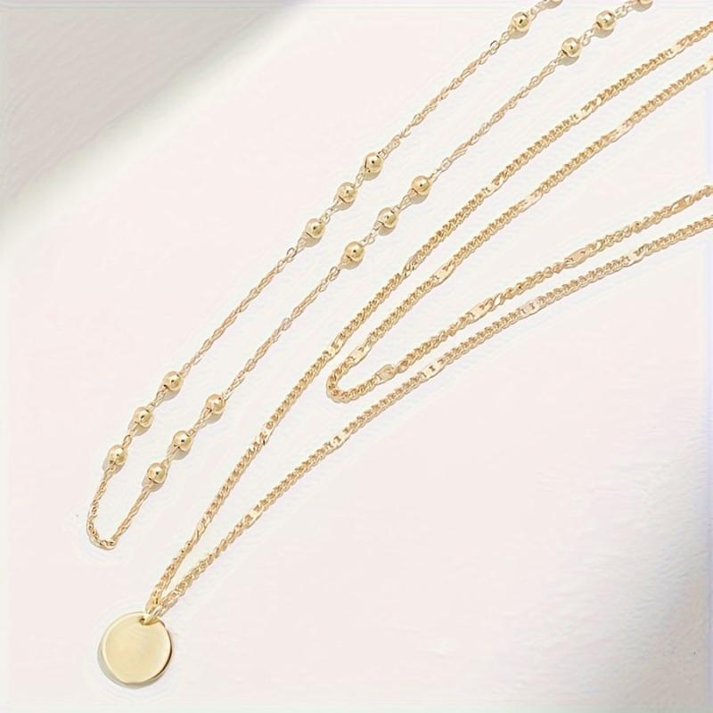 This necklace set features a three-layer design with a round pendant, perfect for adding a stylish touch to any outfit.