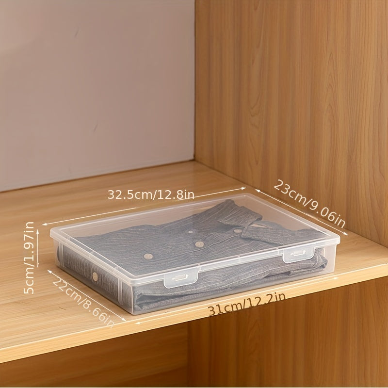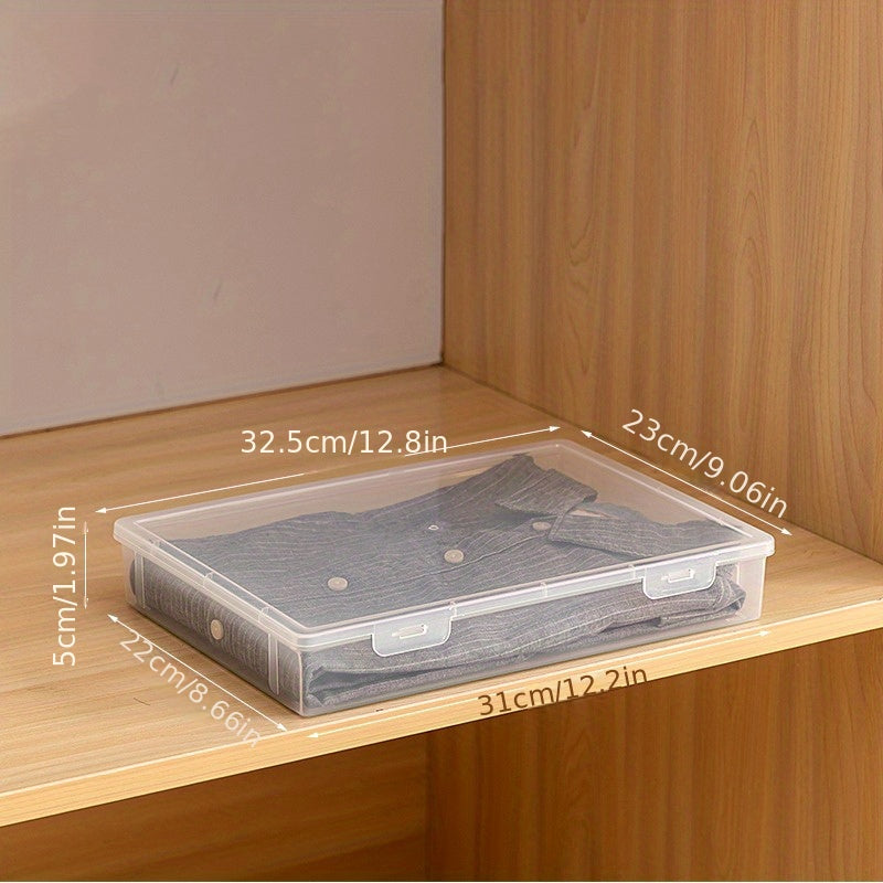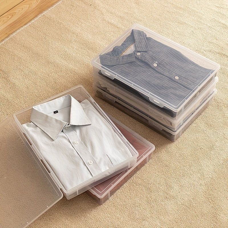 Keep your shirts organized and wrinkle-free with this clear plastic storage box. It provides dust-proof protection and separate compartments for each item.