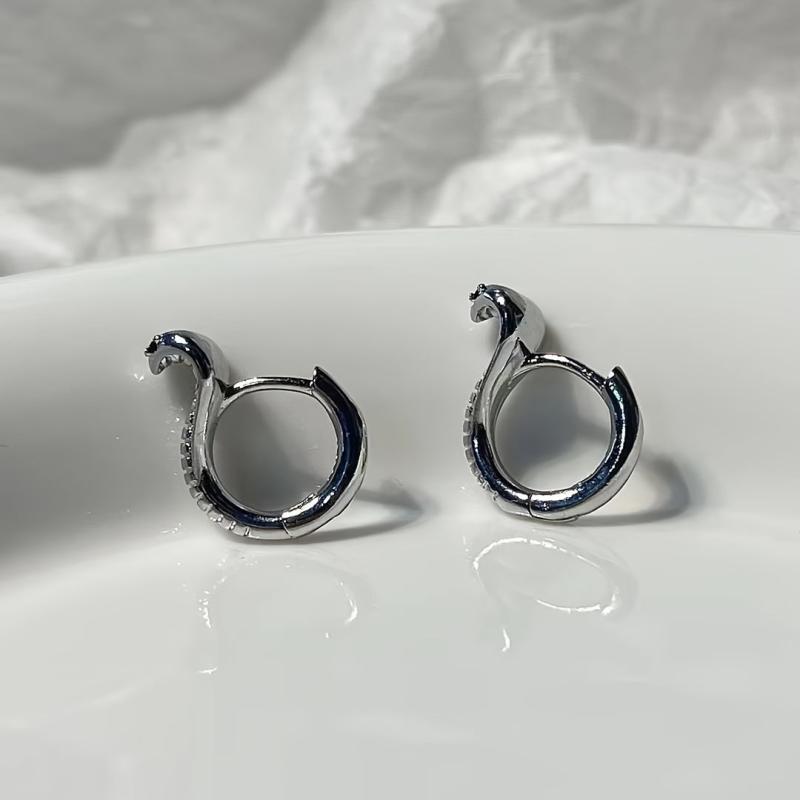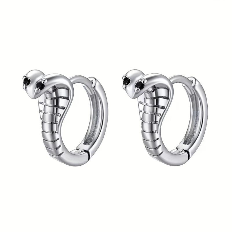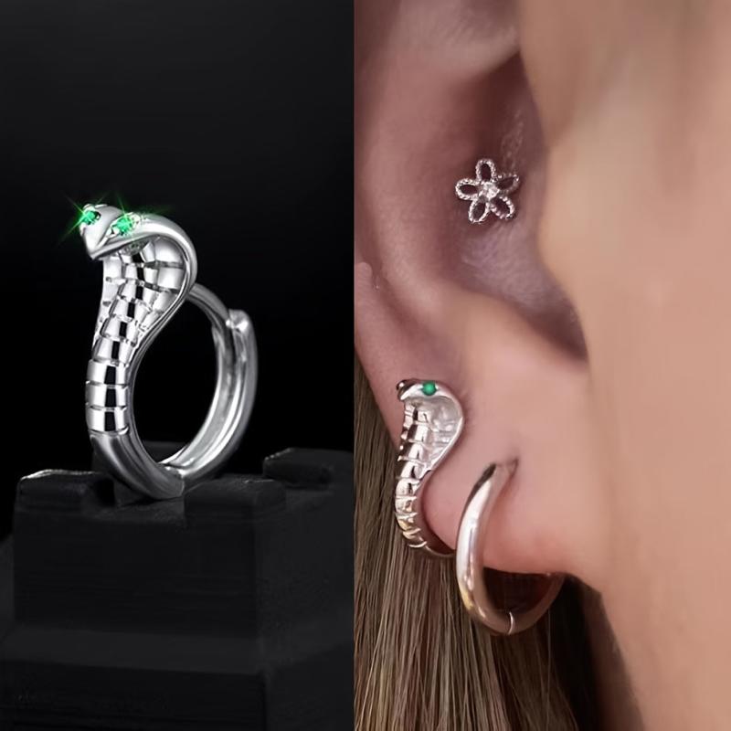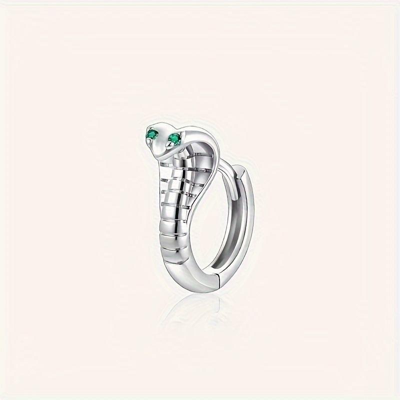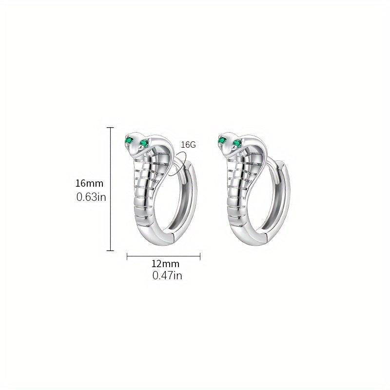 Unisex stainless steel hoop earrings featuring a snake design with synthetic green zirconia eyes. Hypoallergenic 316L ear needle with no plating. Perfect for daily wear.