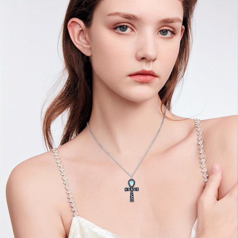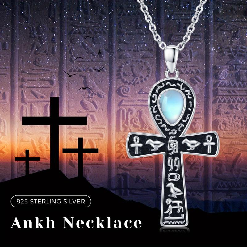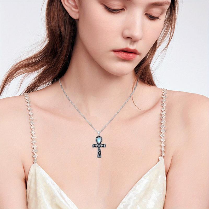 This YFN necklace features a sterling silver Egyptian cross pendant with moonlight stone, cursive script, and geometric pattern. It serves as a protection charm for both men and women.