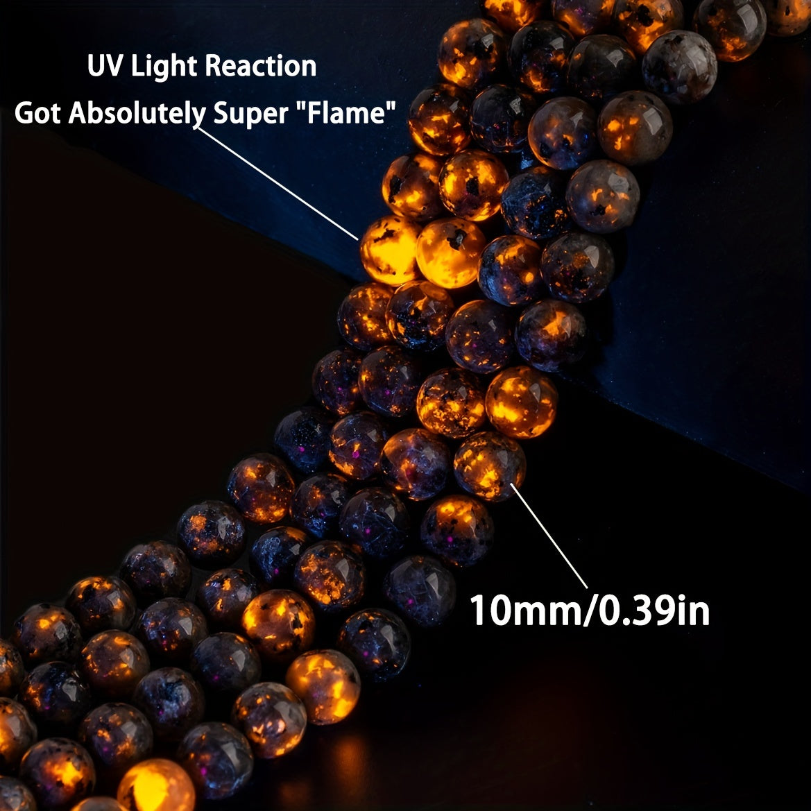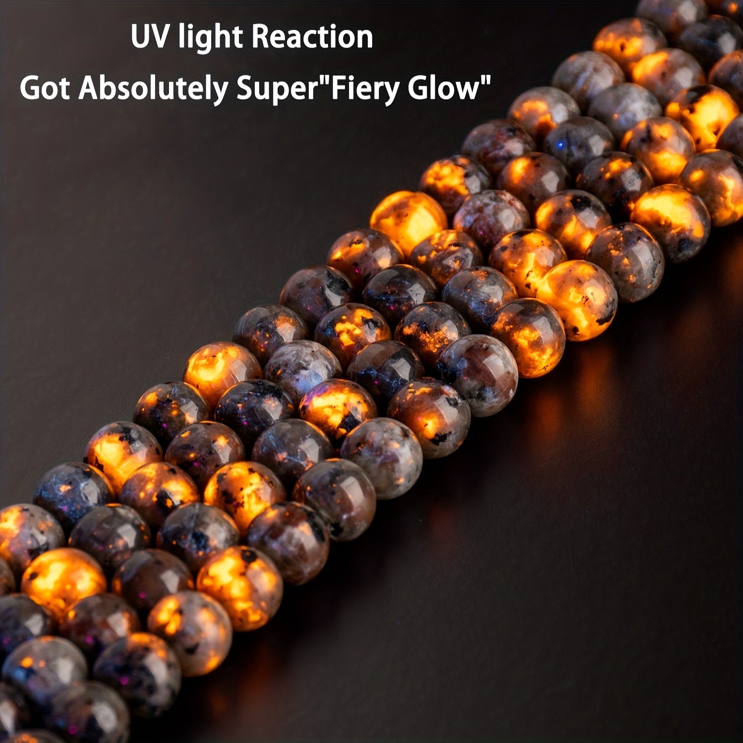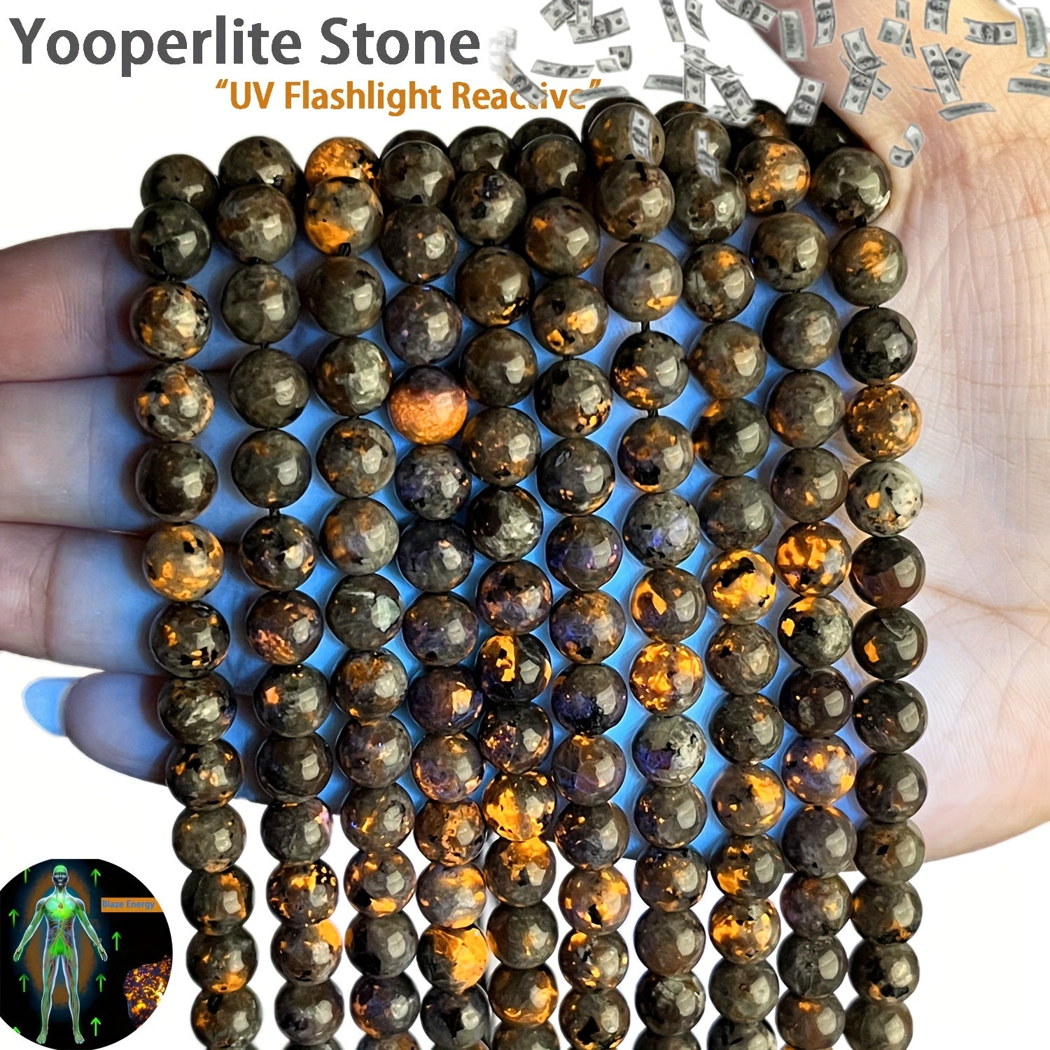 Experience the natural glow of Yooperlite stones that react under UV light. These round beads are perfect for healing and relaxation.