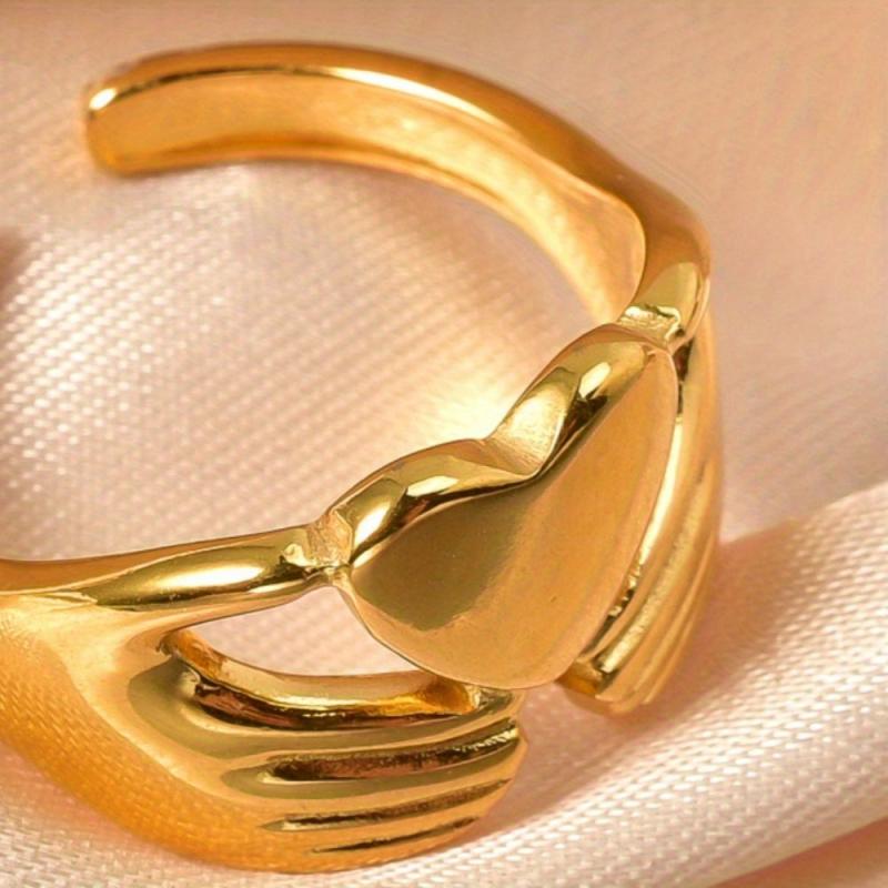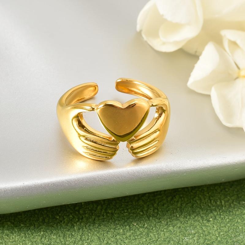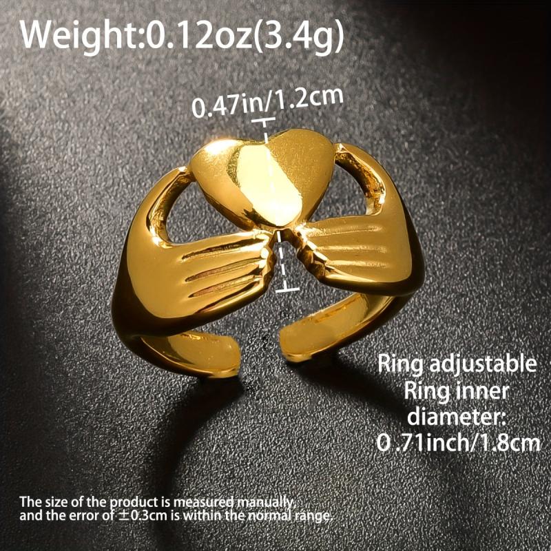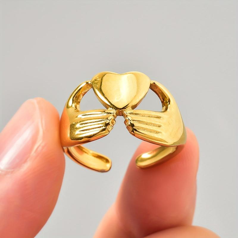 This Claddagh ring features a classic design with interlocking hands and heart motif in gold tone. Perfect for weddings and as a symbol of love and loyalty.