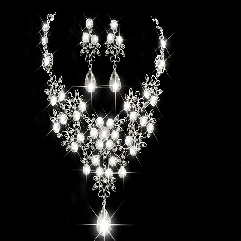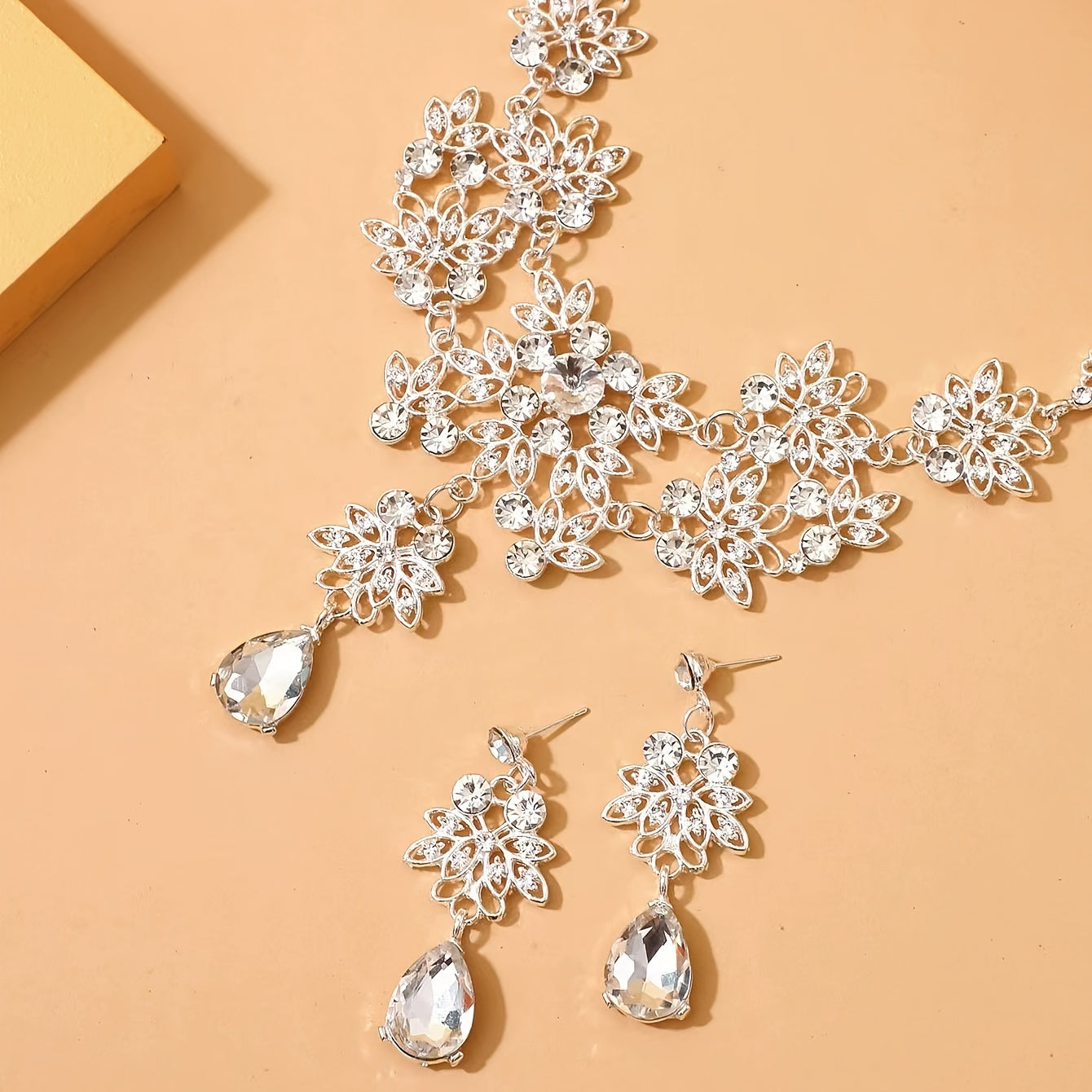 This stunning jewelry set features a flower theme with inlaid water drop shape zircon pendant and tassel details. It is perfect for parties, banquets, and special occasions.