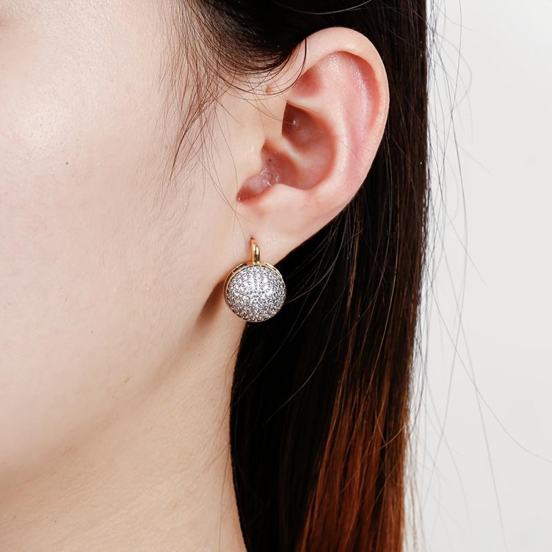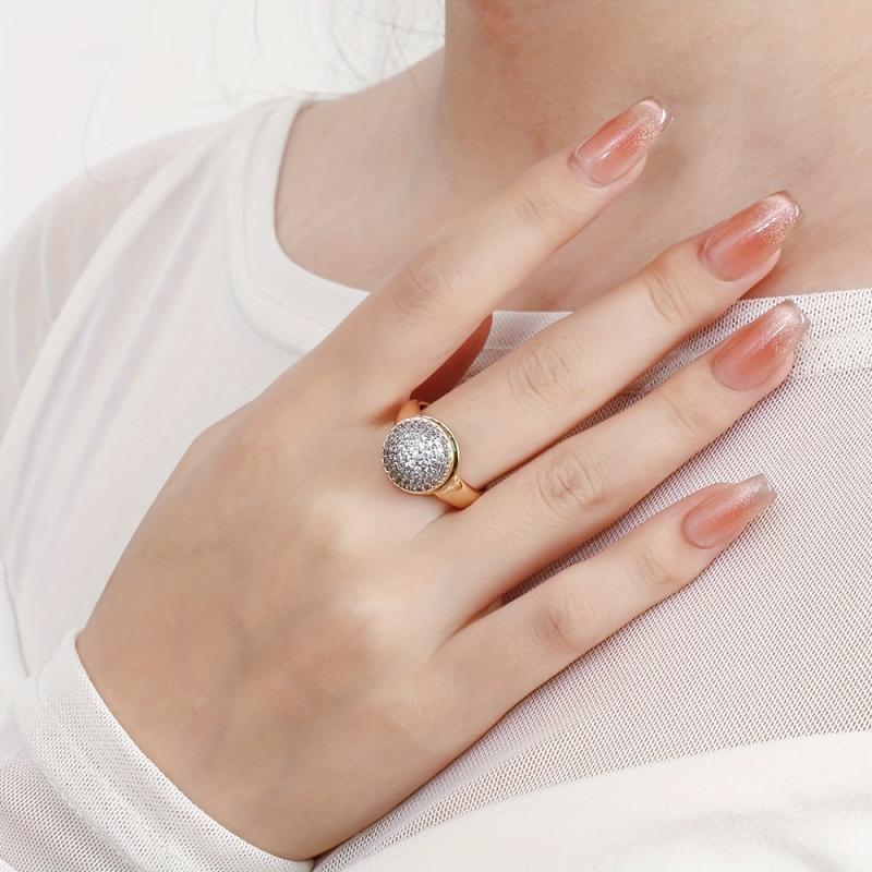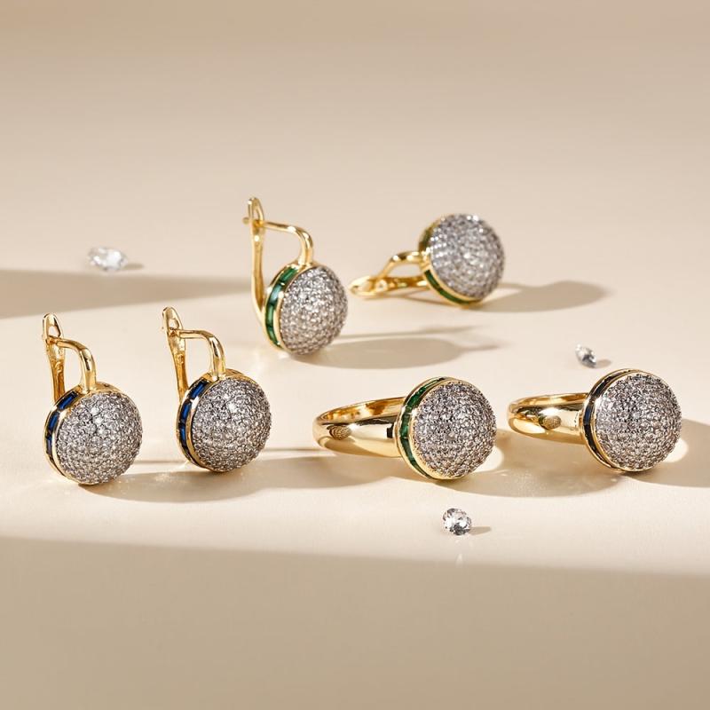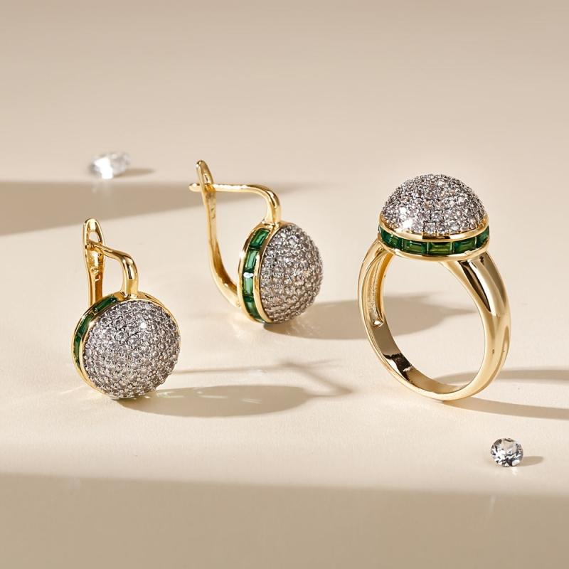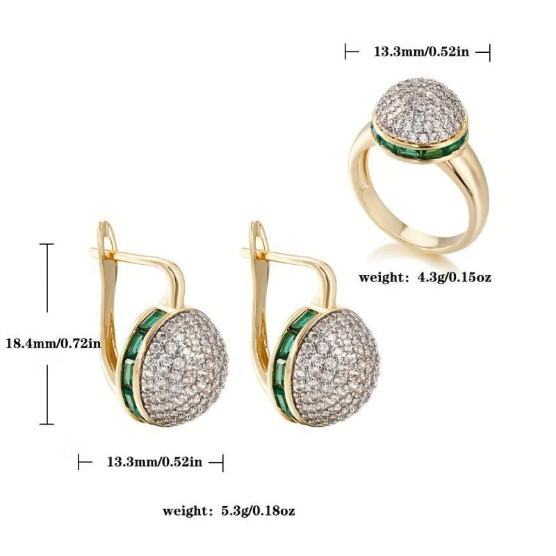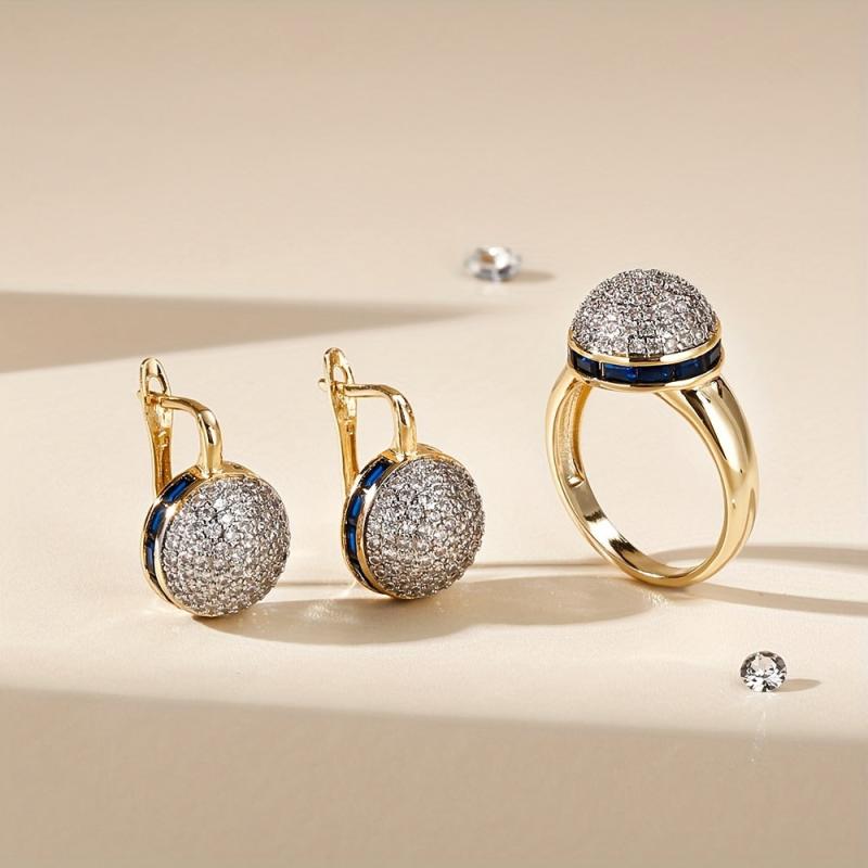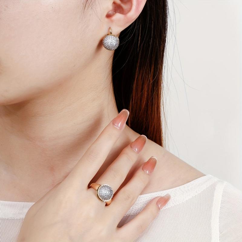 Elegant and luxurious set of inlaid synthetic zirconia round earrings and ring, perfect for parties and holidays. Beautifully crafted with 14K golden jewelry finish.