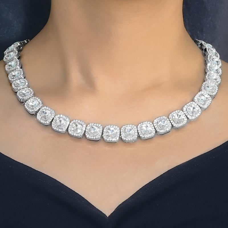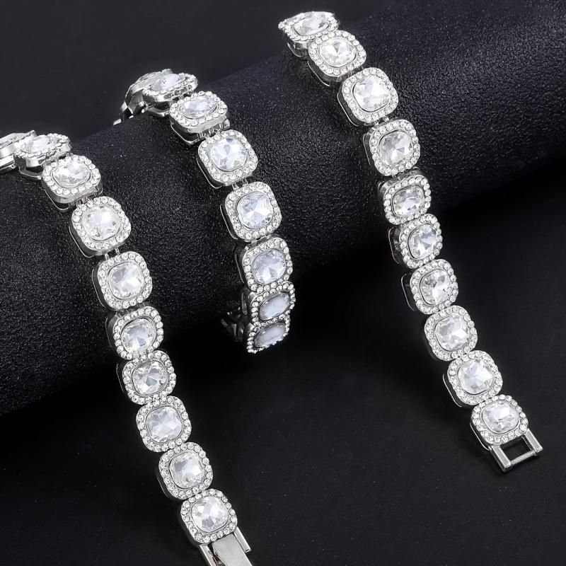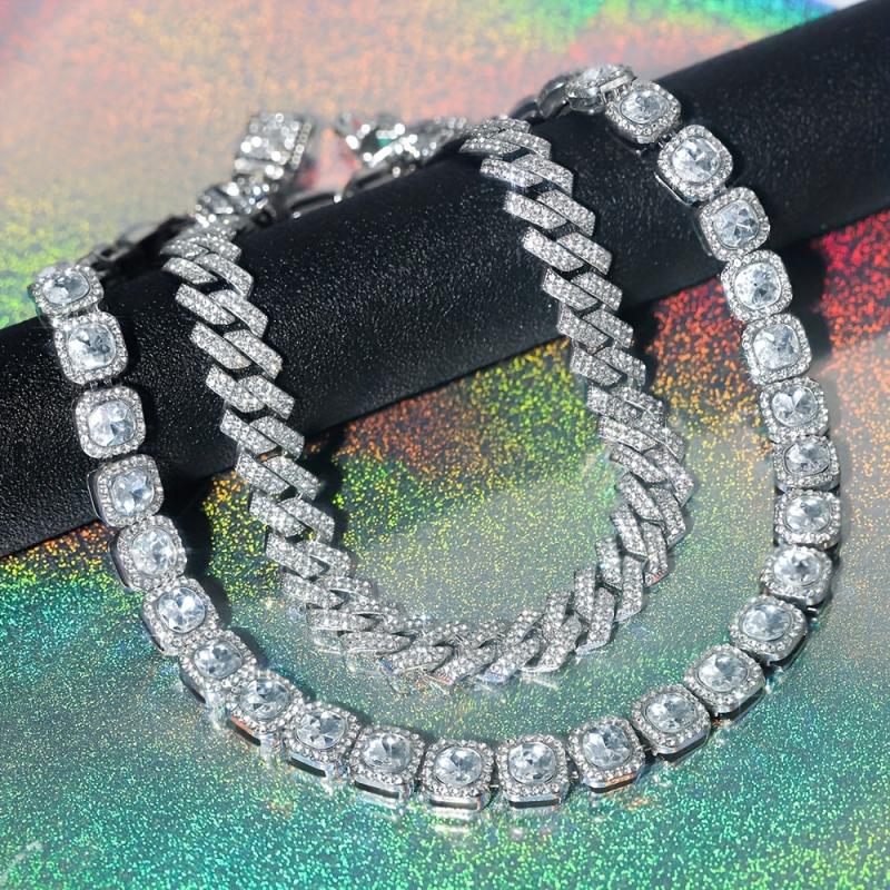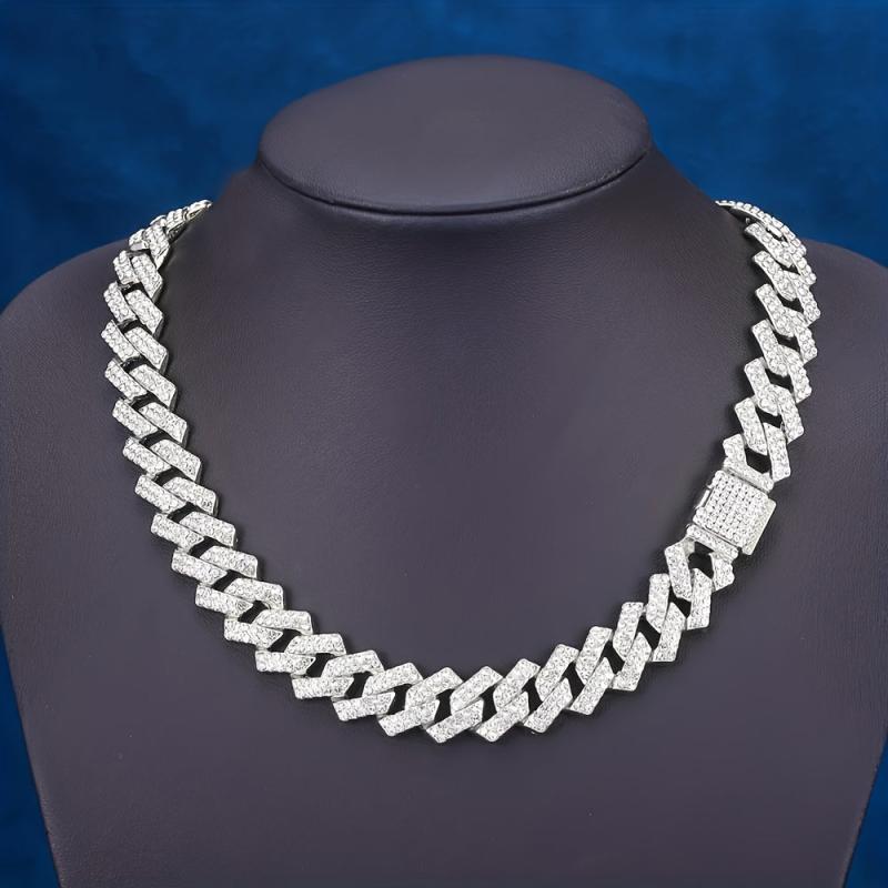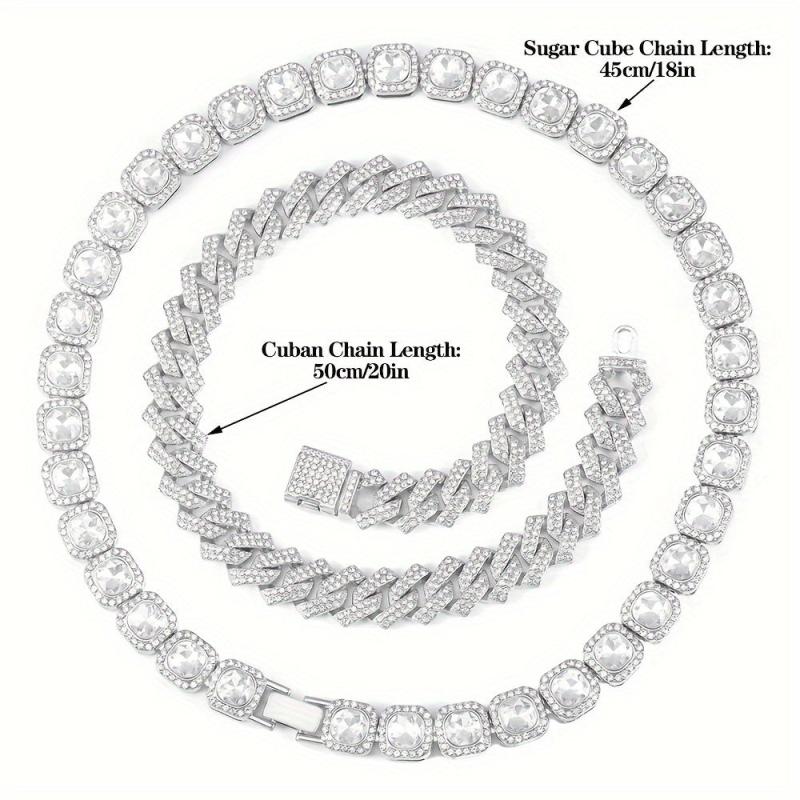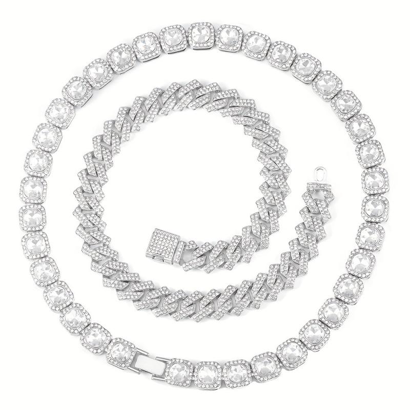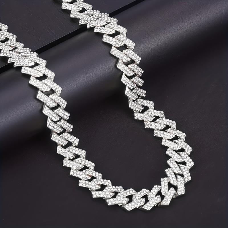 Elevate your style with this glamorous choker necklace set featuring silvery rhinestone inlay on a Cuban chain. Made of plated K zinc alloy, this hip hop punk jewelry is perfect for parties and makes a great gift for men.