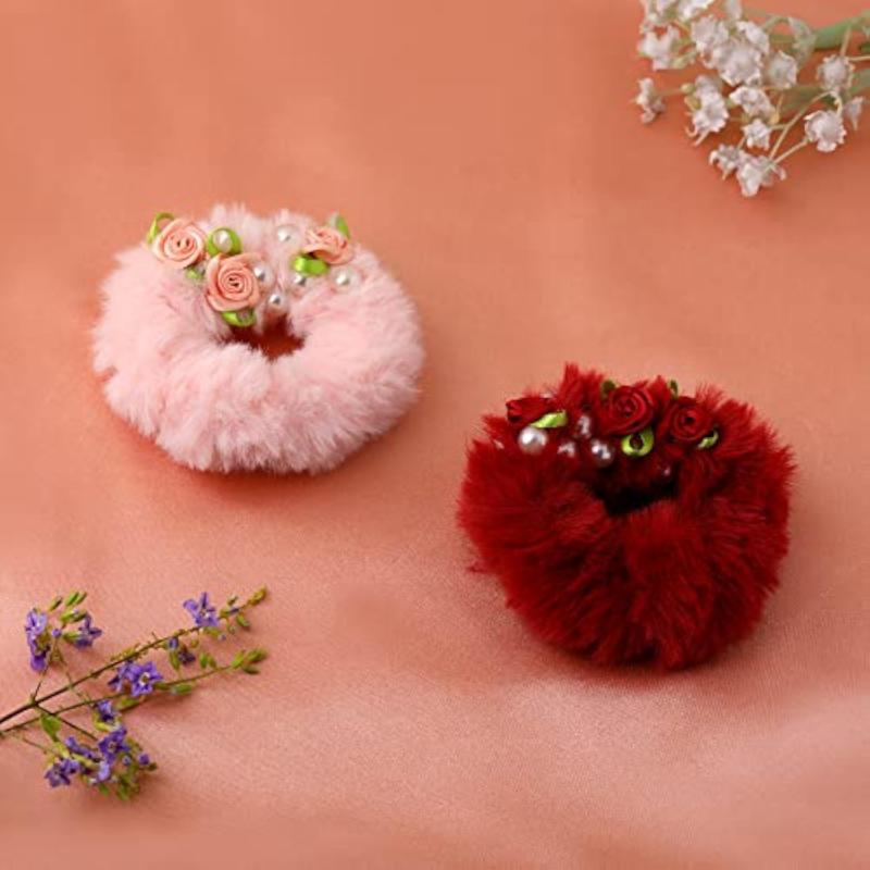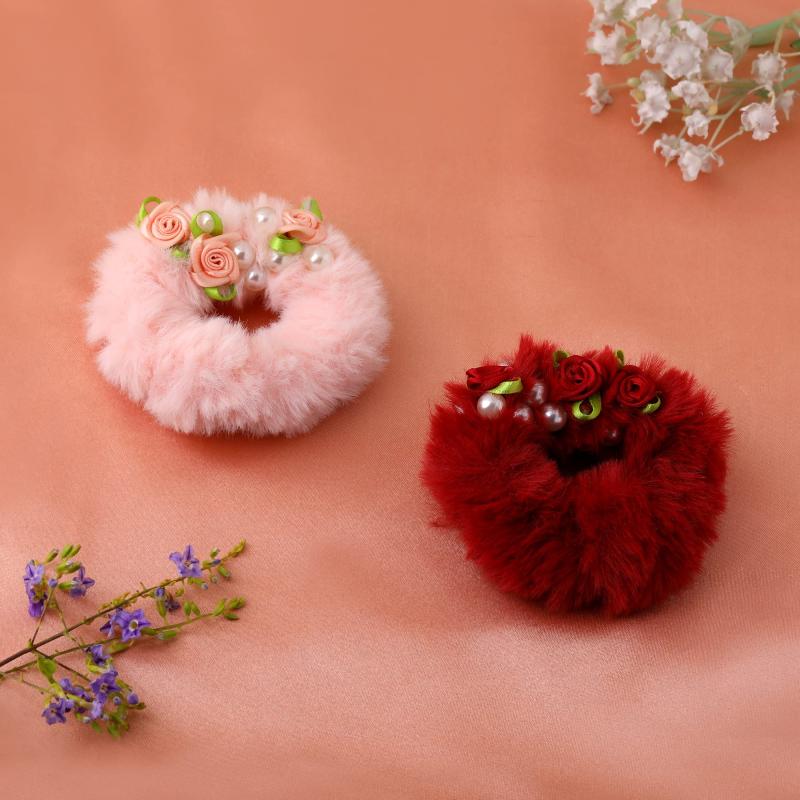 Fluffy Fur Pearls & Rose Rubber Bands for Women