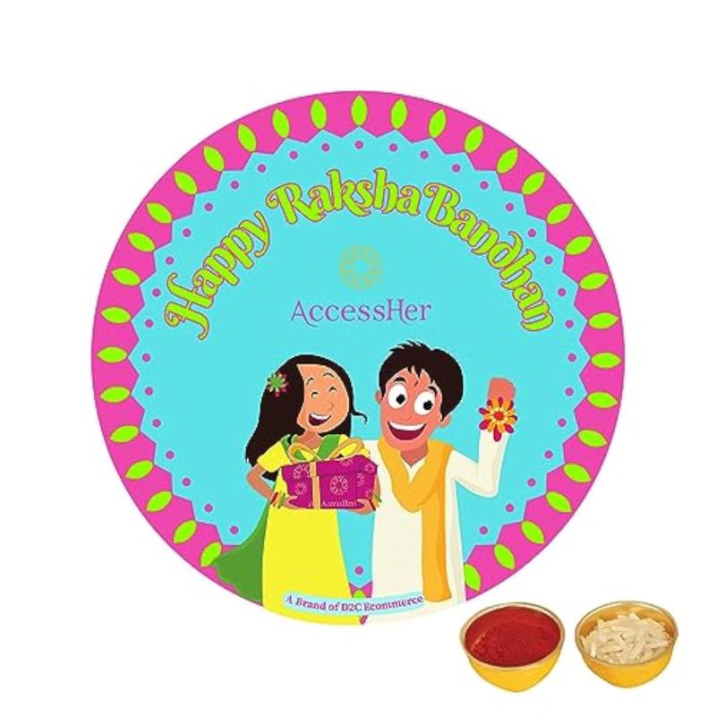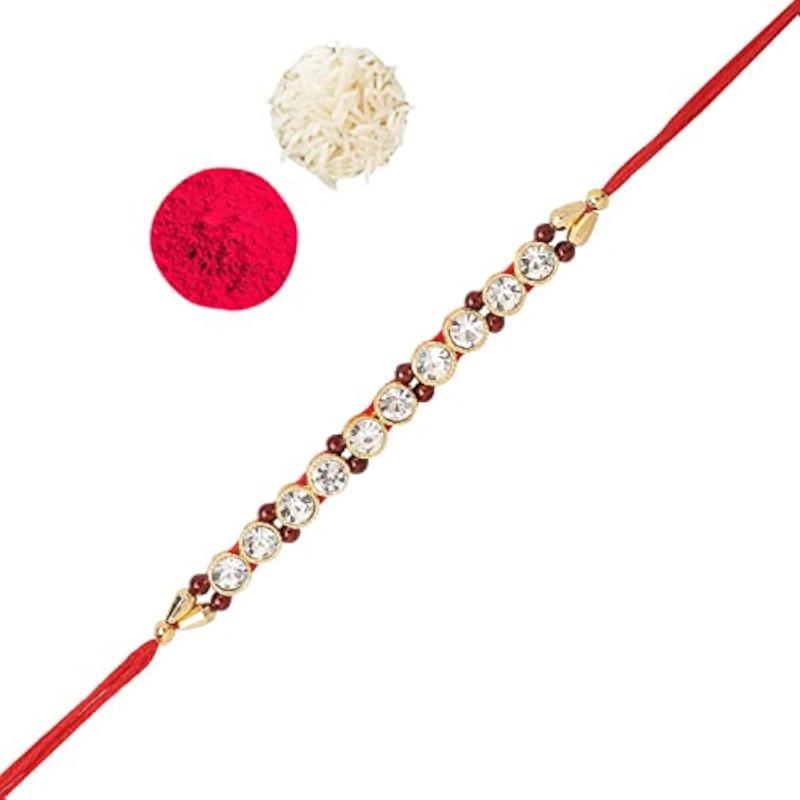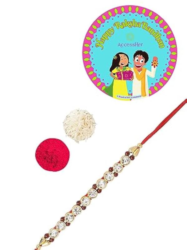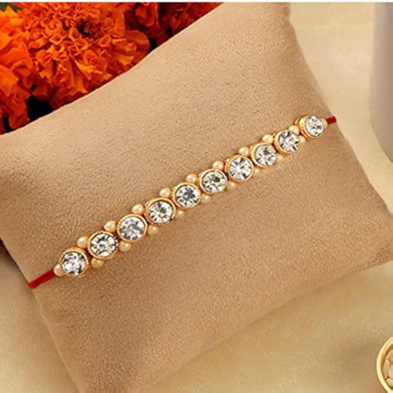 Celebrate Rakshabandhan with this elegant studded Rakhi adorned with pearls, comes with roli kumkum packets and a Happy Rakshabandhan card.