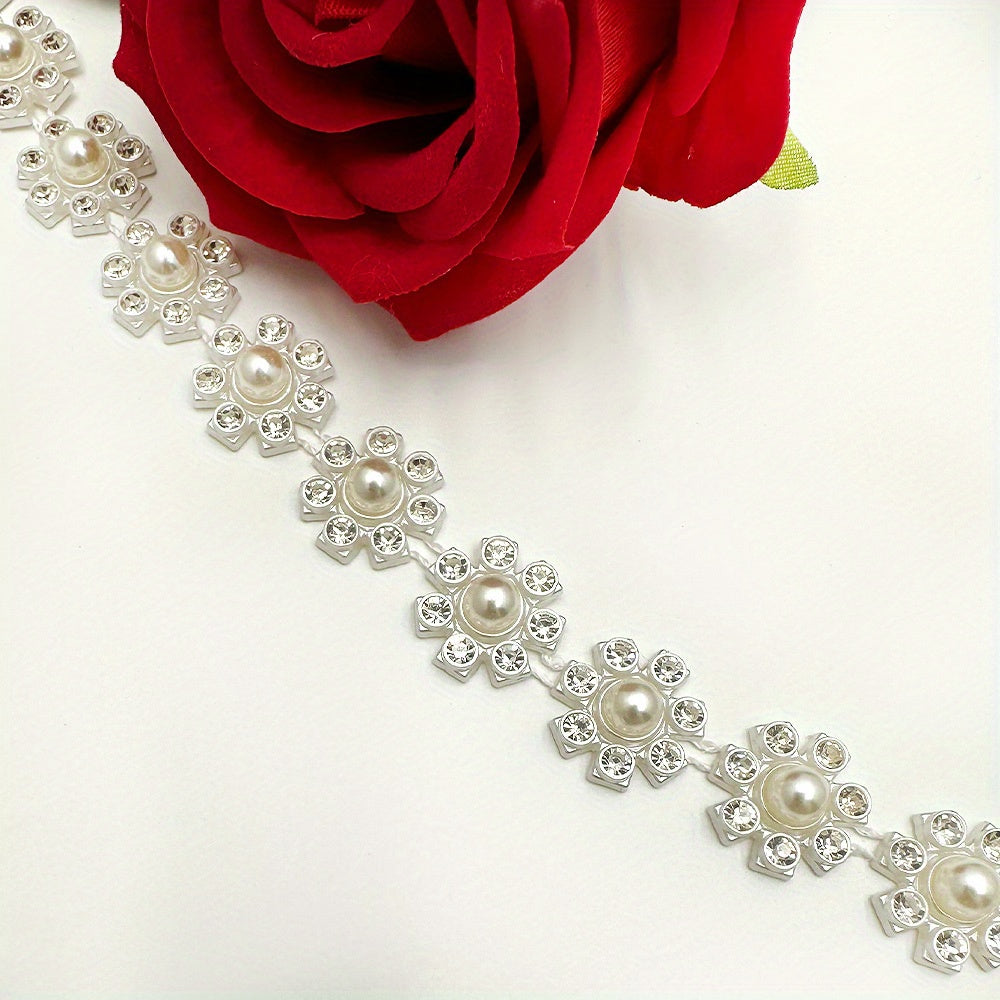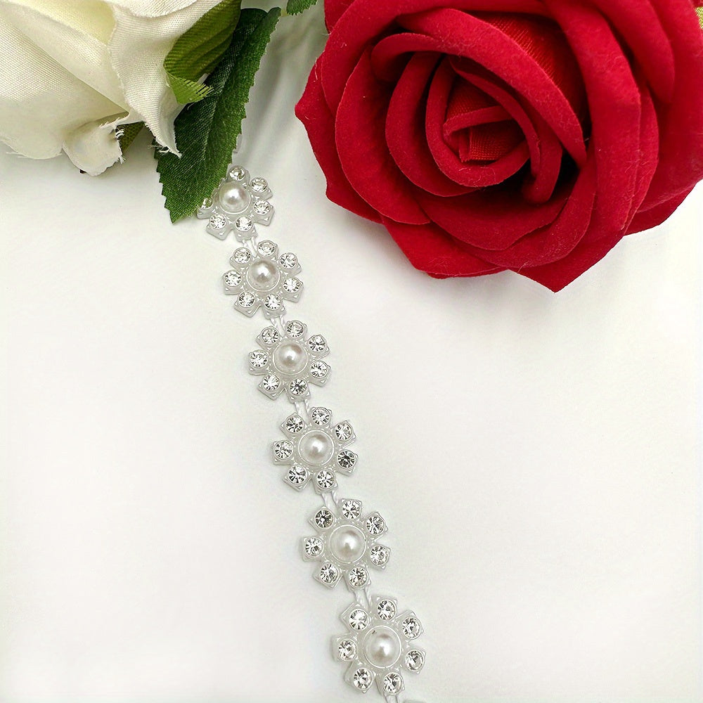 Elegant flat bottom faux pearl rhinestone chain for DIY projects like headdress, bracelet, wedding dress decoration. Can be easily cut to desired length.