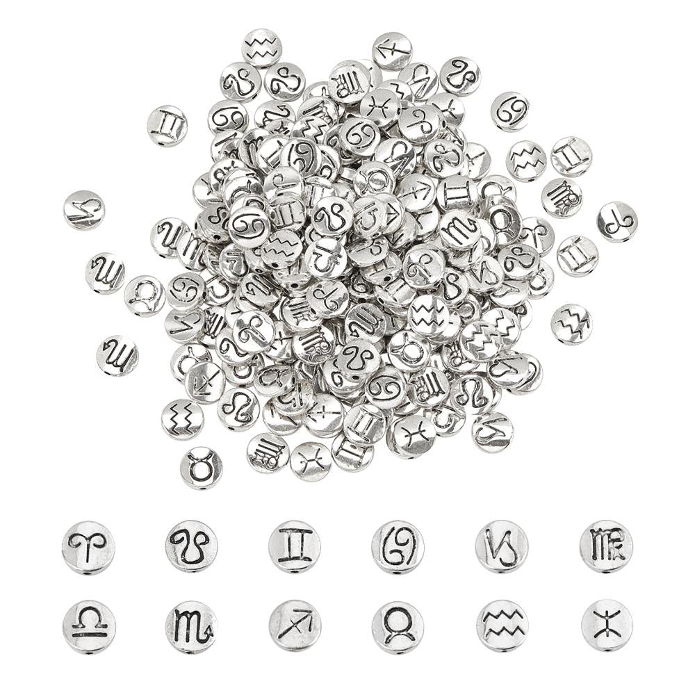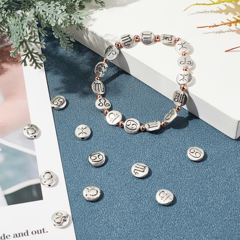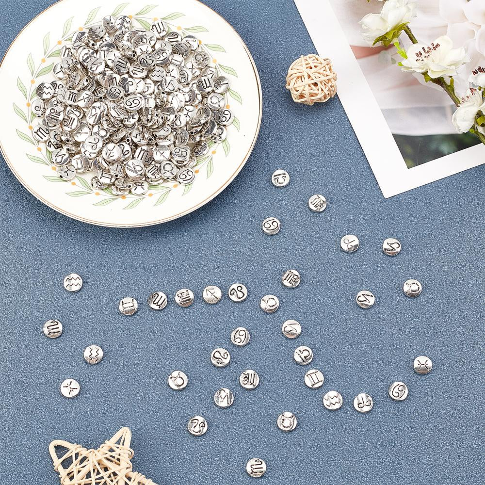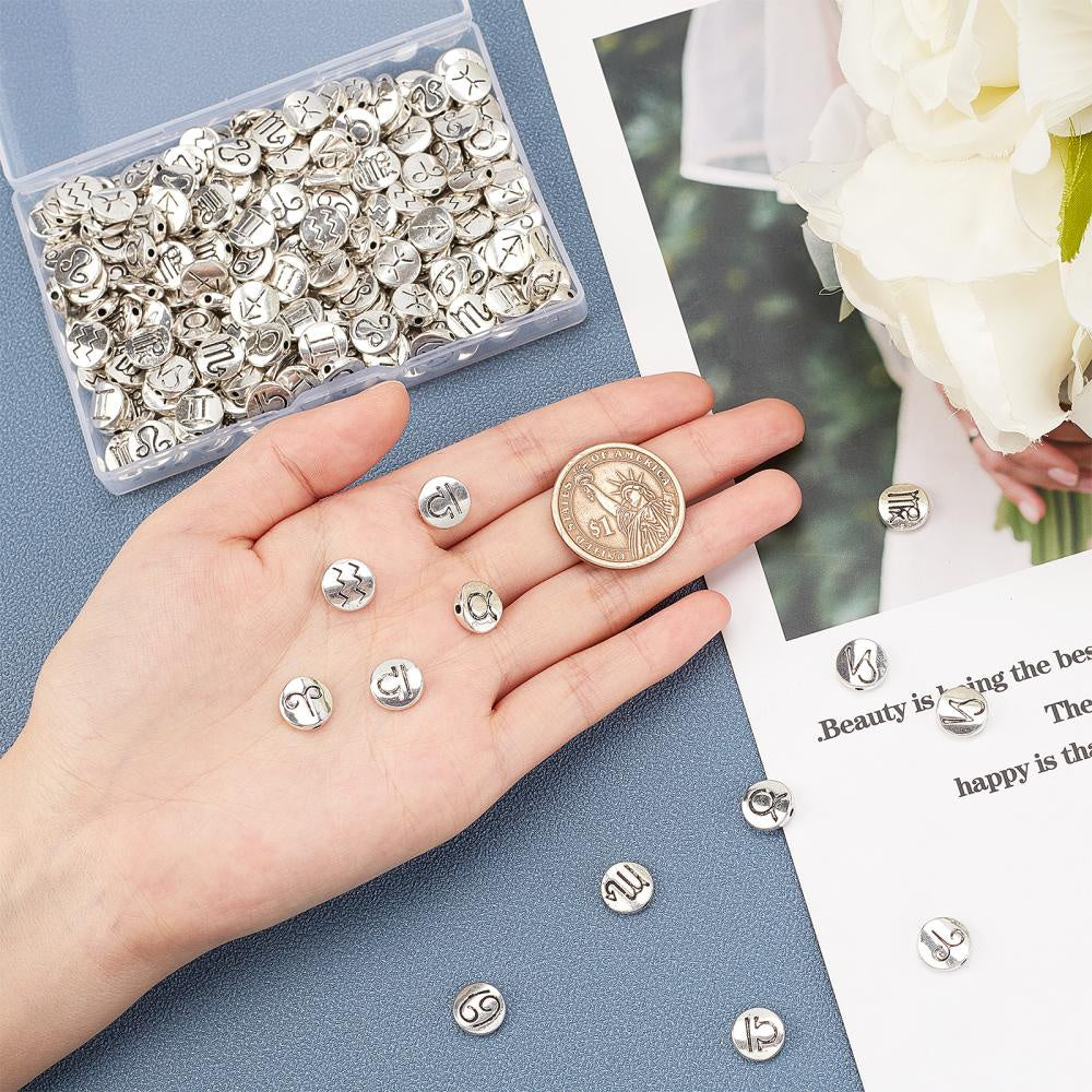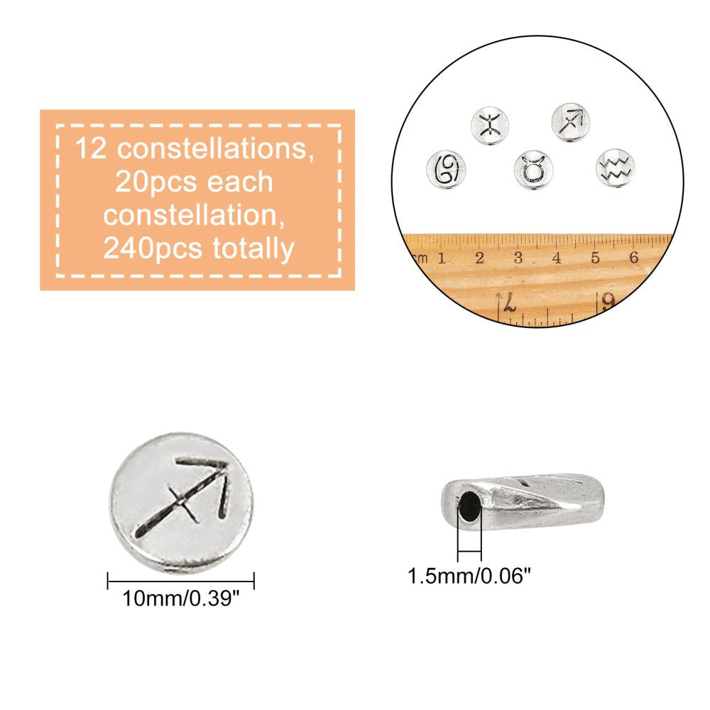 This package contains 240 flat round alloy beads with constellation zodiac sign patterns, suitable for creating earrings, bracelets, necklaces, and various accessories. They are lead and cadmium-free.