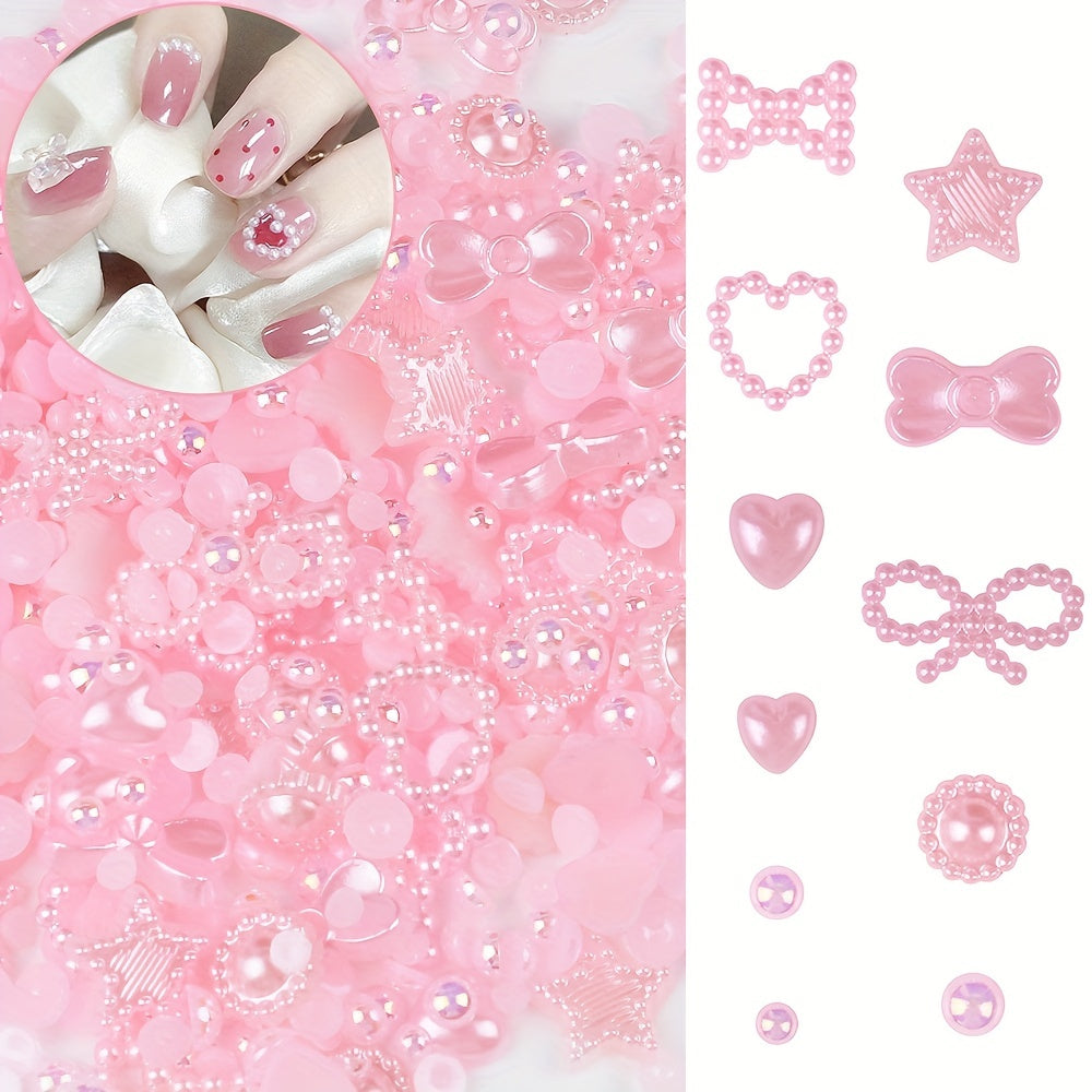 Add a touch of glamour to your nail art with this set of 550 pink pearly heart, star, and bowknot shaped charms. These flatback assorted charms come in various sizes and are perfect for creating unique nail designs.