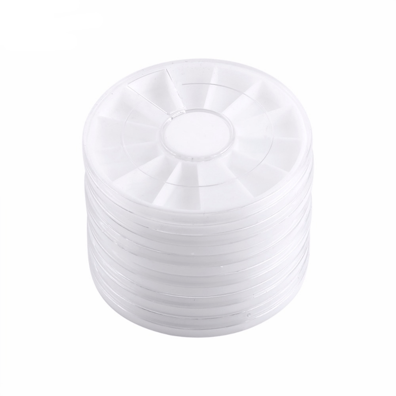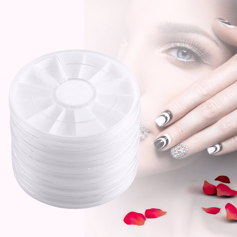 This set includes 5 plastic storage cases with 12 grids each, shaped like wheels. Perfect for storing nail art accessories, jewelry, and other small items. Keep your items organized and easily accessible with these handy cases.