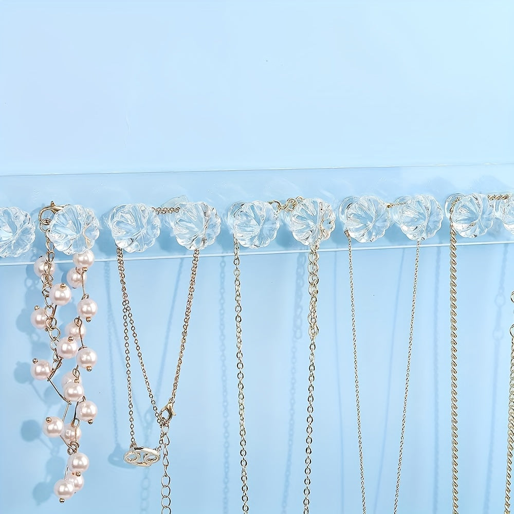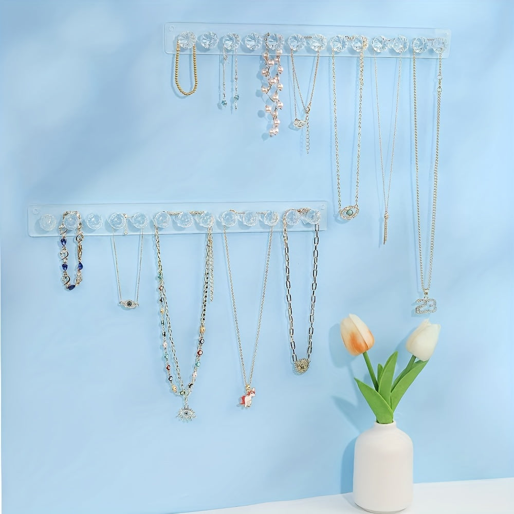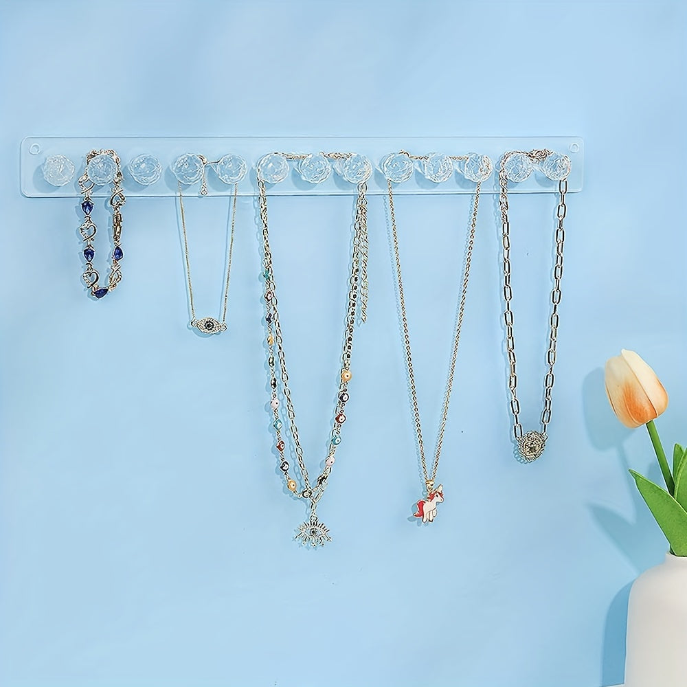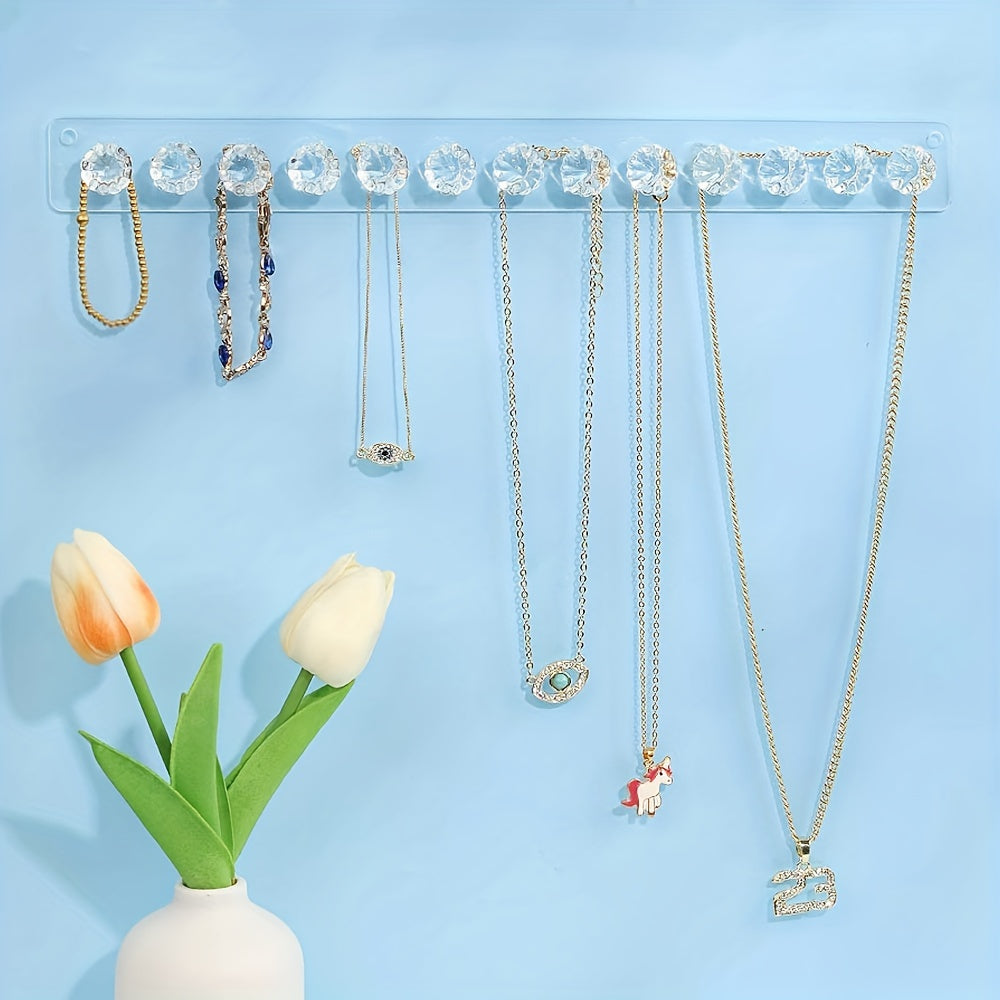 Organize your necklaces and bracelets with this transparent acrylic wall-mounted jewelry rack. It features 13 hooks for easy storage and display of your jewelry accessories.
