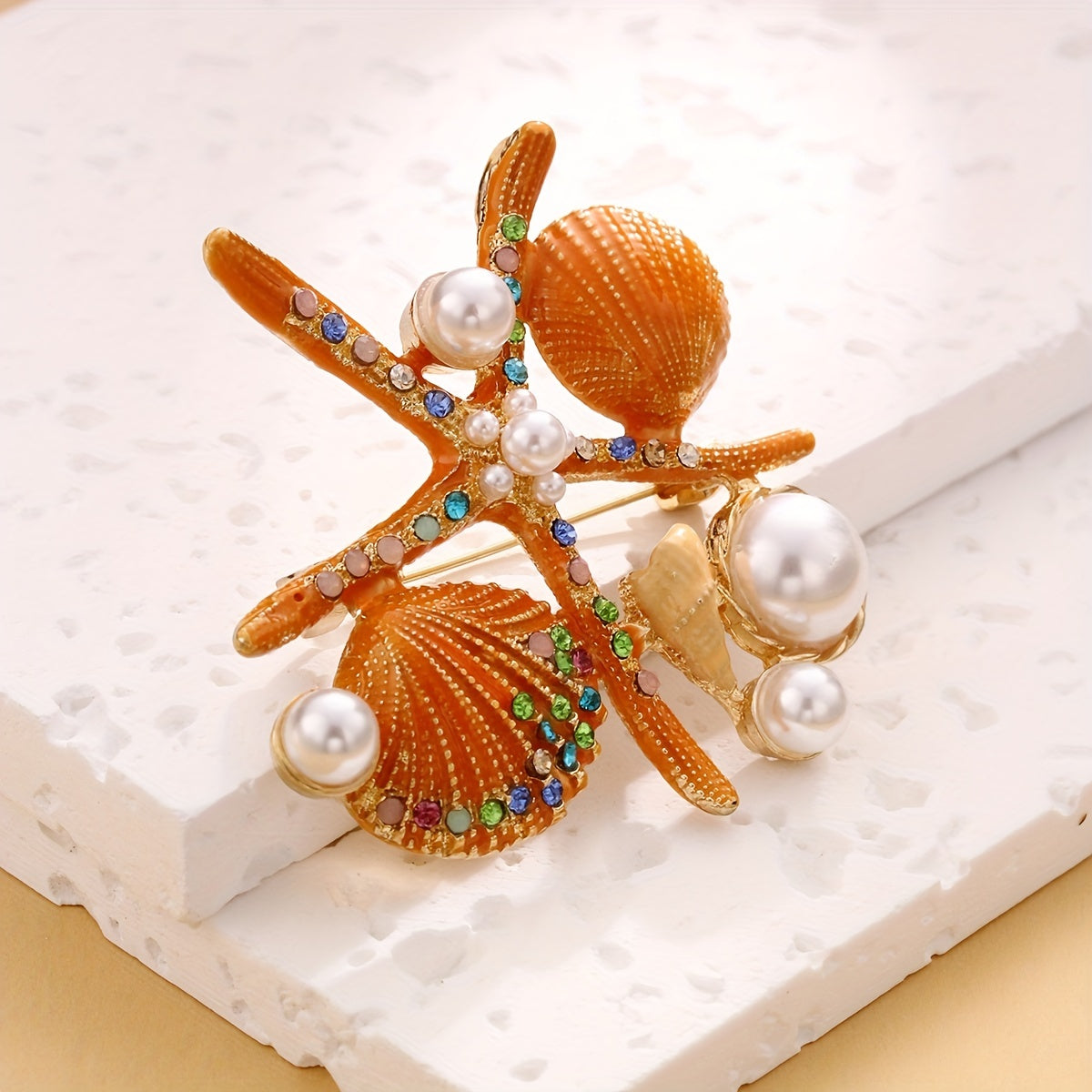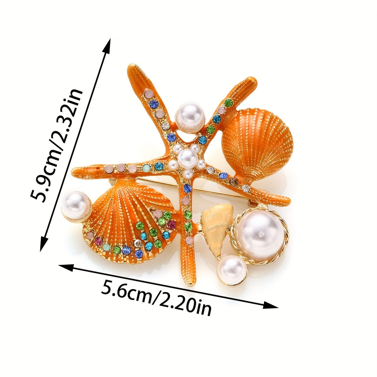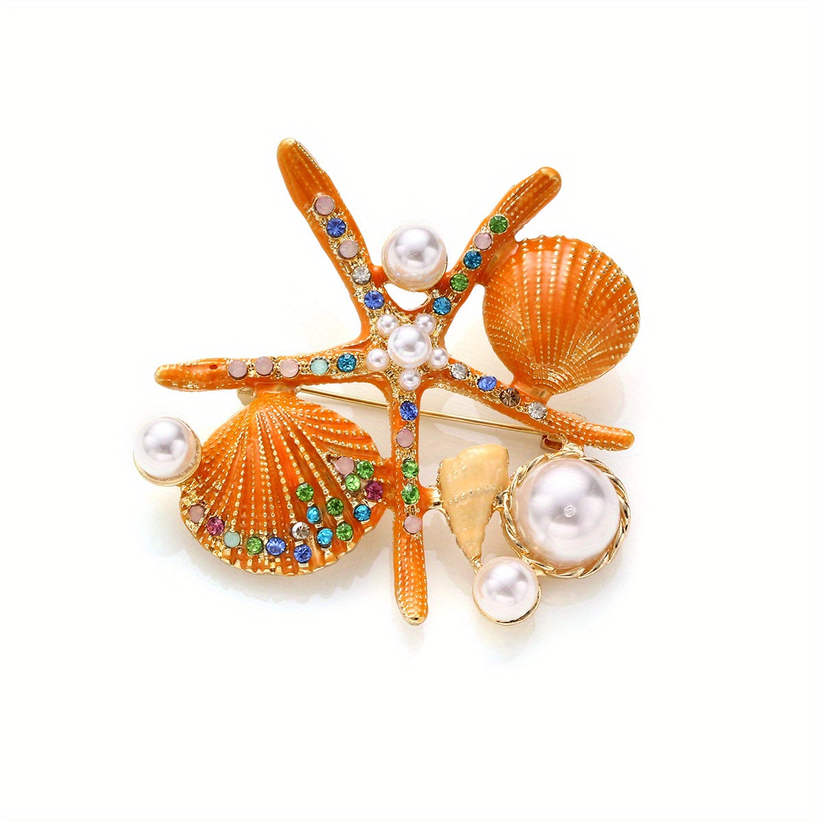 Add a touch of beach elegance with this starfish and conch brooch pin featuring inlaid rhinestones. Perfect accessory for a summer day at the beach.