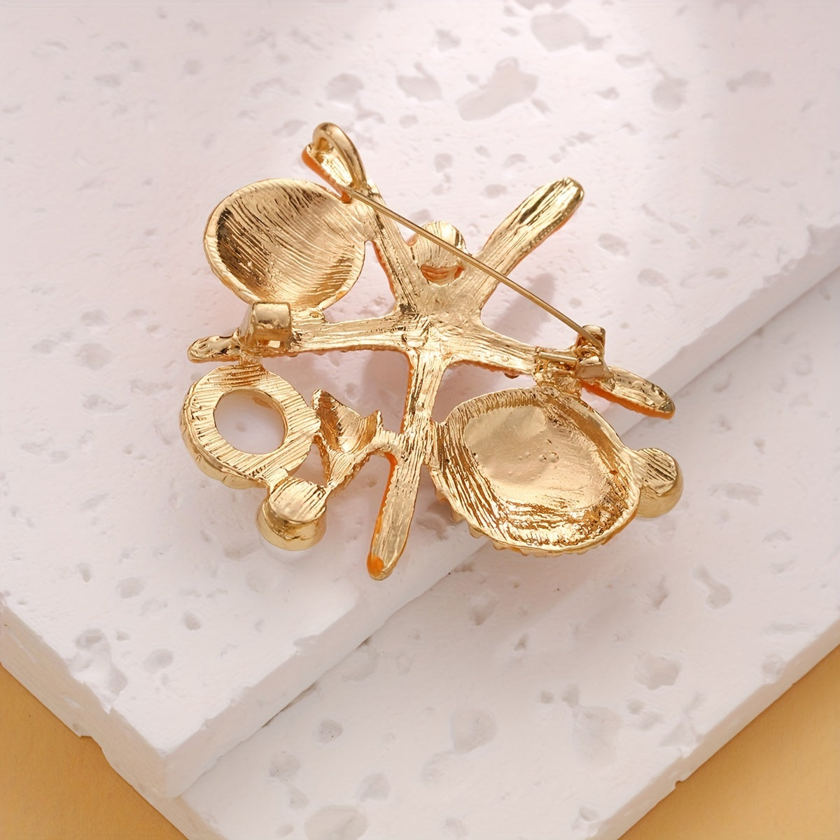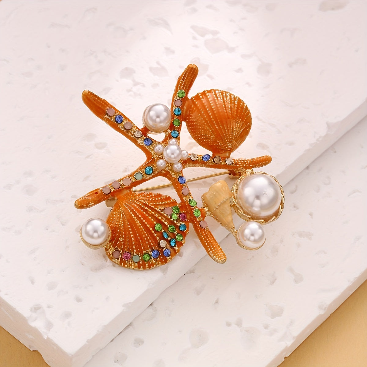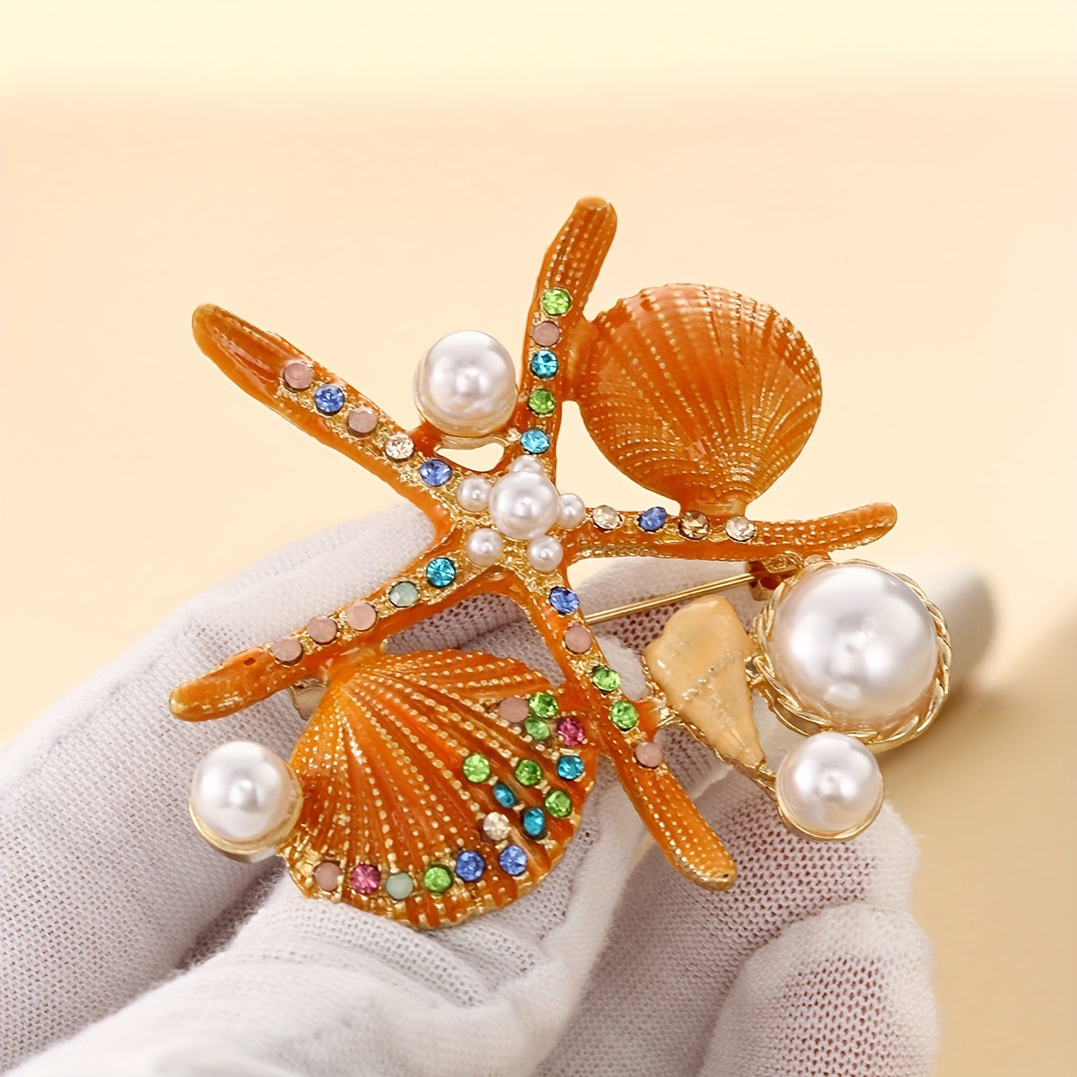 Add a touch of beach elegance with this starfish and conch brooch pin featuring inlaid rhinestones. Perfect accessory for a summer day at the beach.