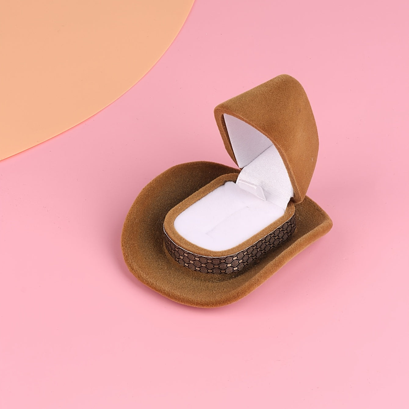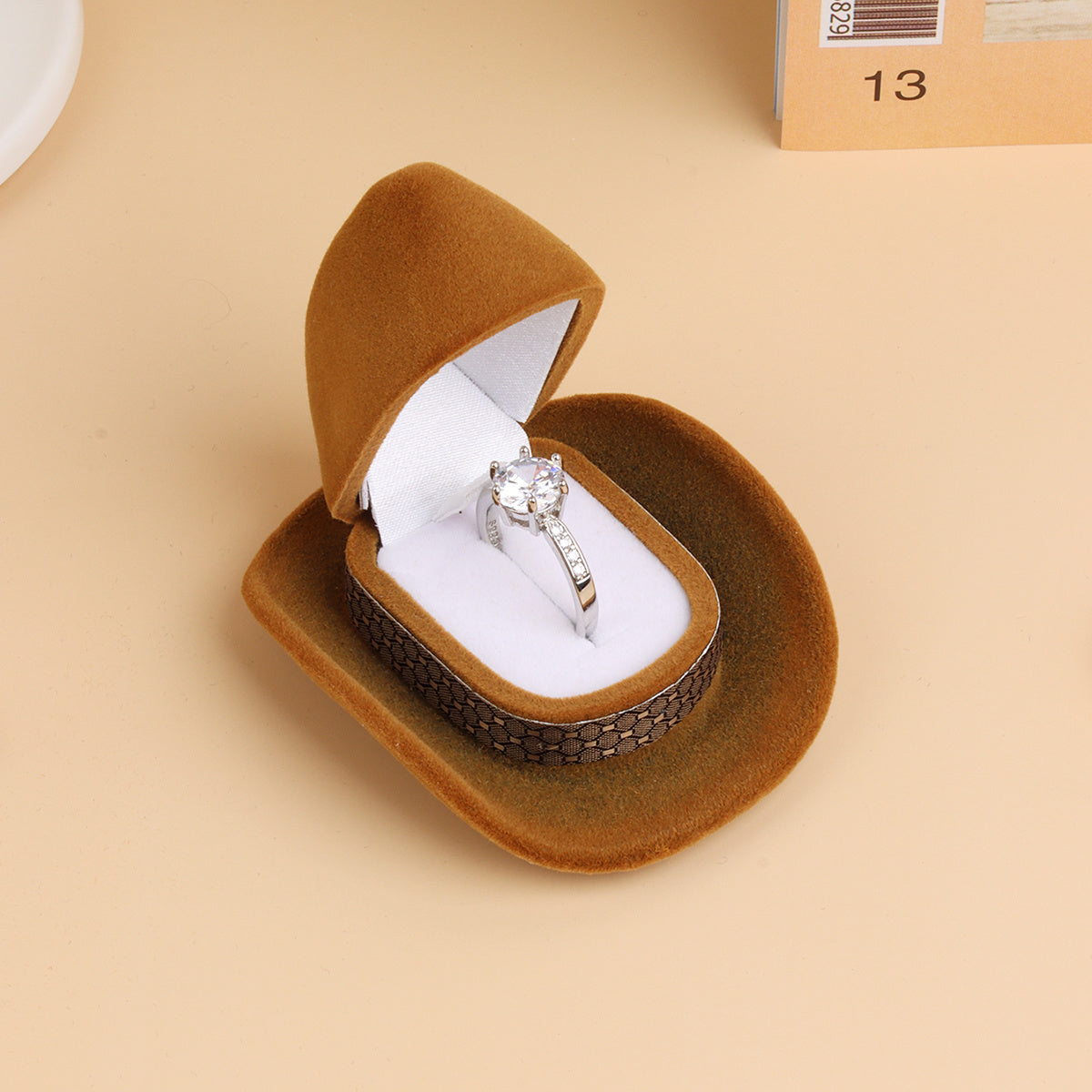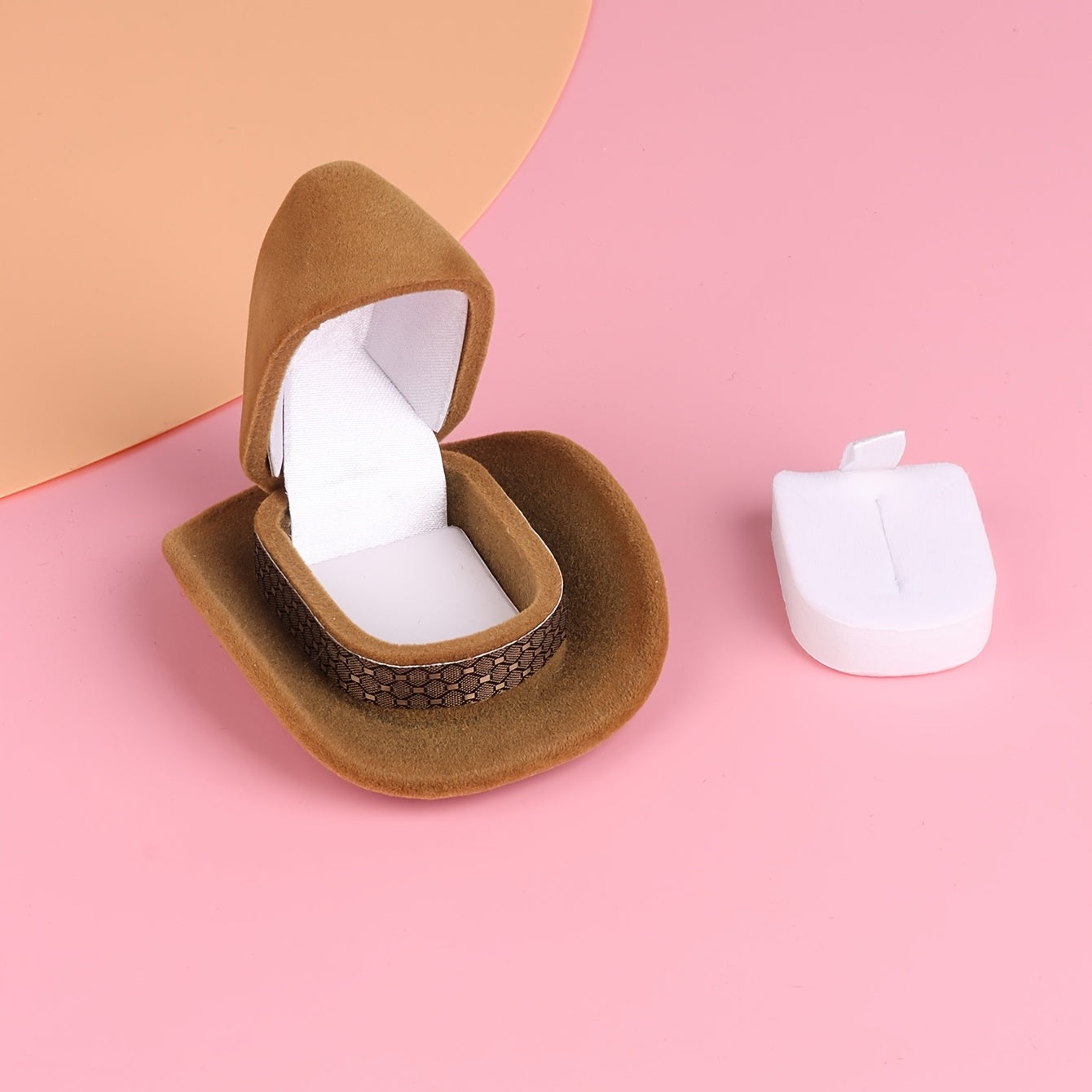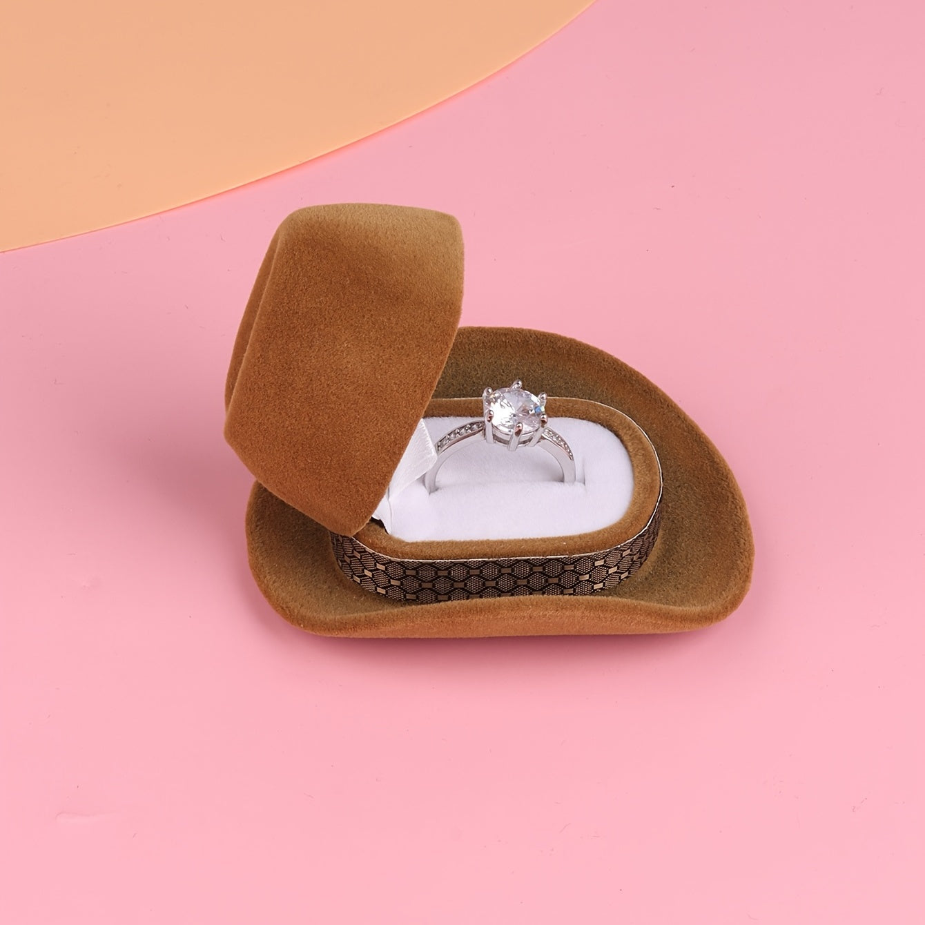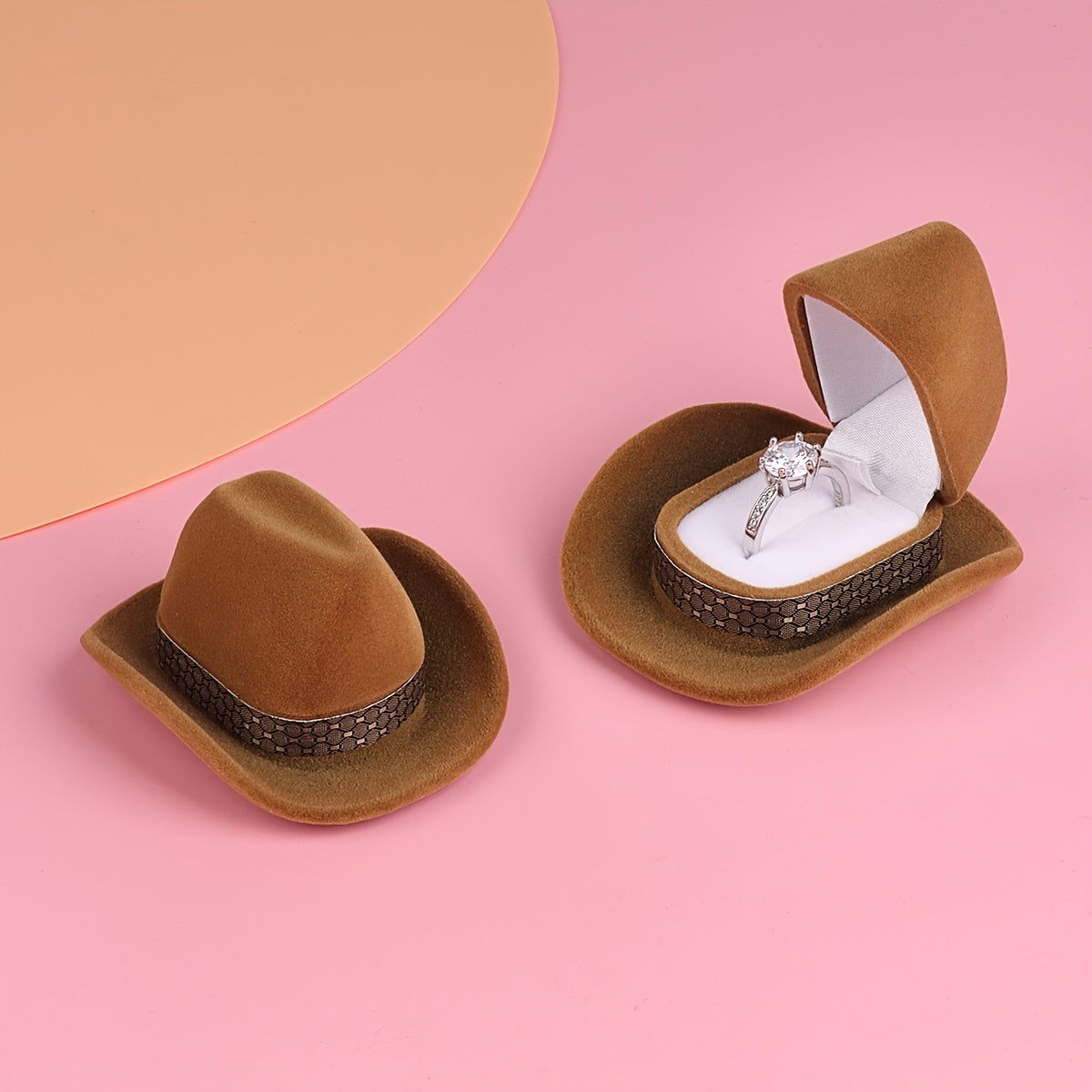 This creative ring box features a retro American Western cowboy hat design. It adds a unique touch to your ring presentations.