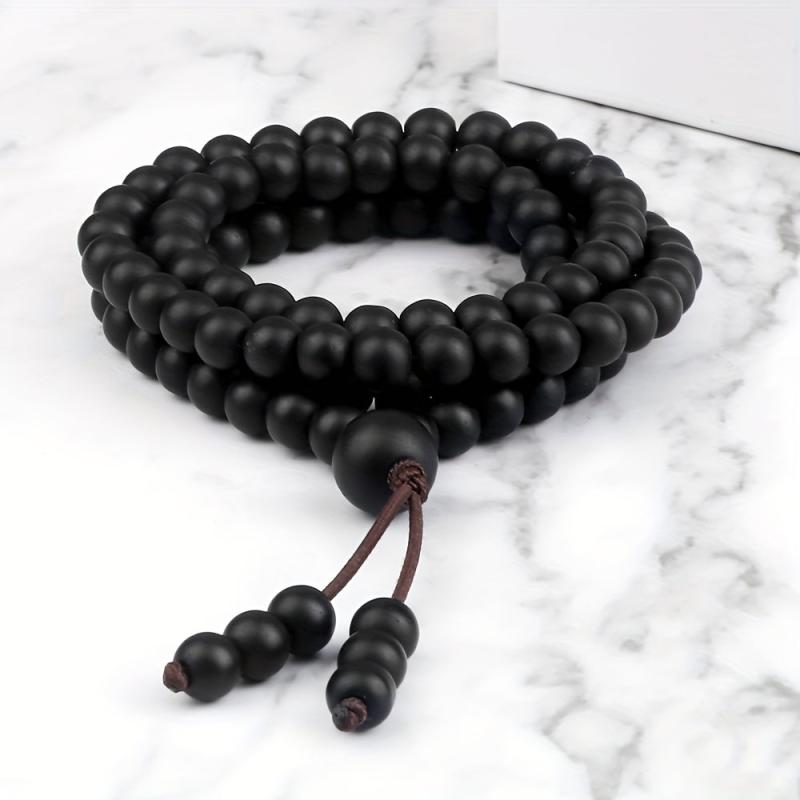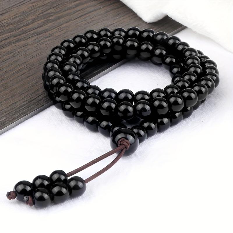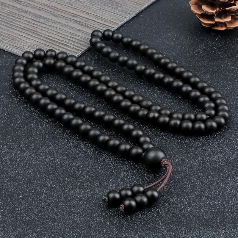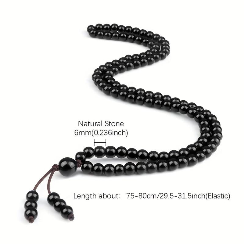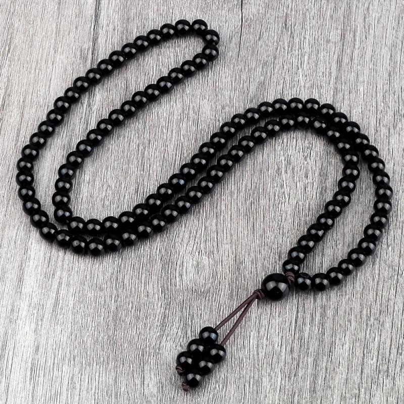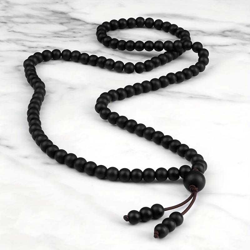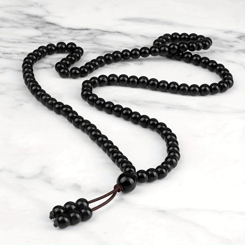 This single piece necklace is crafted from natural materials, giving it a safe and unique charm. It features 108 beads made of natural stones, making it a stylish addition to any outfit.