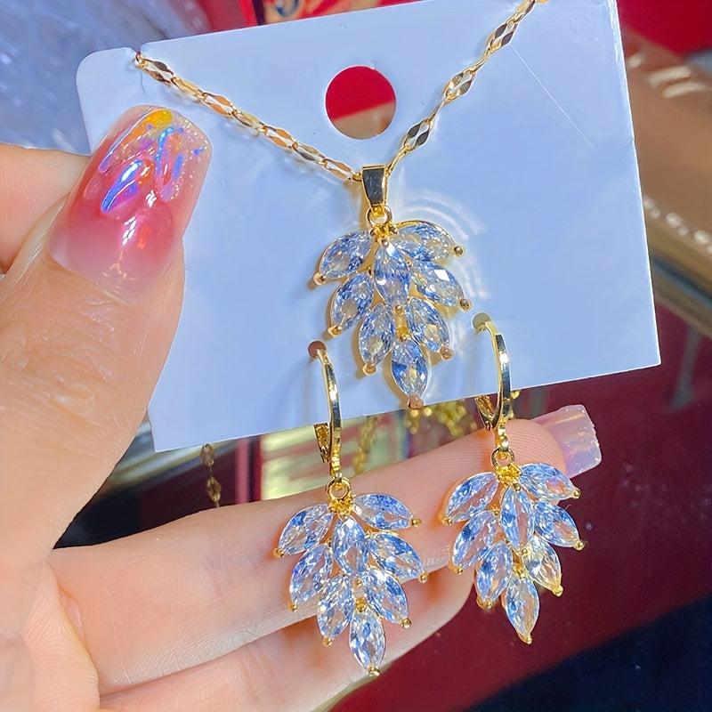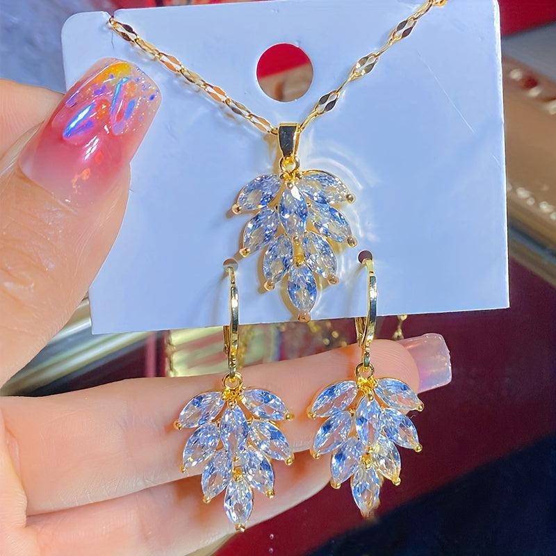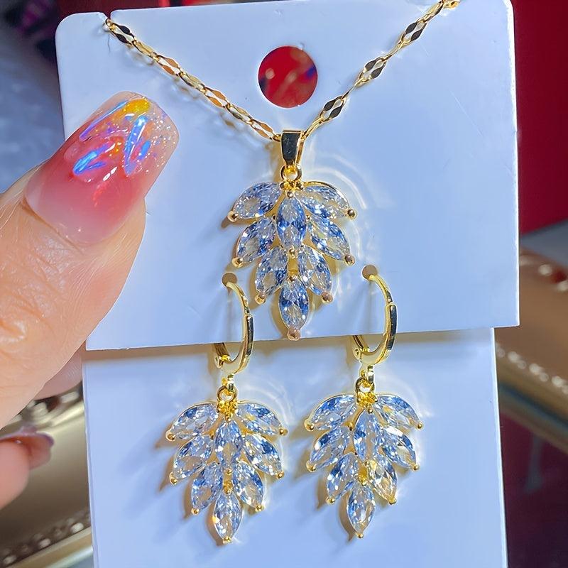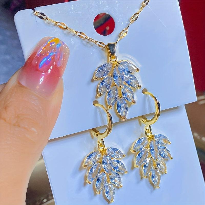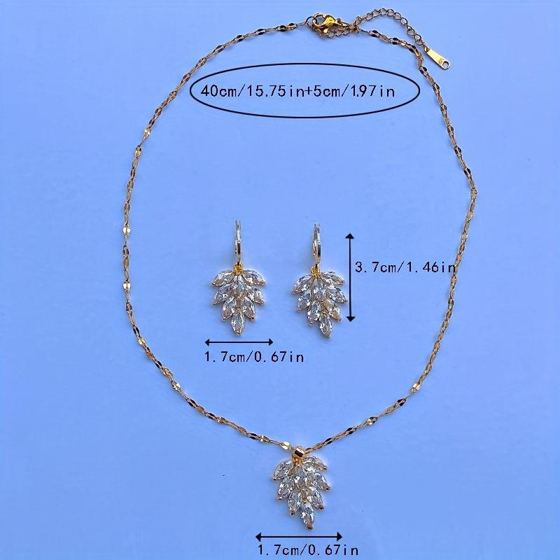 Elegantly designed 3-piece jewelry set featuring a copper leaf necklace and matching earrings with synthetic zirconia. Perfect for daily wear.