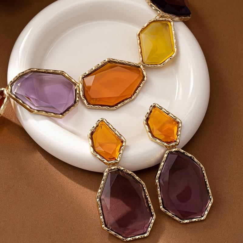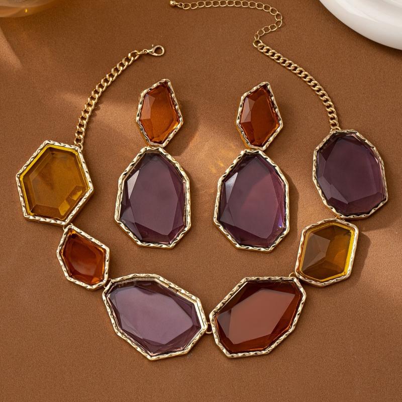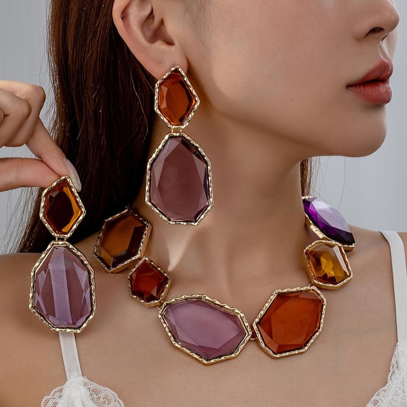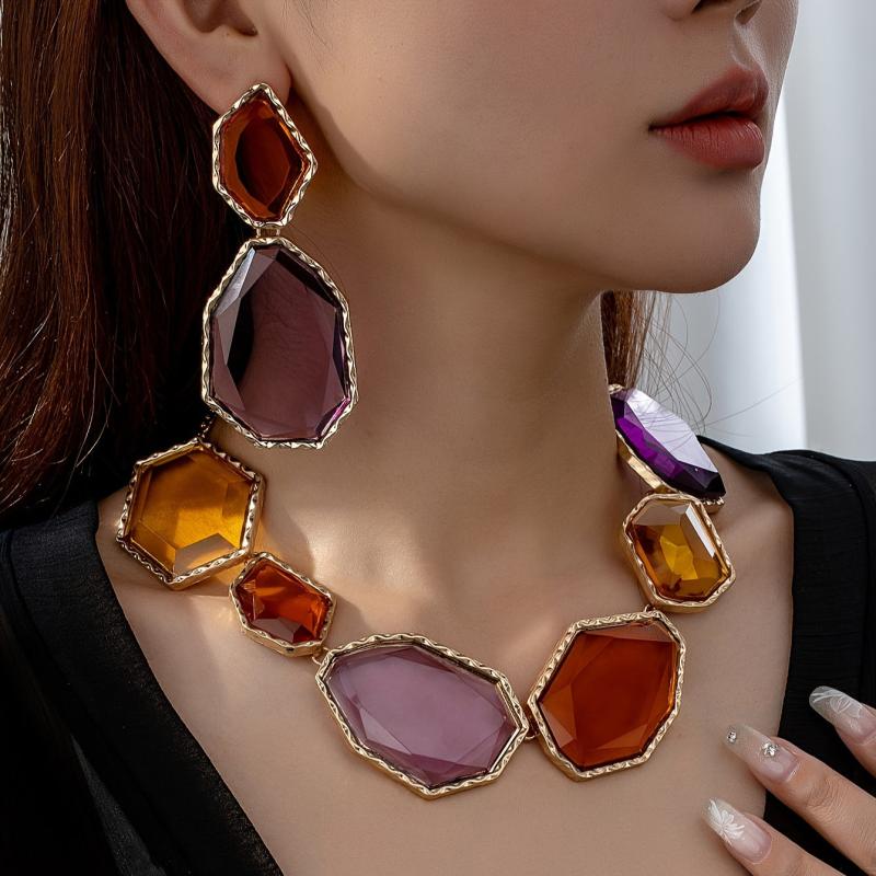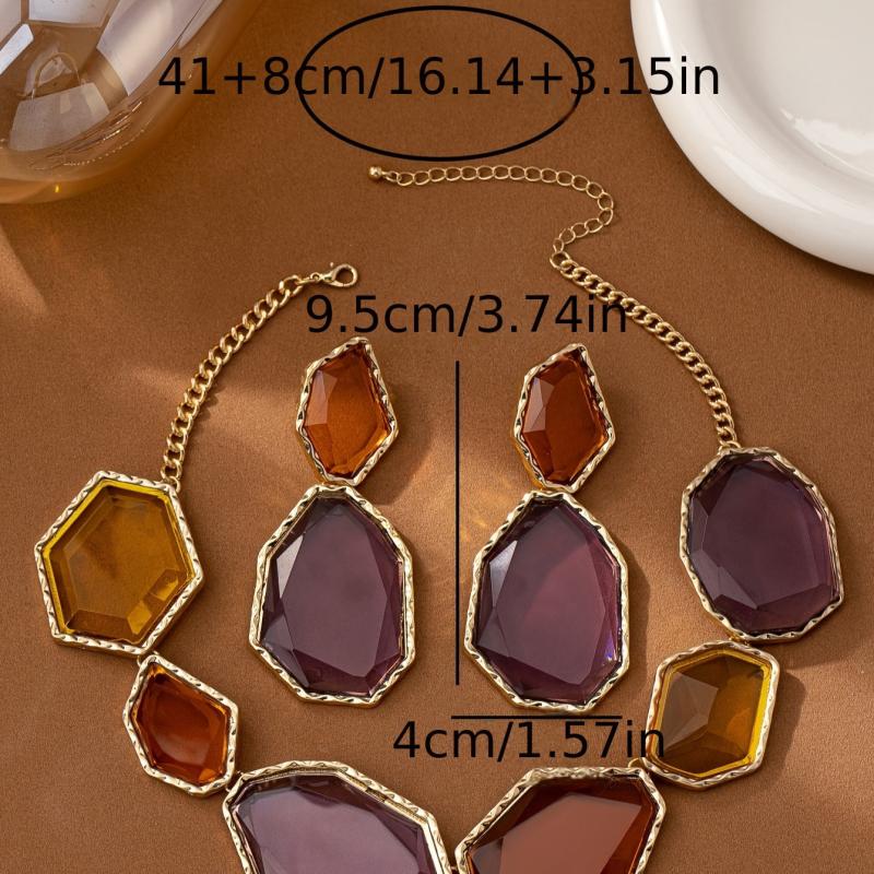 Make a bold statement with this stunning 18K gold plated necklace and earrings set featuring colorful plastic gemstones. Perfect for weddings and parties!