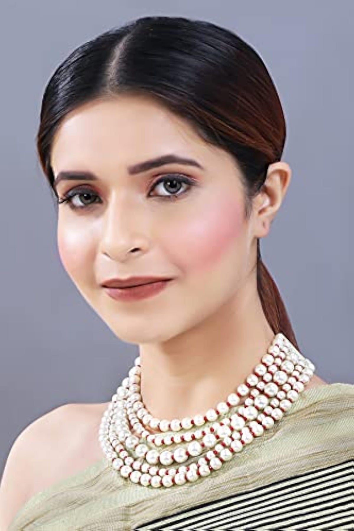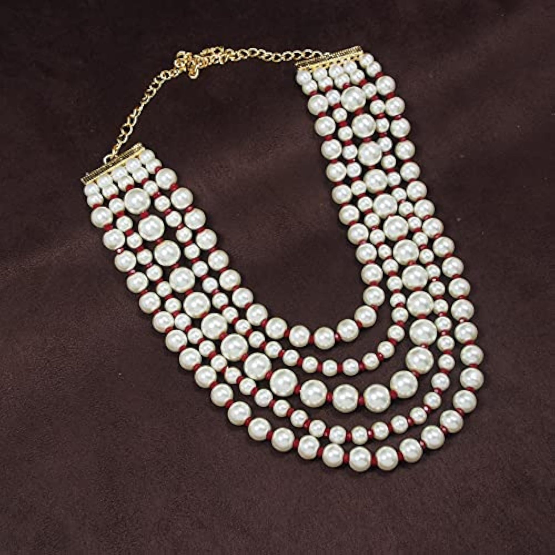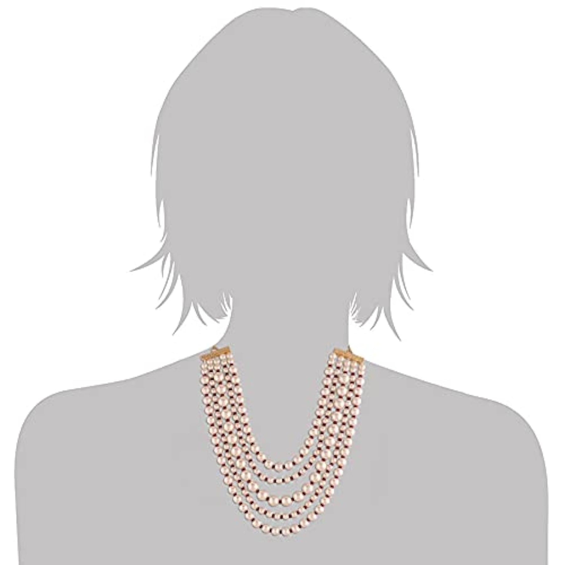Elegant and sophisticated 18k gold plated necklace set featuring 5 layers of pearl beads. Perfect for special occasions.
