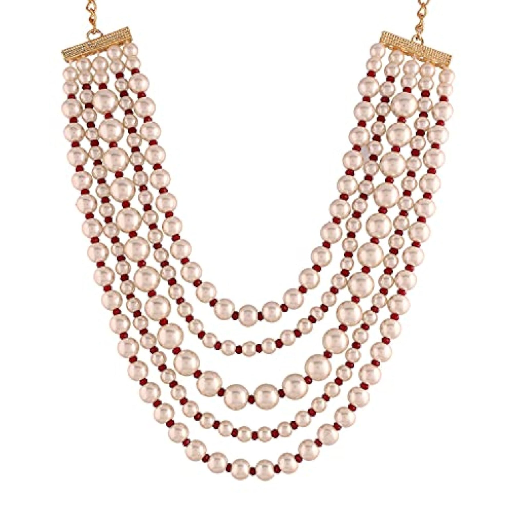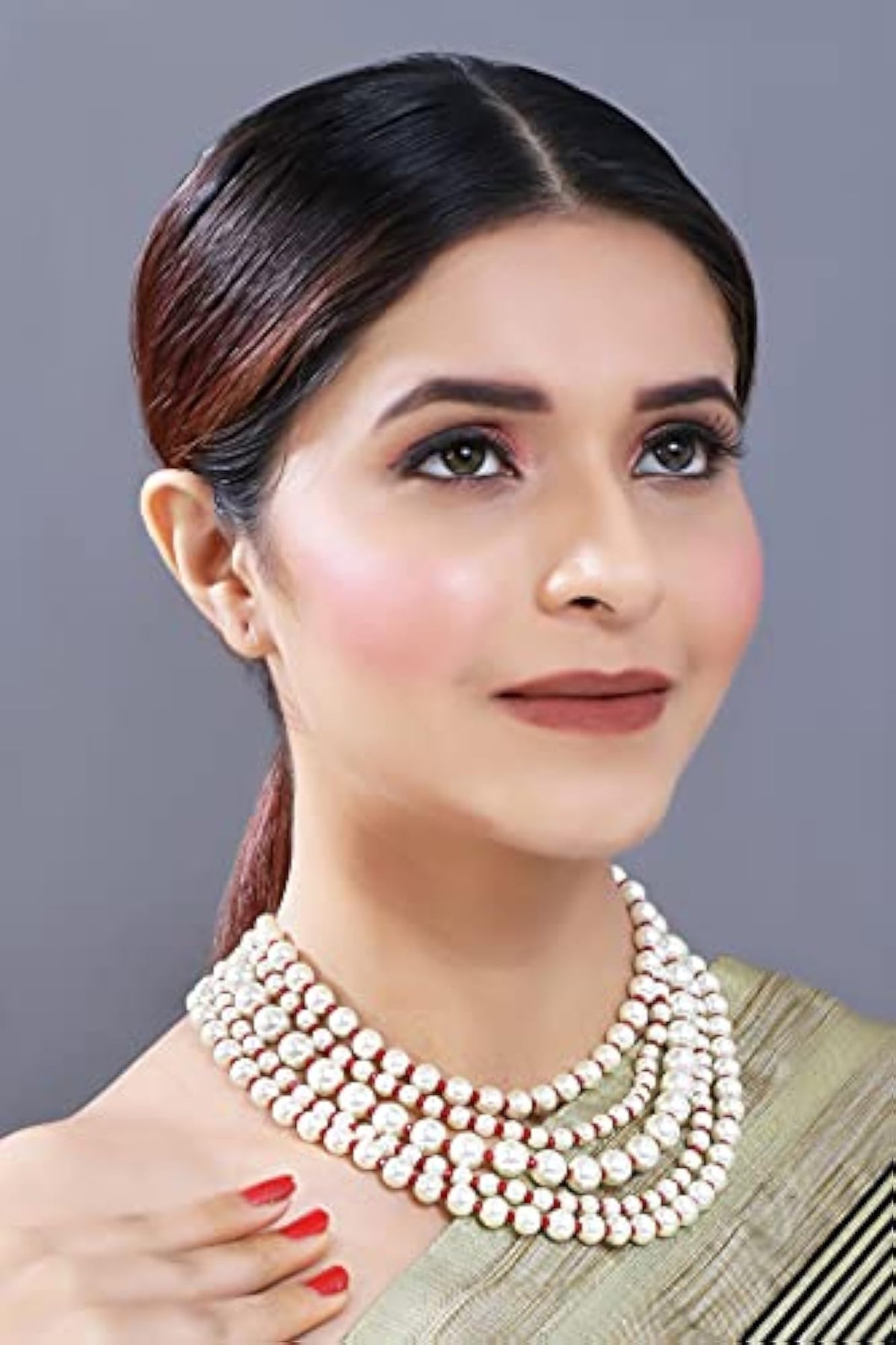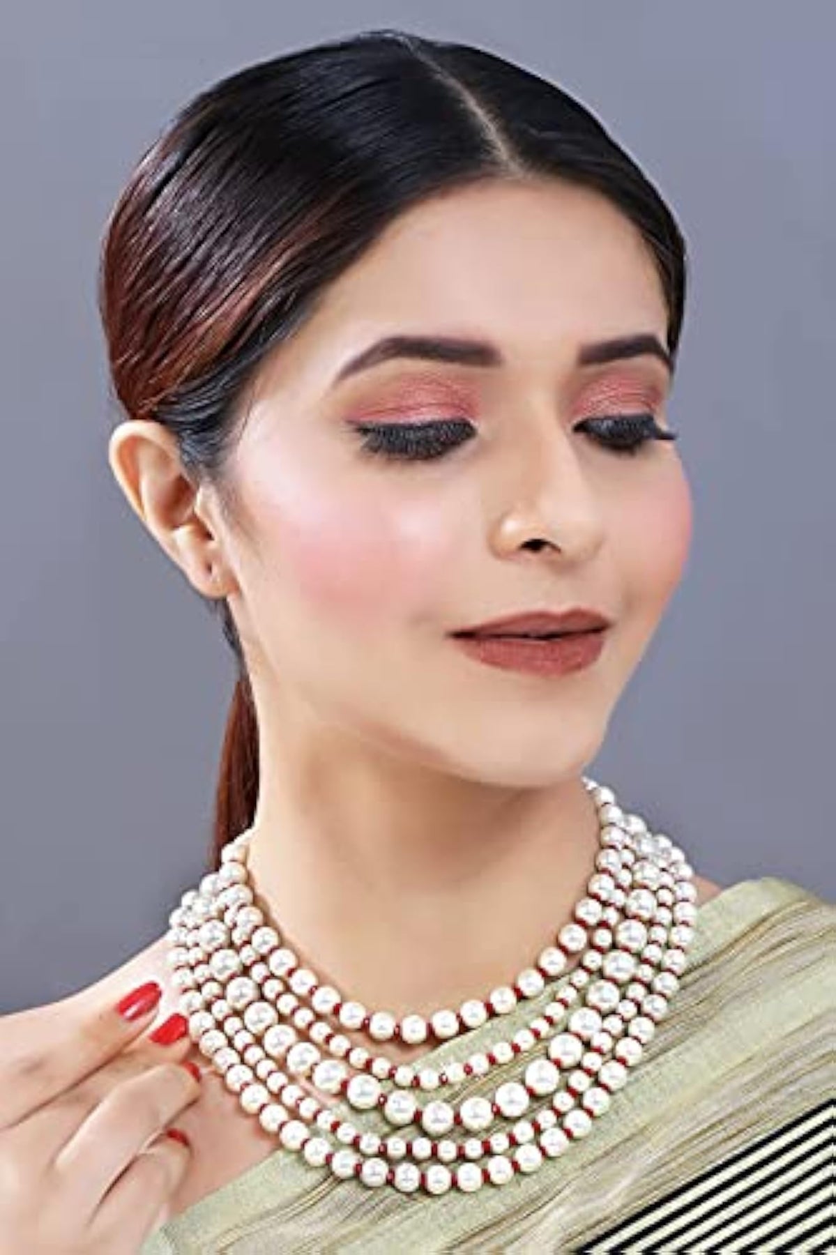 Elegant and sophisticated 18k gold plated necklace set featuring 5 layers of pearl beads. Perfect for special occasions.