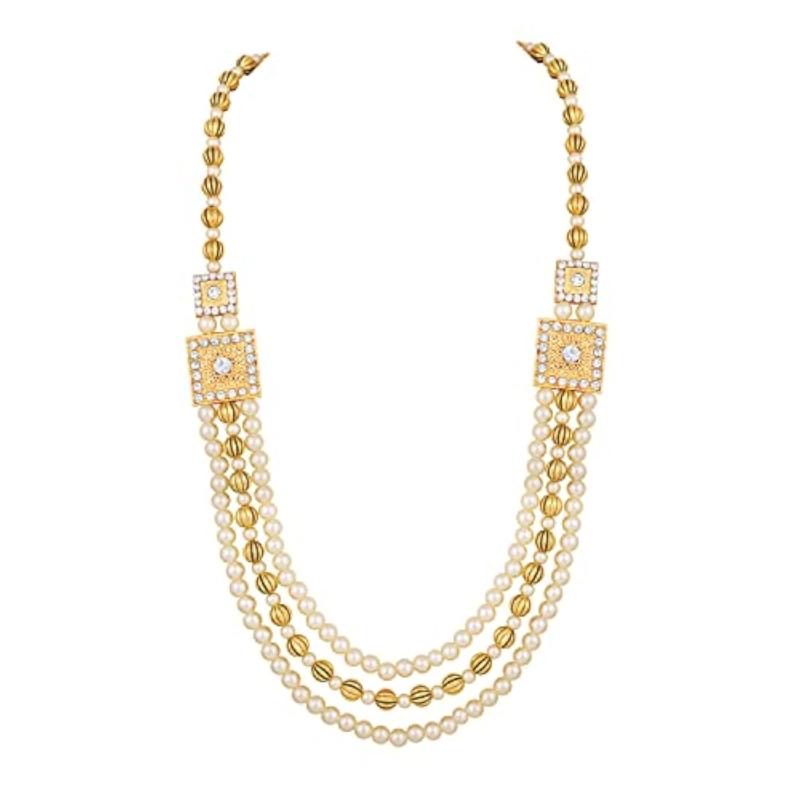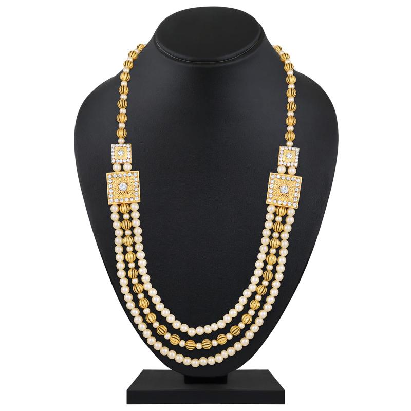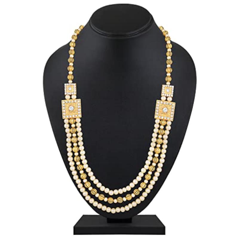 Exquisite 3-layered necklace featuring golden glass beads base with Dulha Moti design. Elevate your traditional attire with this stunning piece.
