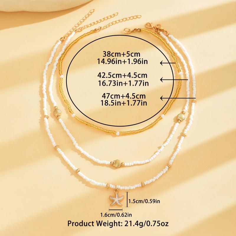 Enhance your beach vacation look with this 3-pack pendant necklace set featuring shell and starfish designs. The beaded necklaces add a whimsical touch to your outfit.