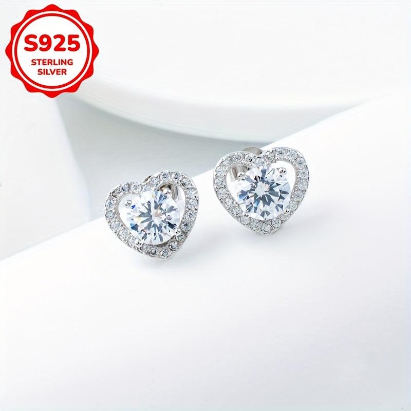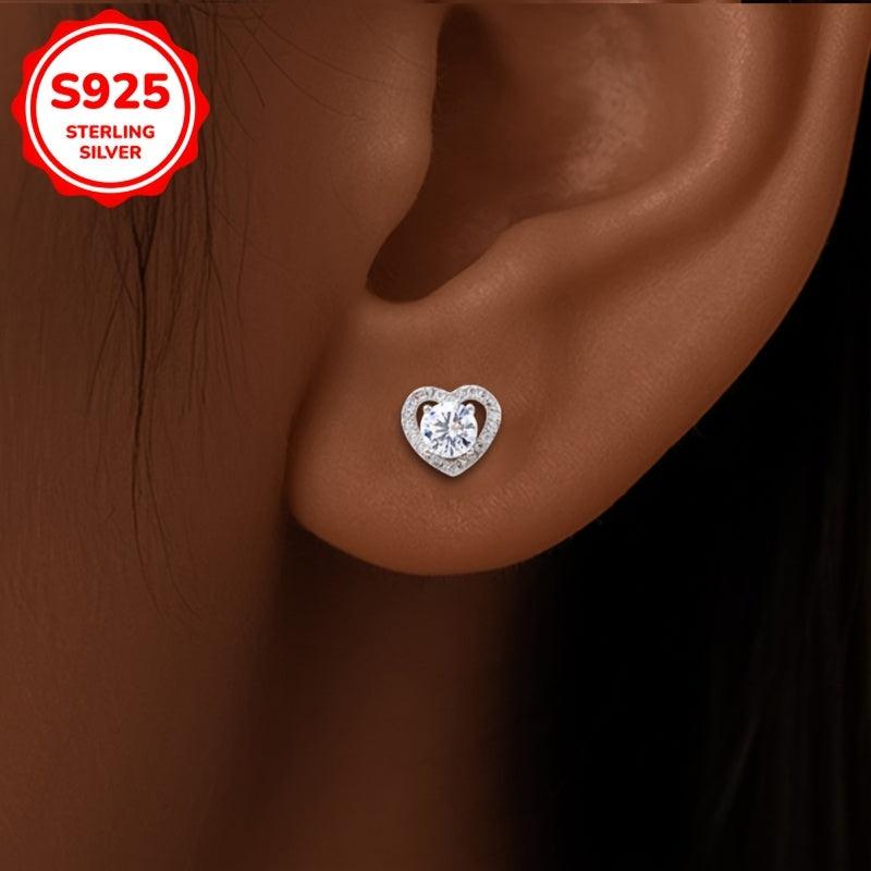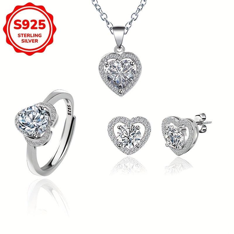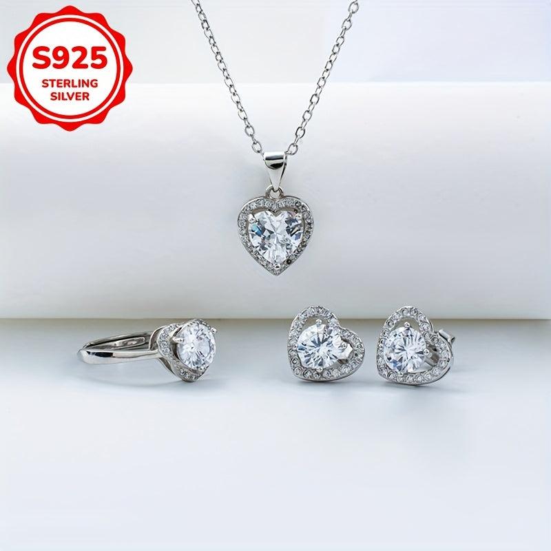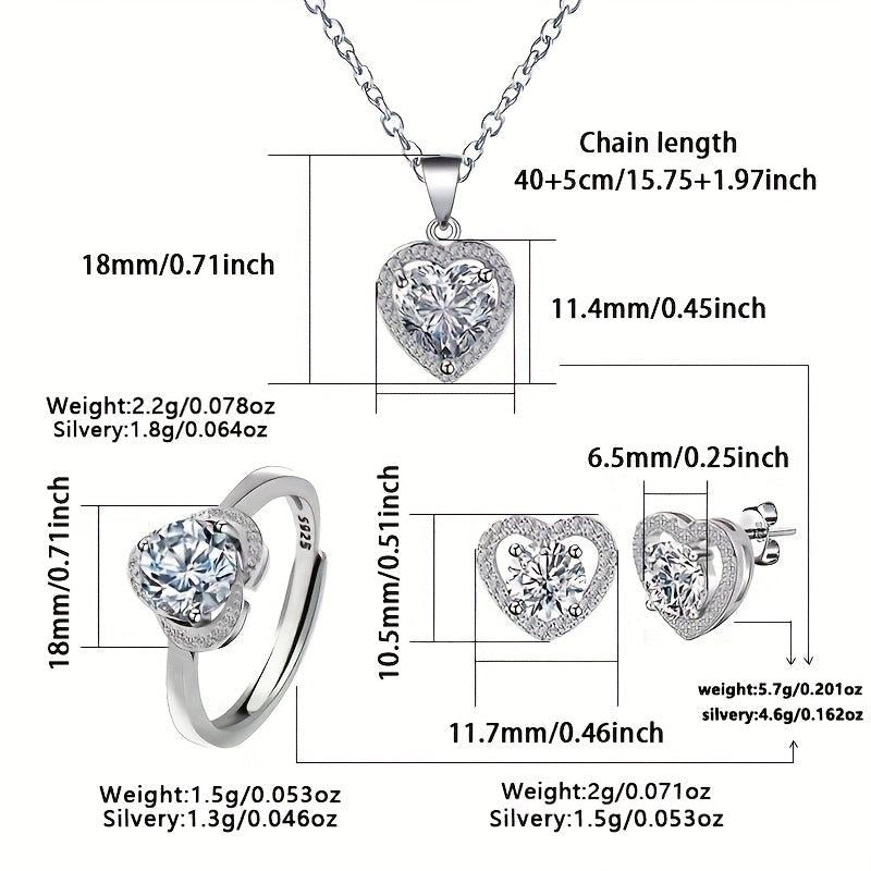 Elegant matching set includes a heart ring, necklace, and stud earrings with Synthetic Zirconia stones. Made of 925 Silver, lightweight and perfect for daily wear, anniversary, or holiday occasions.
