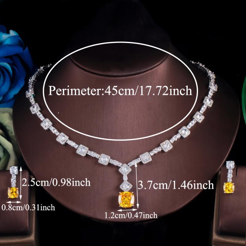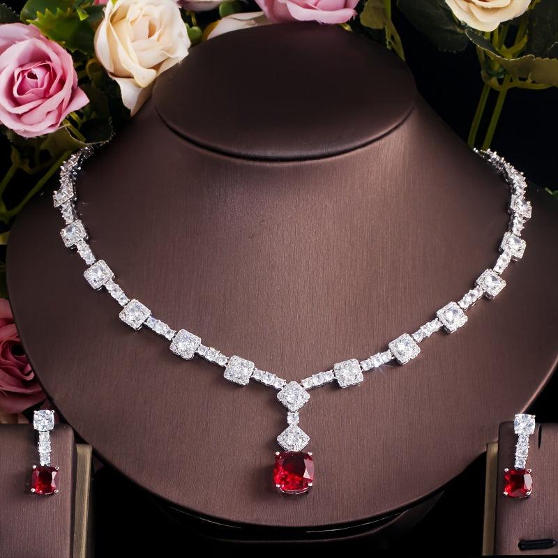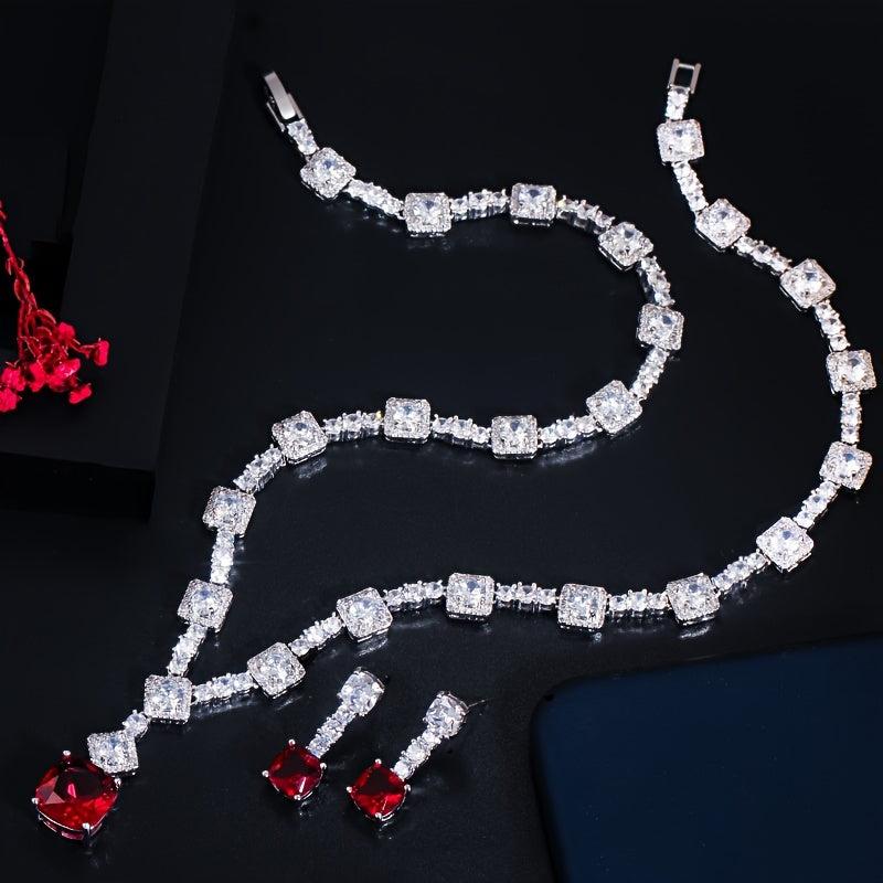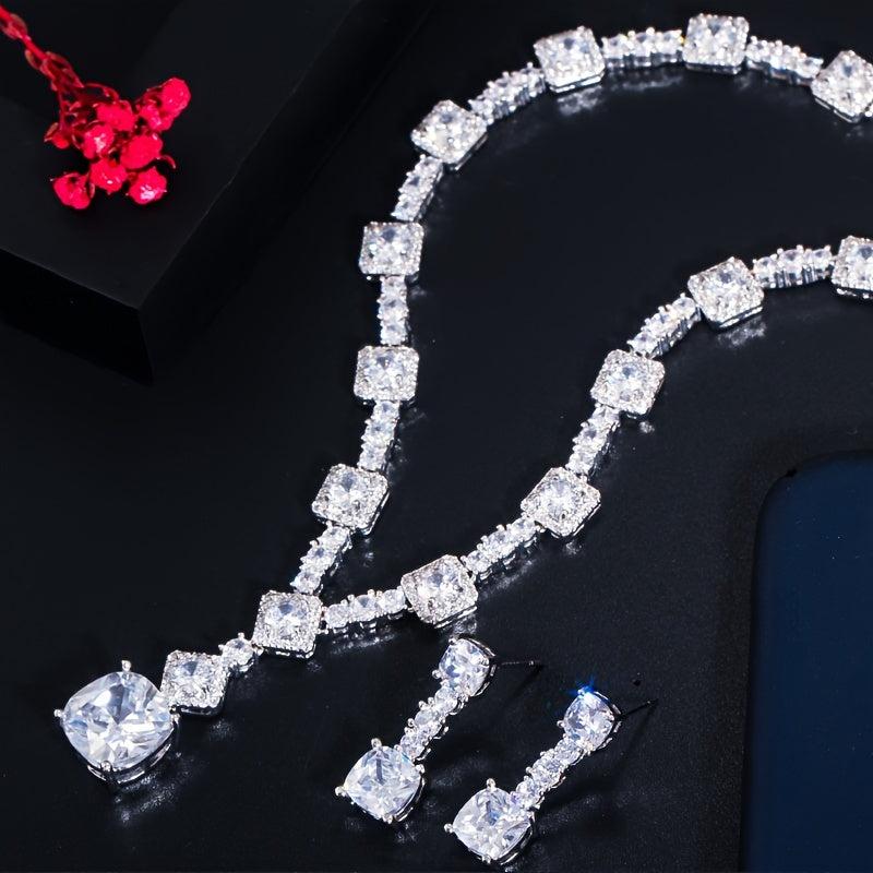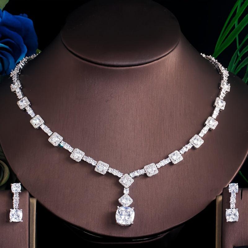 Elegant jewelry set perfect for special occasions, featuring synthetic zirconia in silvery setting. Includes necklace and earrings for a complete look.