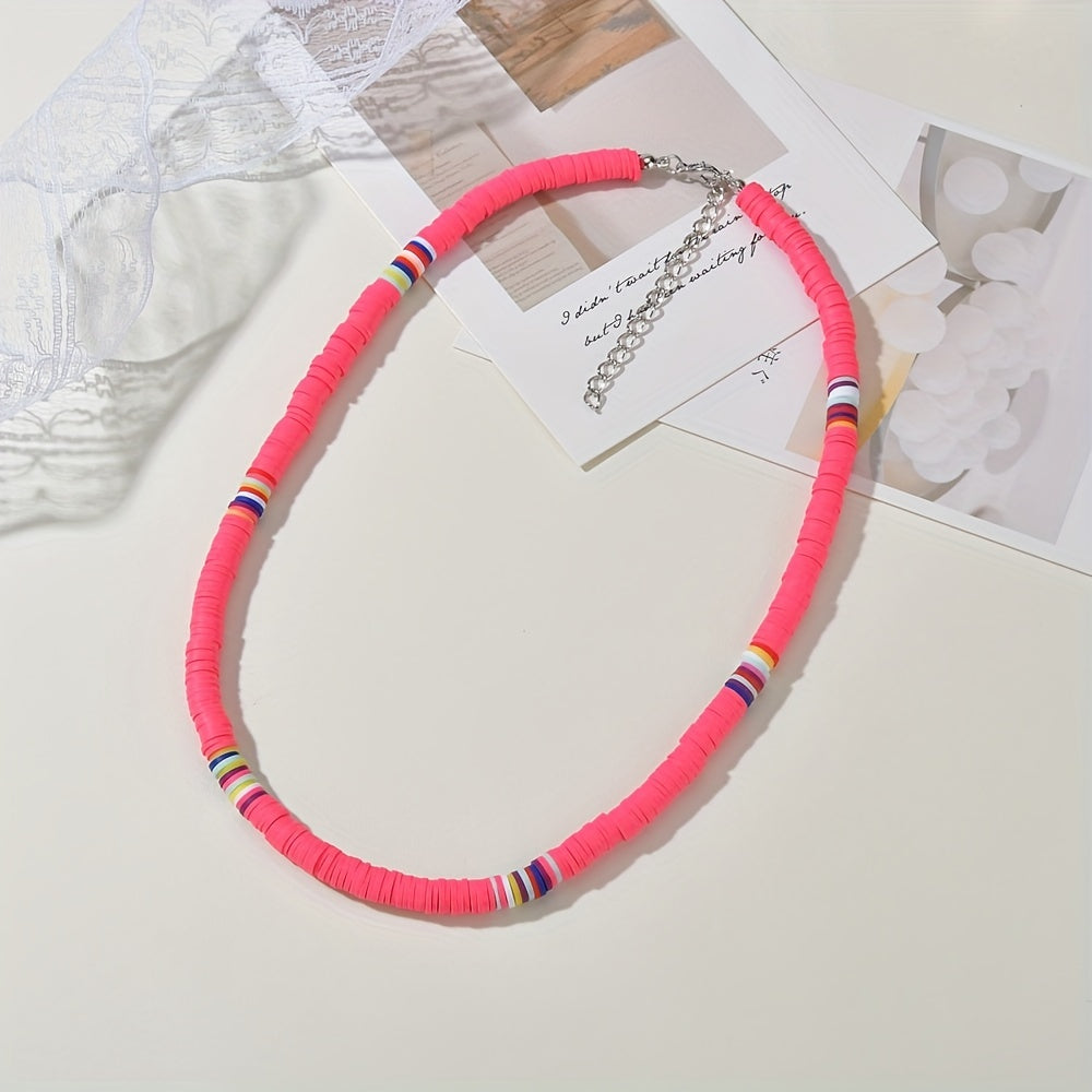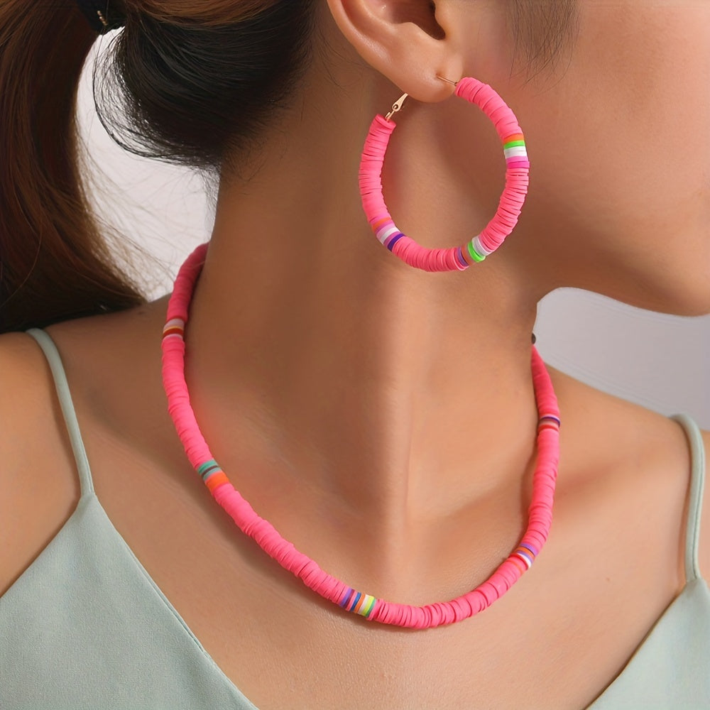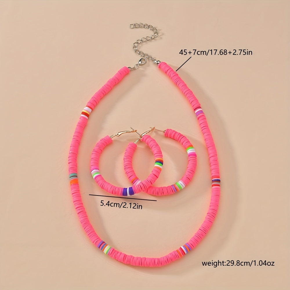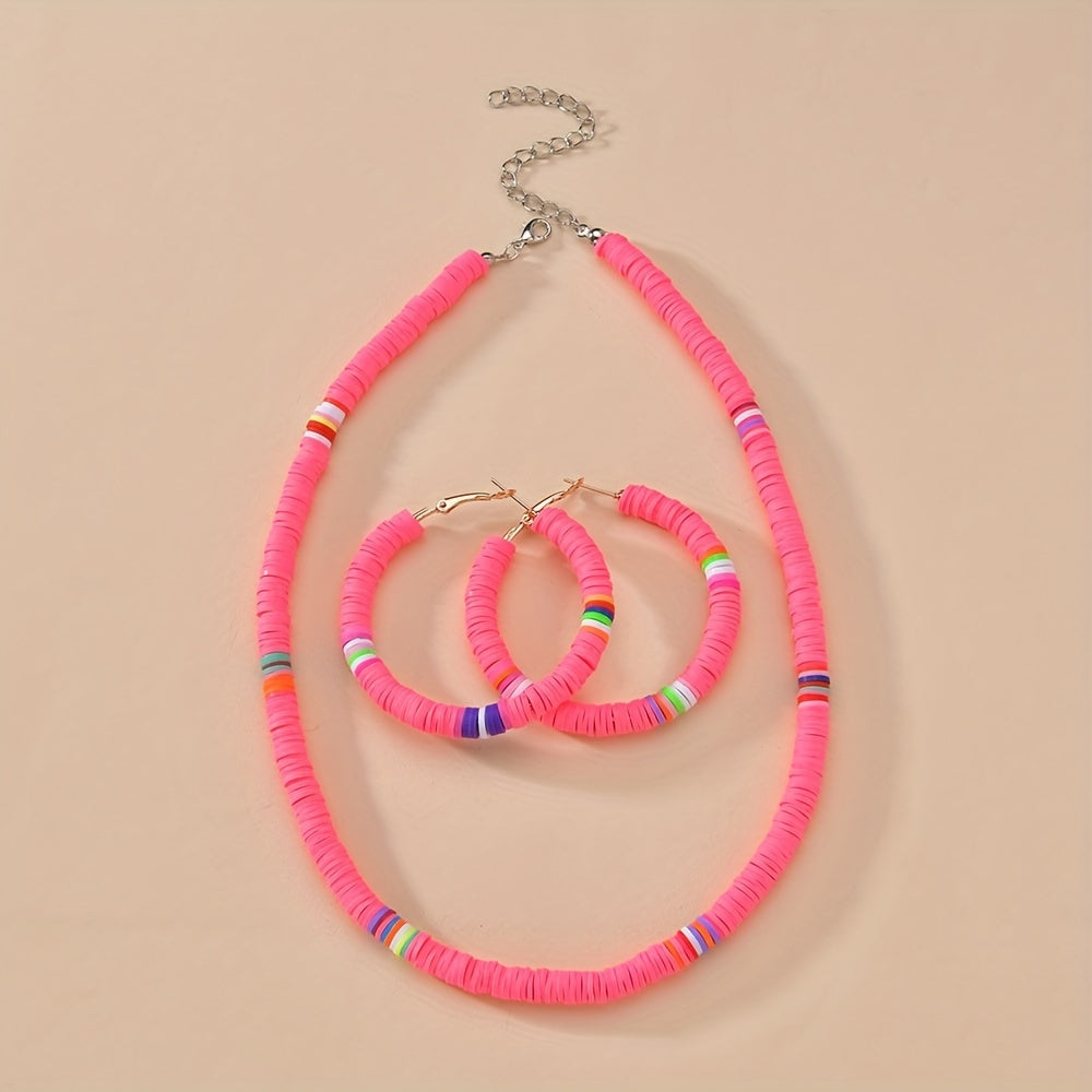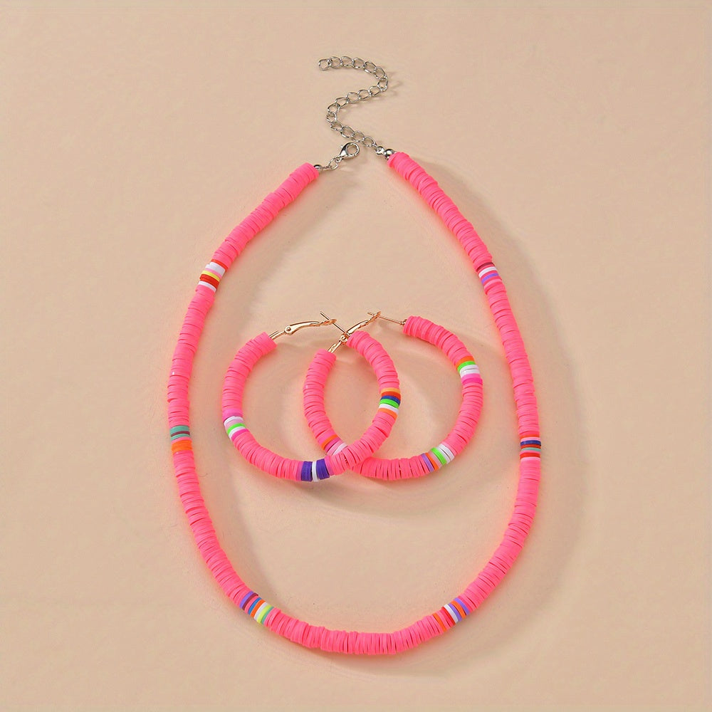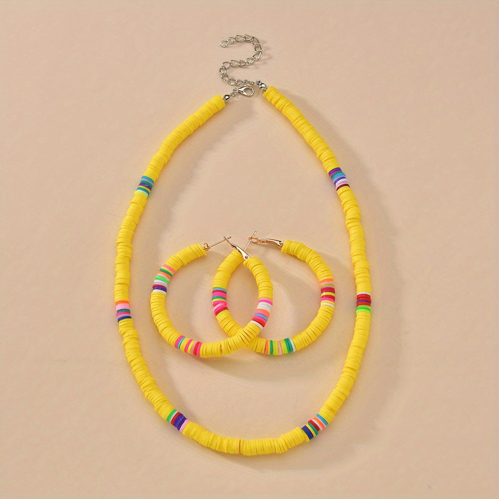 Complete your look with this set of 3 earrings and necklace in vibrant pink or yellow colors. Perfect accessory to match your daily outfits or add a pop of color to your summer vacation style.