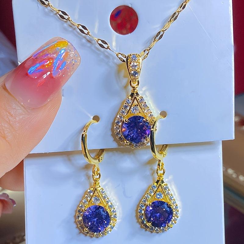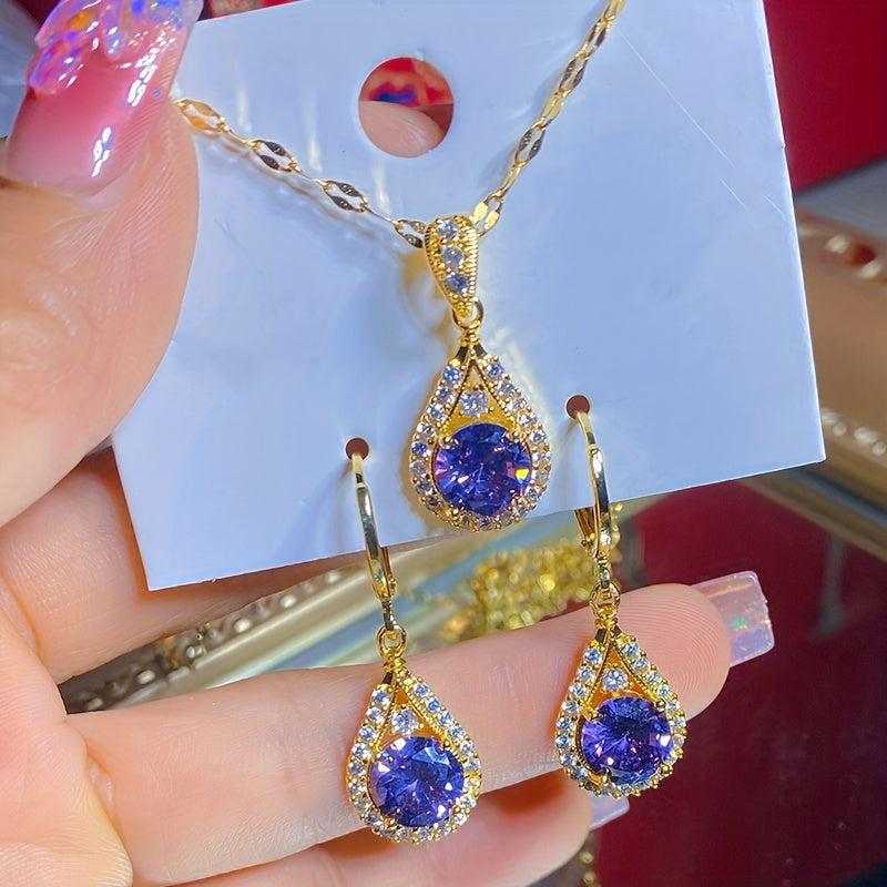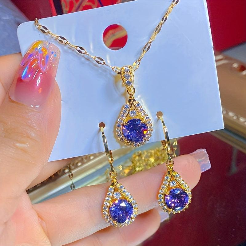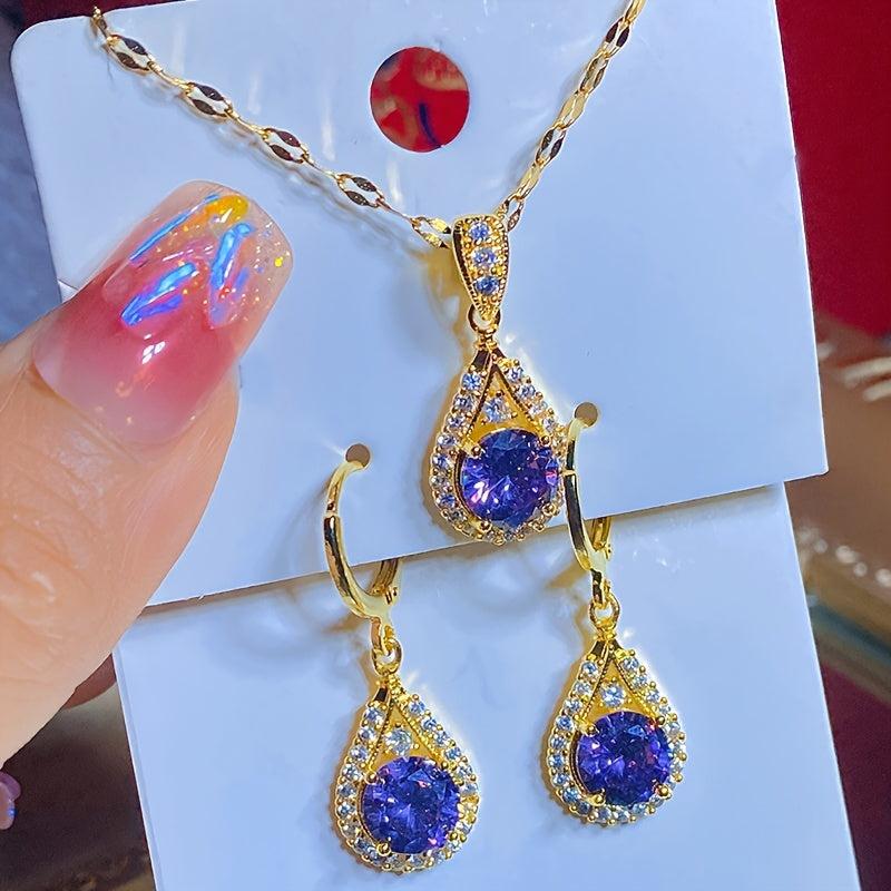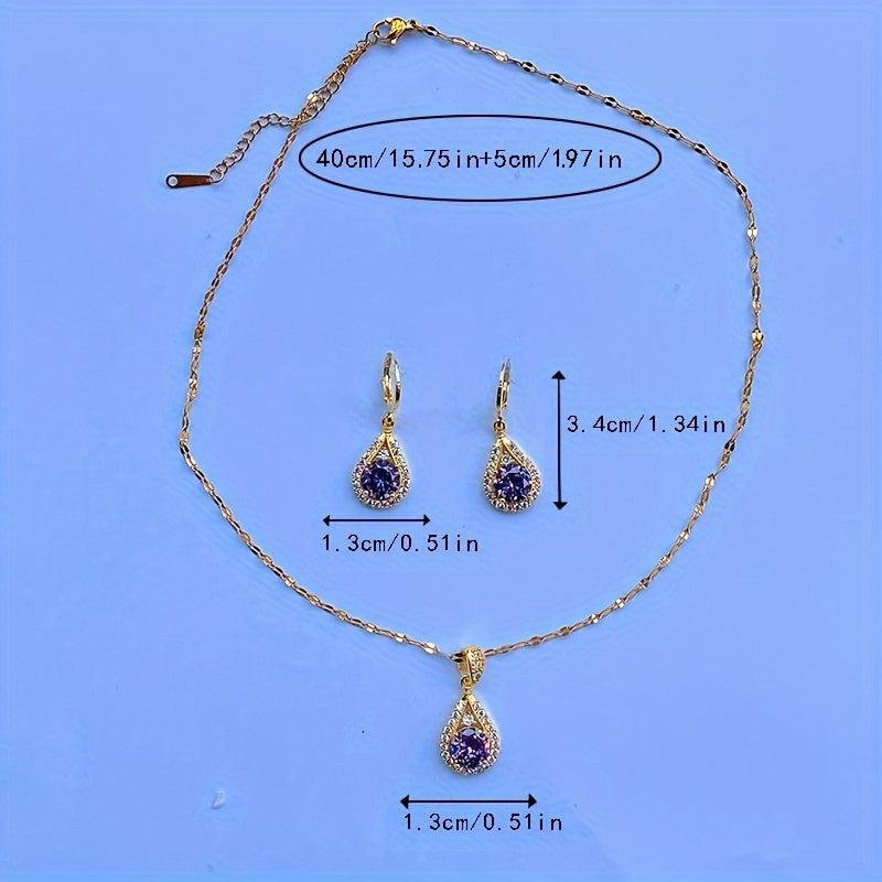 Enhance your style with this elegant 3-piece jewelry set featuring purple teardrop earrings and necklace. The set is made of 14K golden plated copper, adding a touch of luxury to any outfit.