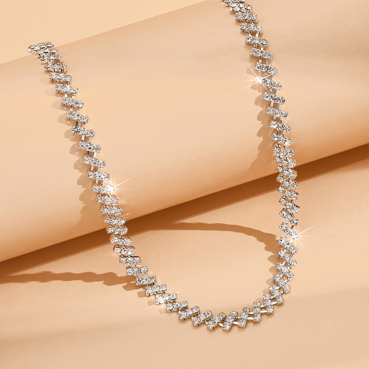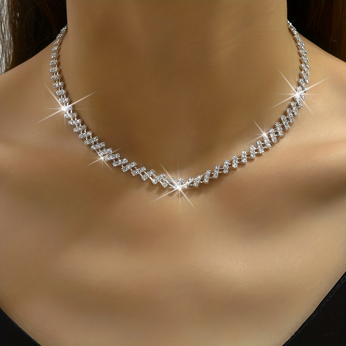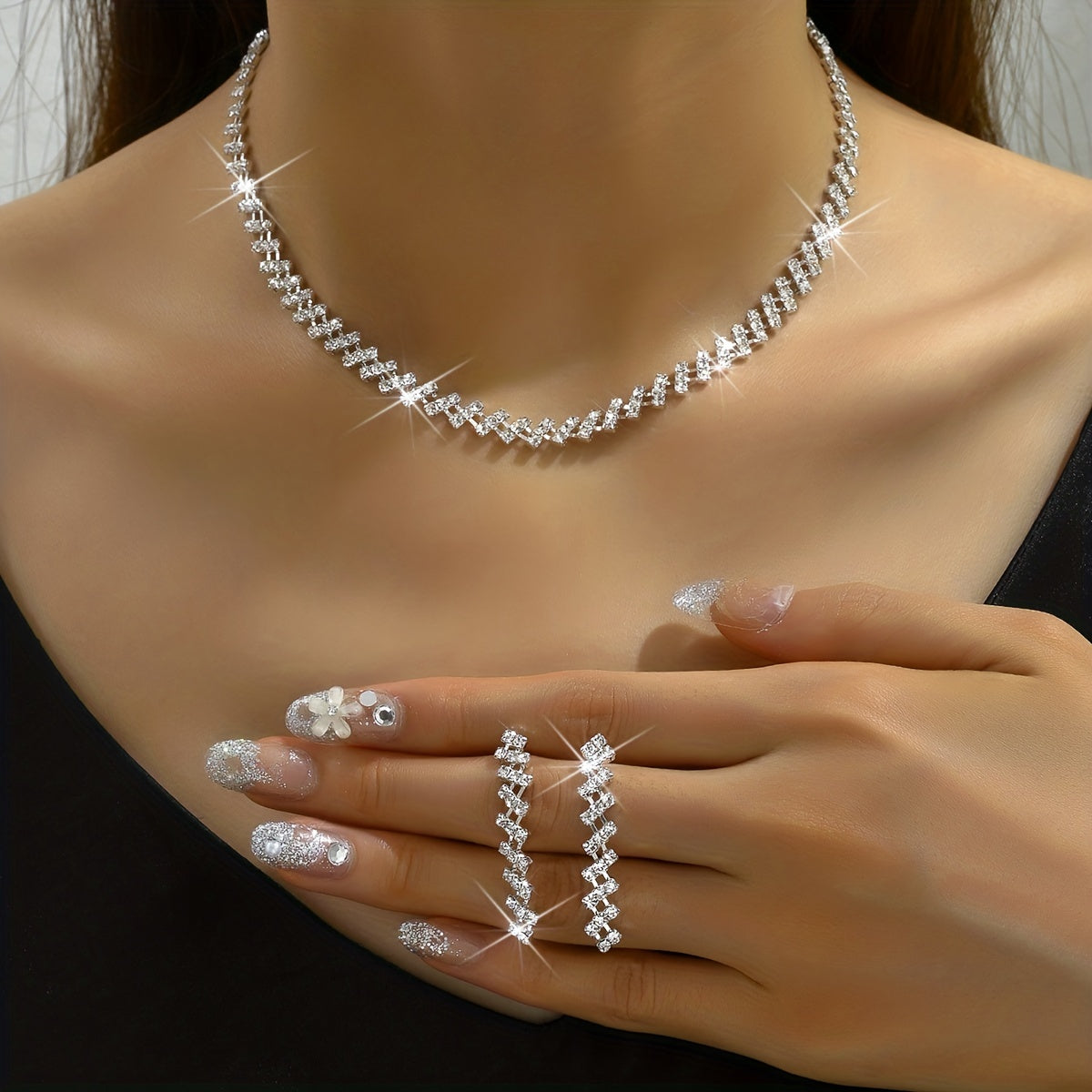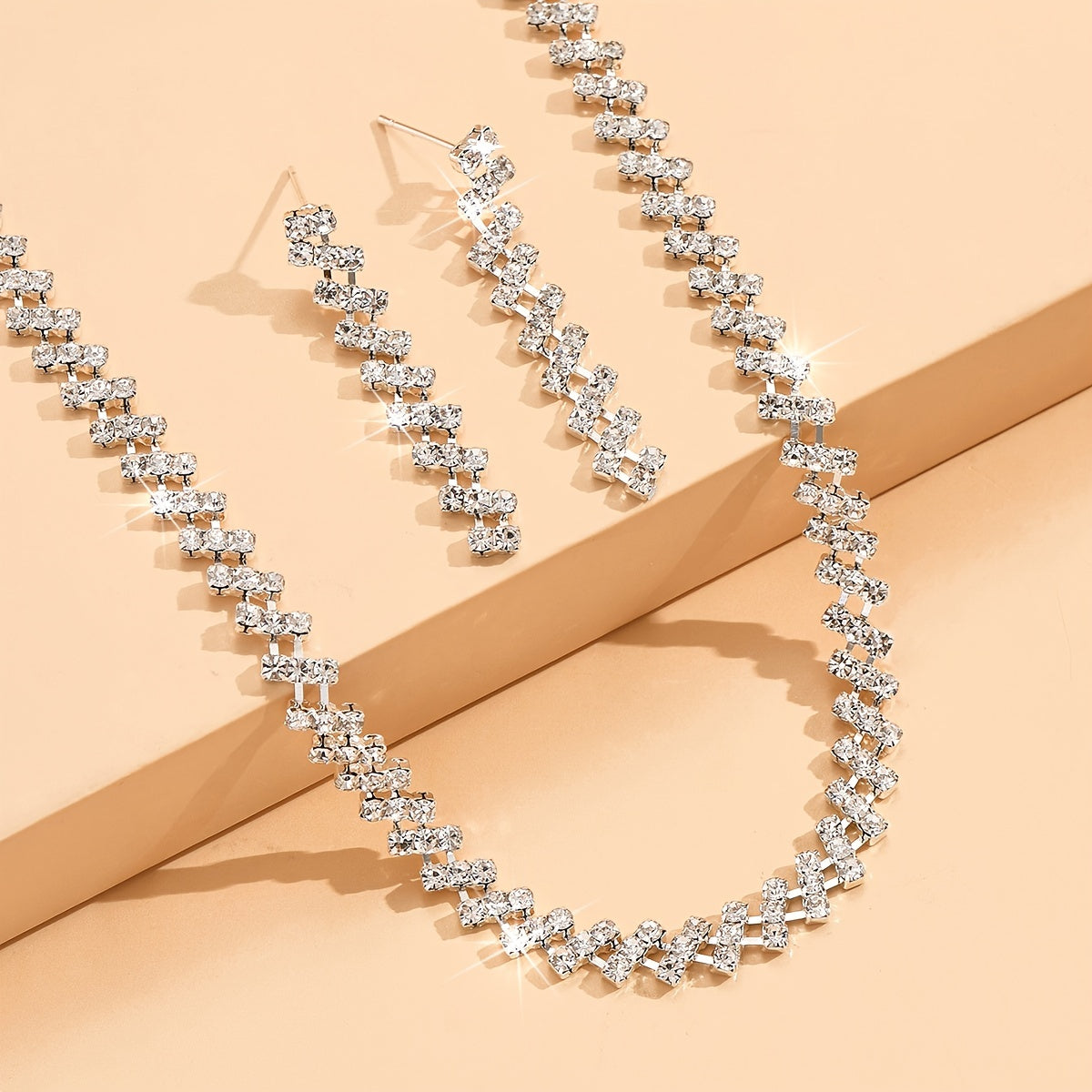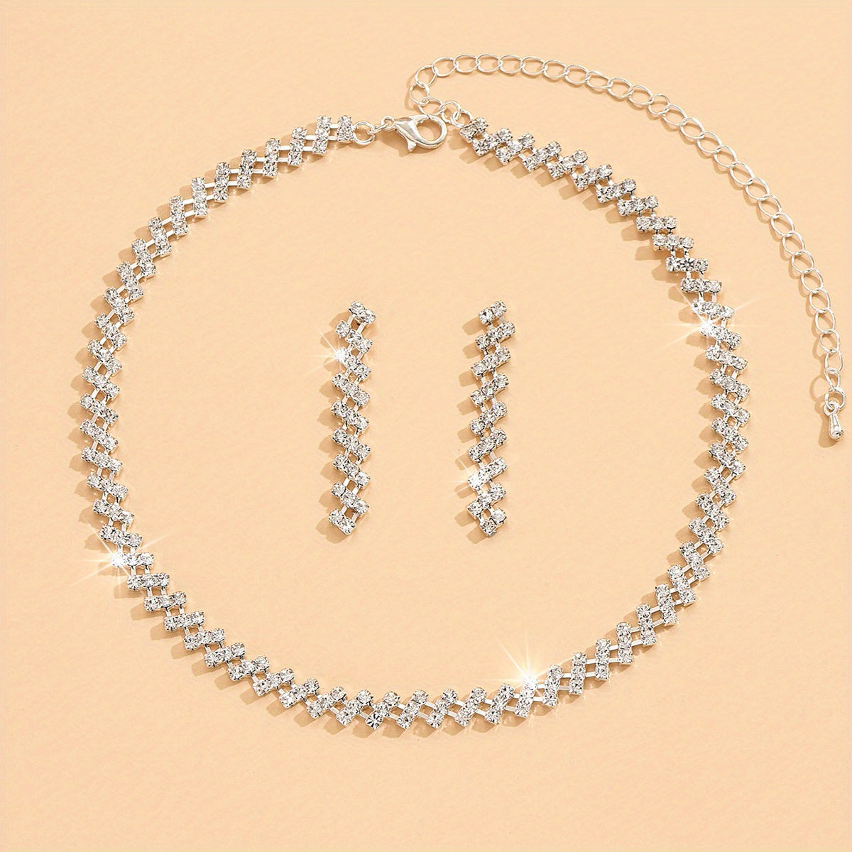 Complete your evening party look with this dainty jewelry set featuring earrings and necklace. Made with silver-plated metal and inlaid rhinestones, this set is perfect for cocktail parties and special occasions.