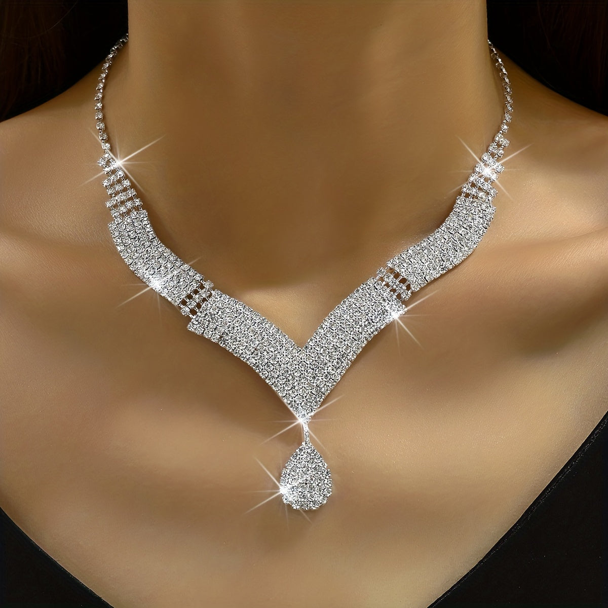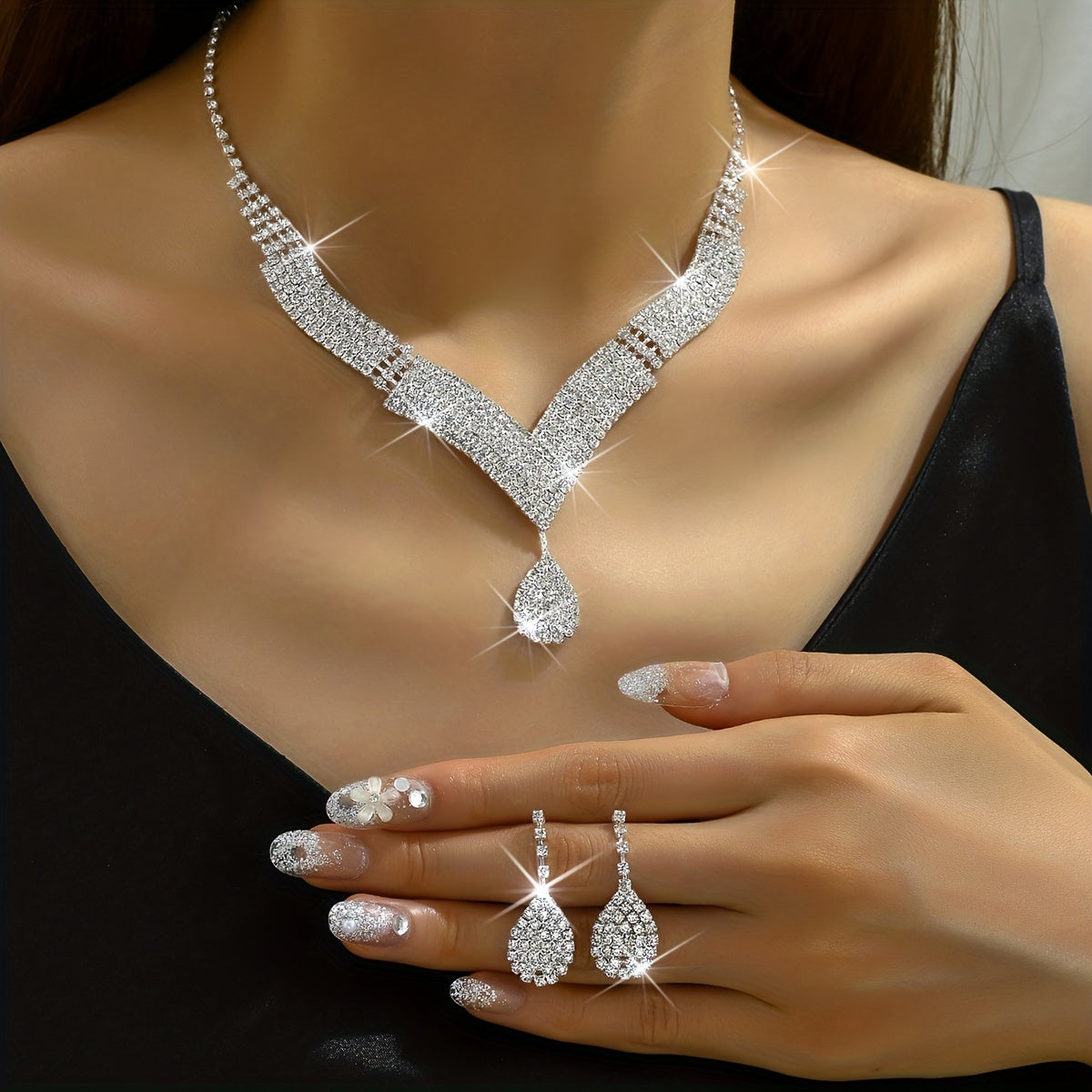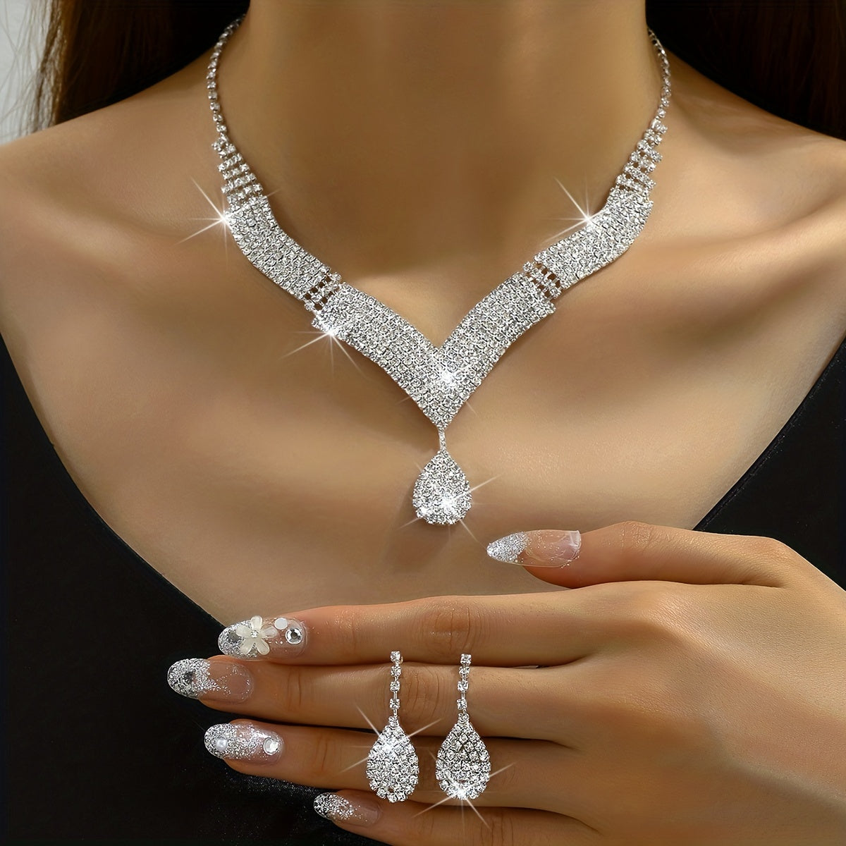Complete your evening party look with this dazzling jewelry set featuring silver-plated earrings and necklace with inlaid rhinestones. Perfect for cocktail parties and special occasions.