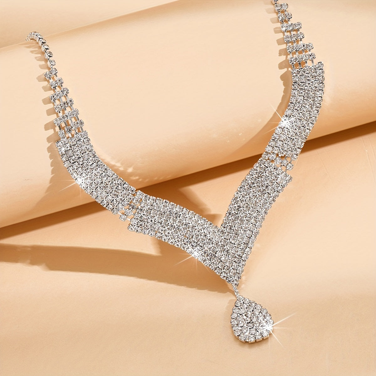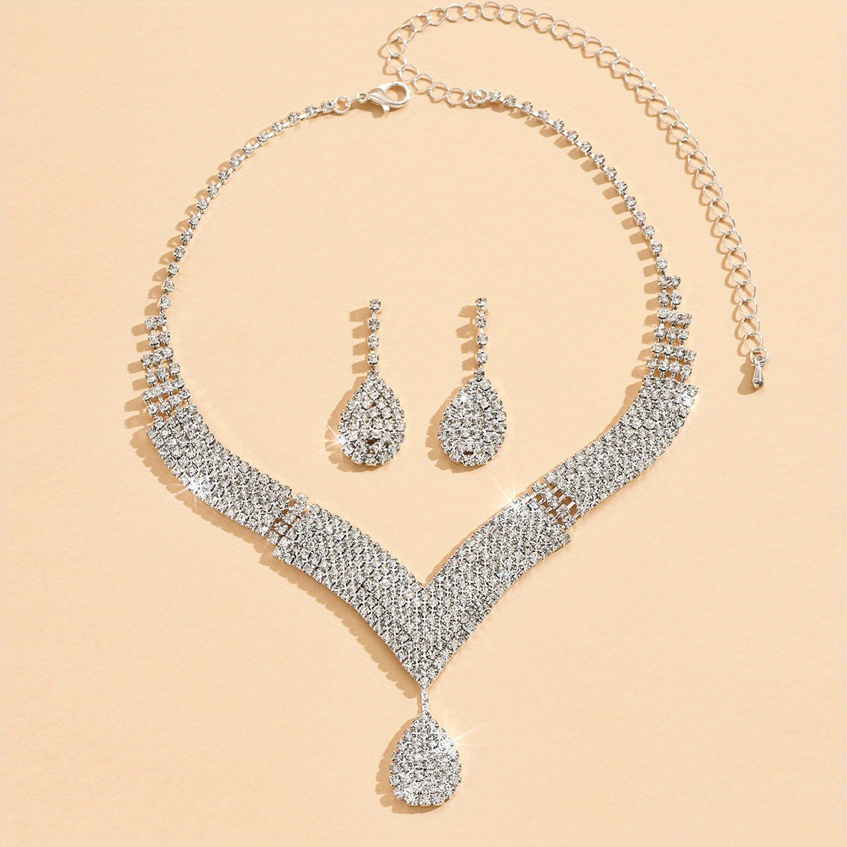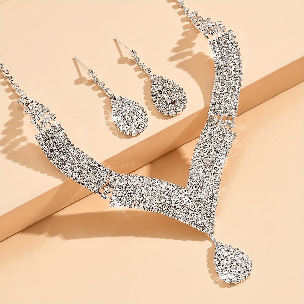 Complete your evening party look with this dazzling jewelry set featuring silver-plated earrings and necklace with inlaid rhinestones. Perfect for cocktail parties and special occasions.