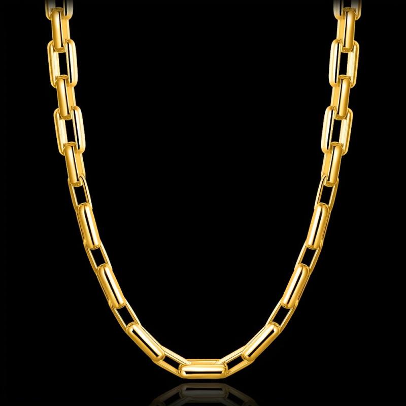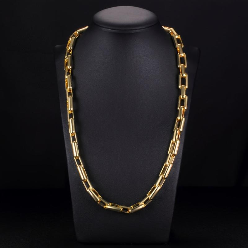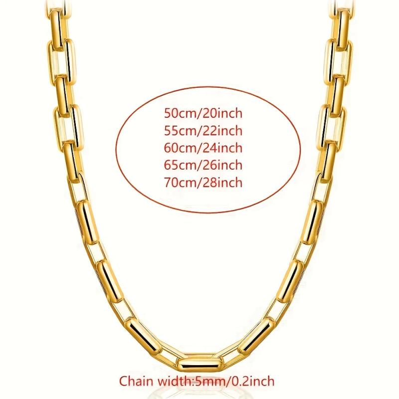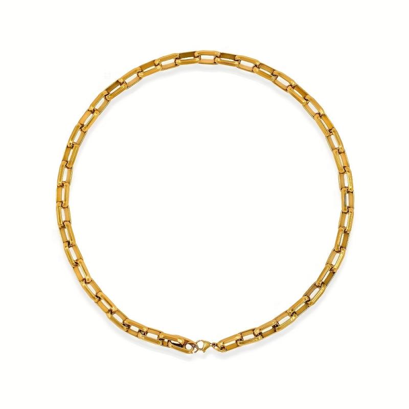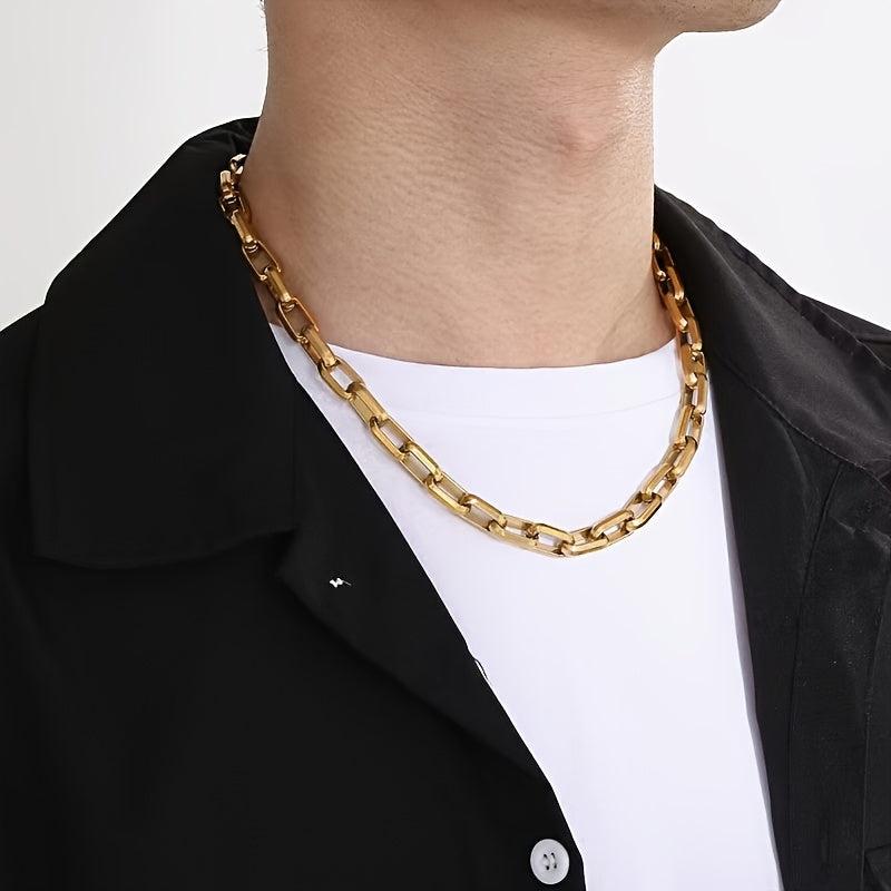 This stainless steel golden chain necklace features a durable design with a rectangular link style. Tarnish resistant and ideal for hip hop or casual wear, it's a versatile everyday accessory.