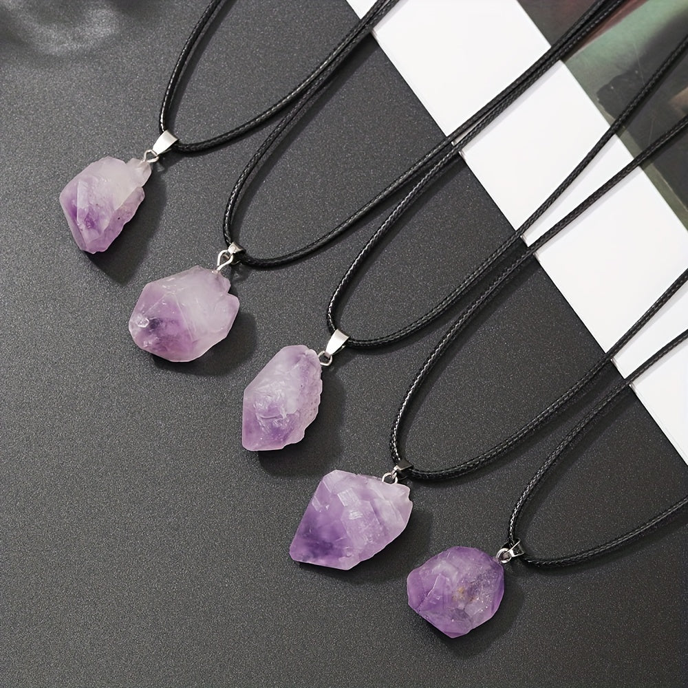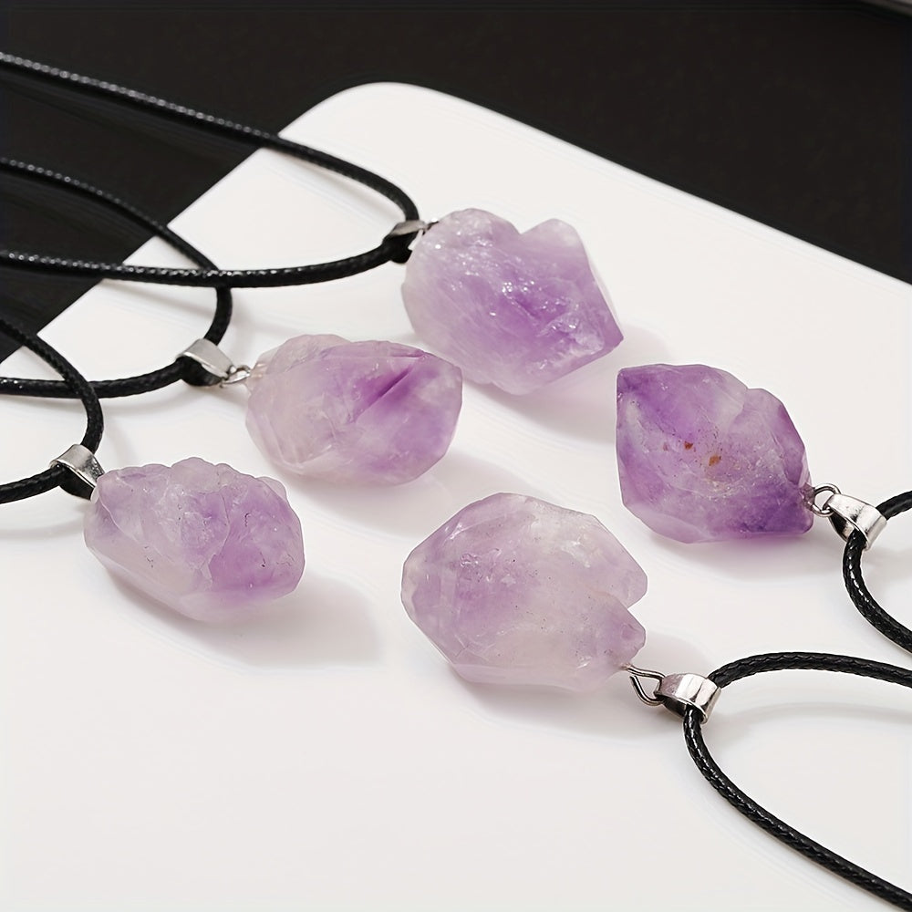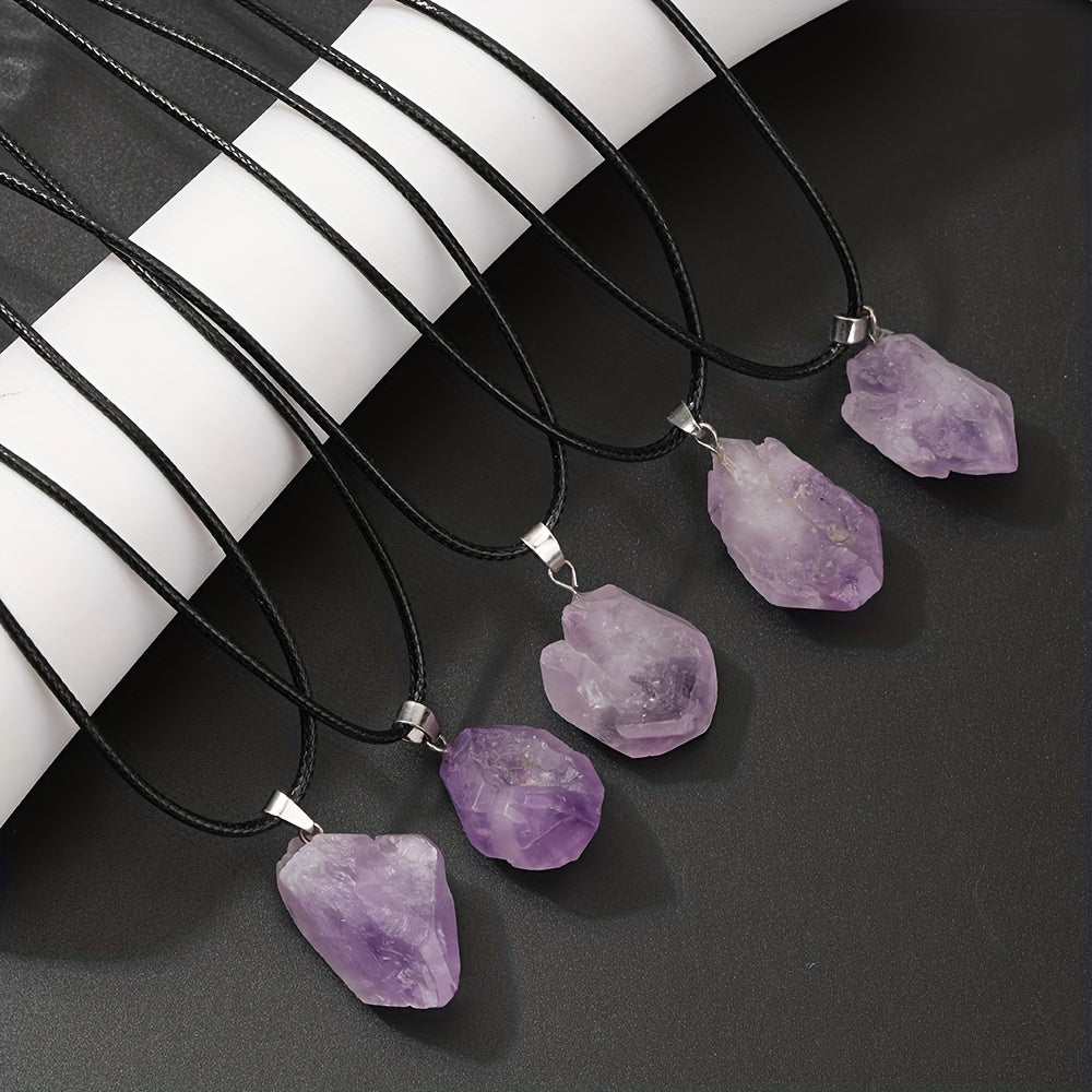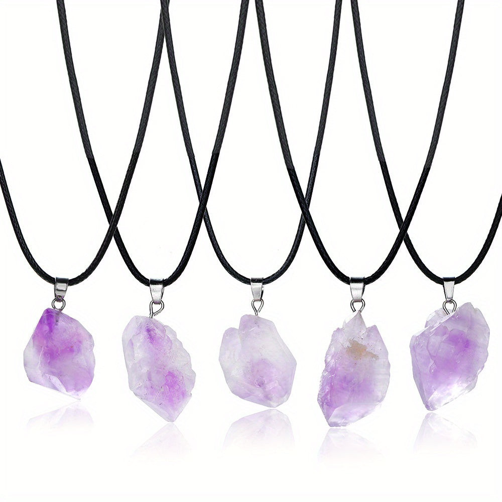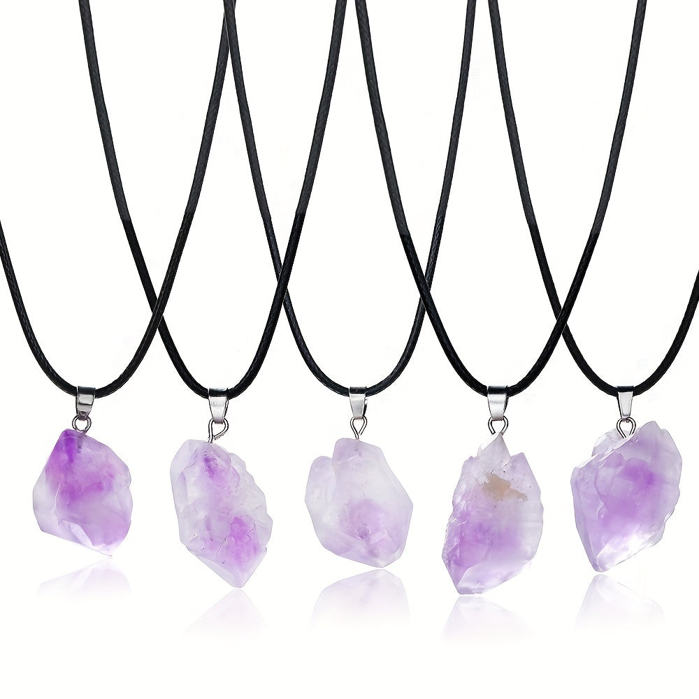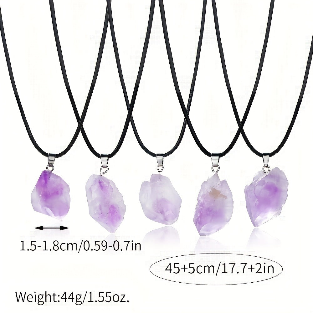 Embrace the beauty of raw amethyst with this 5-piece pendant necklace set featuring natural irregular stones and adjustable chains.