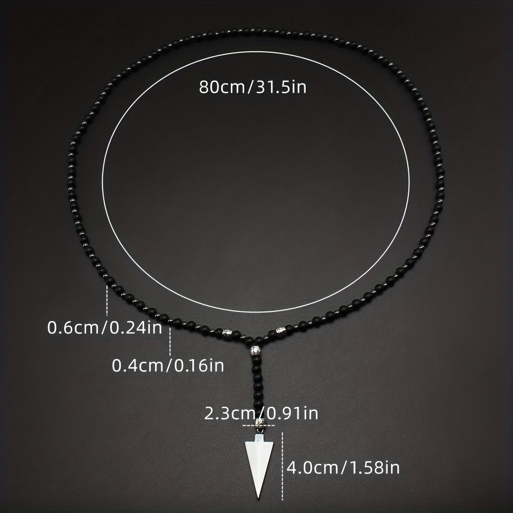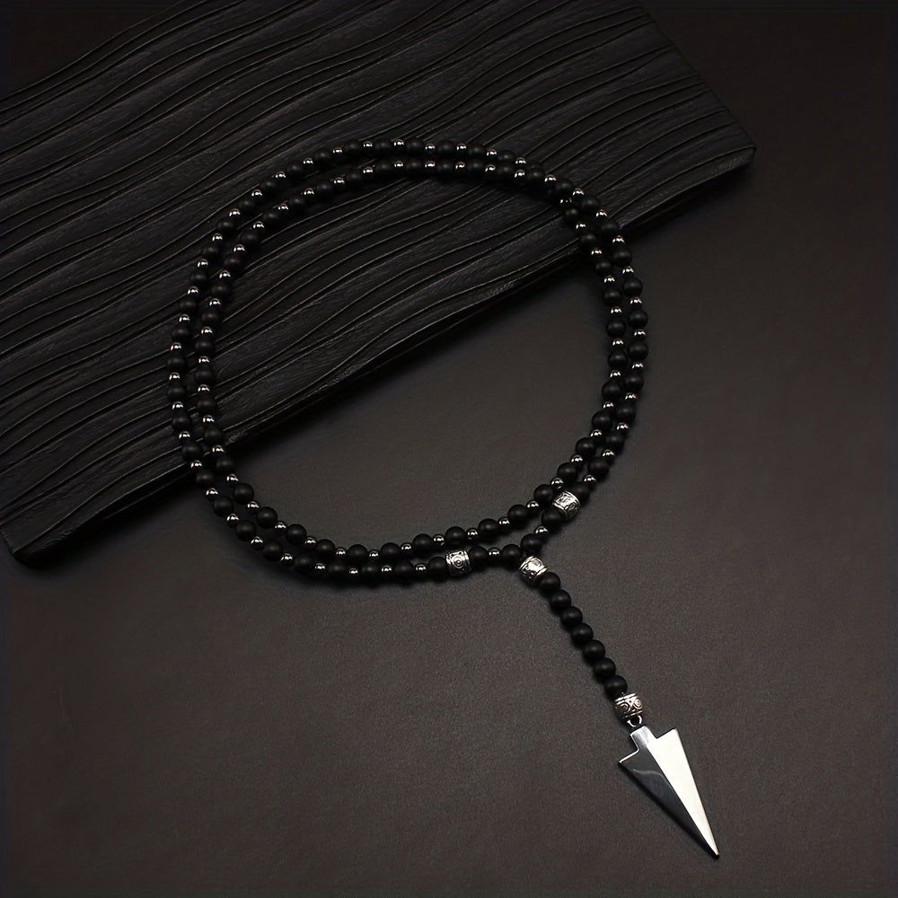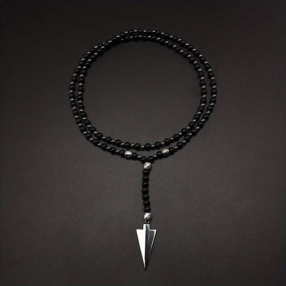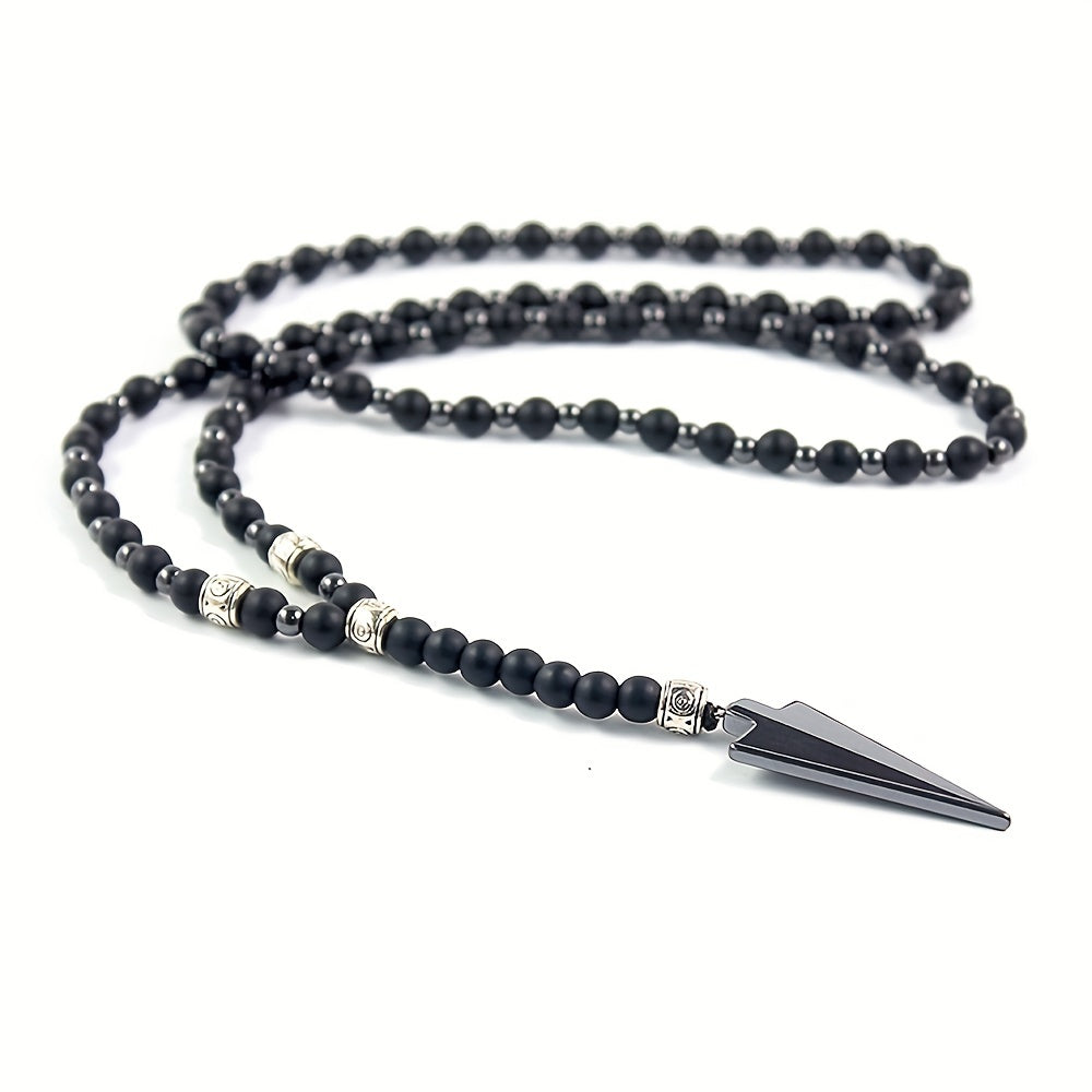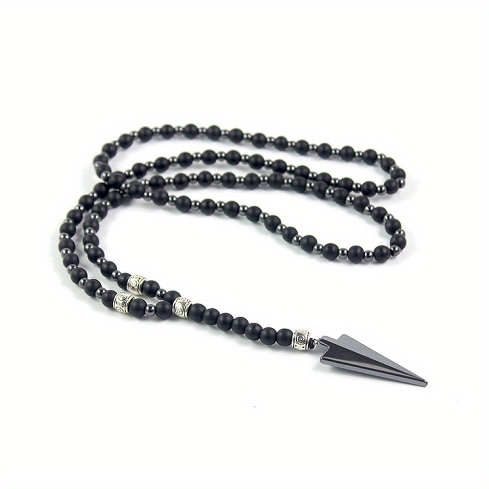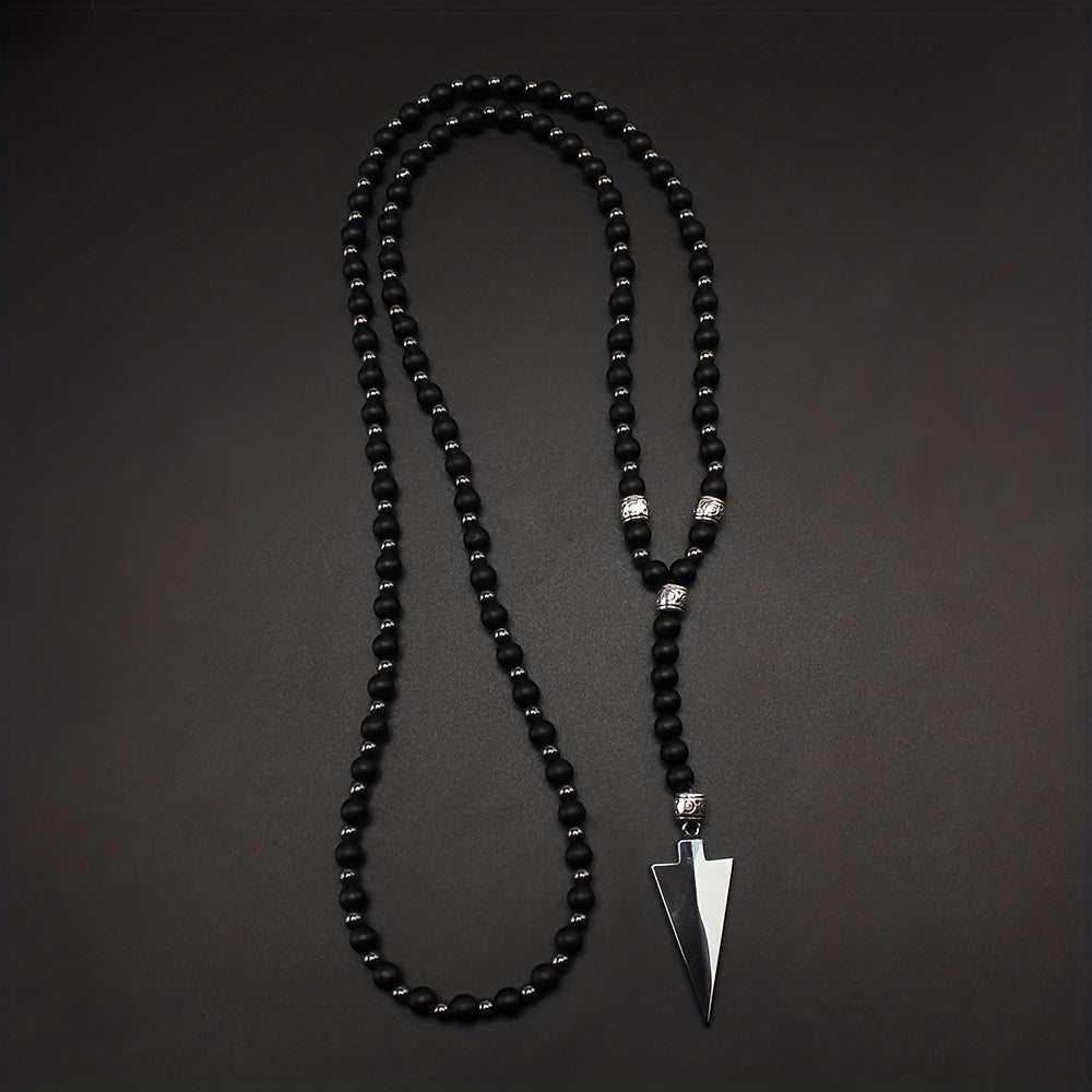 This necklace features a classic matte round bead design with a gallstone arrow pendant. It's a raw stone round bead necklace for men.