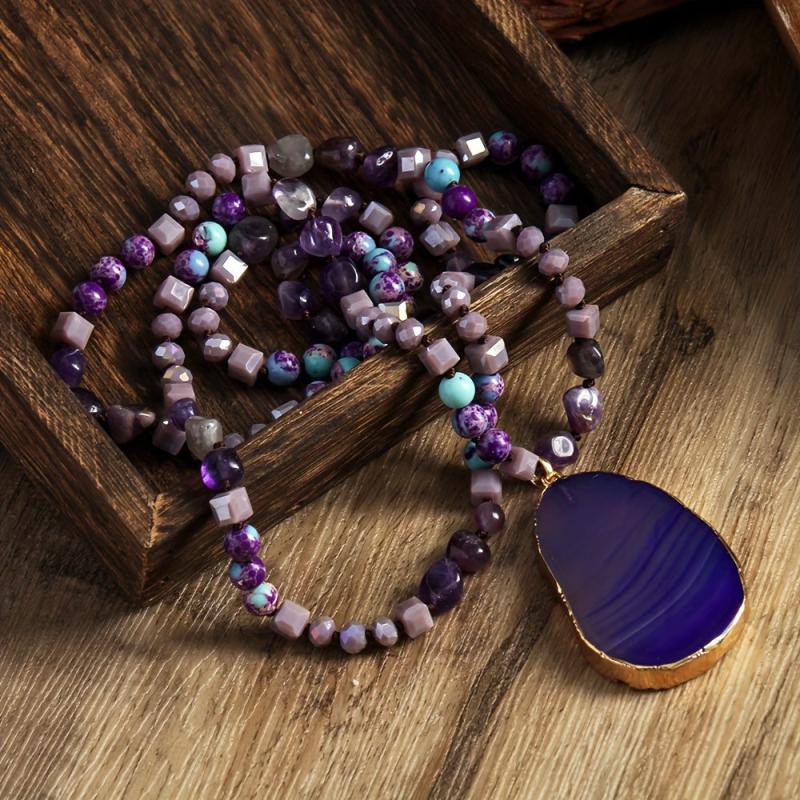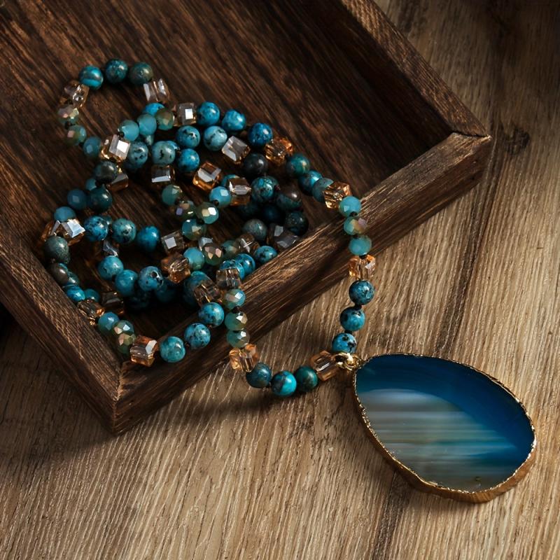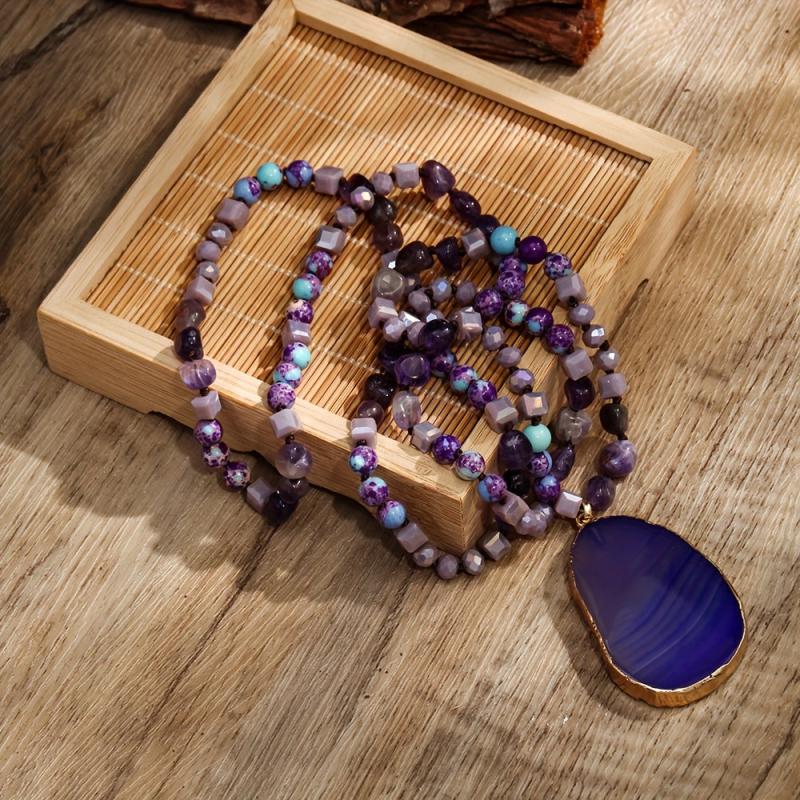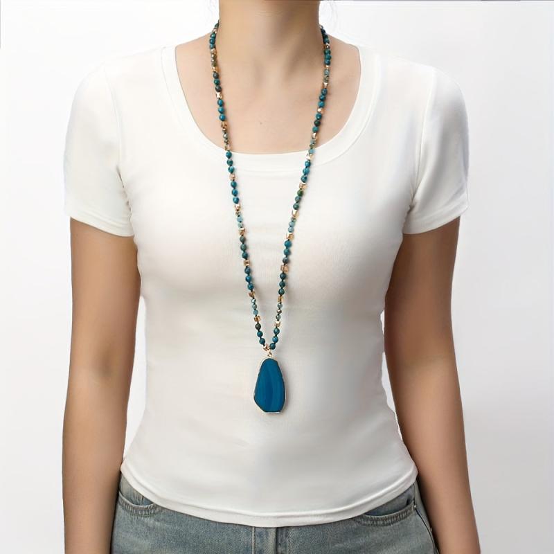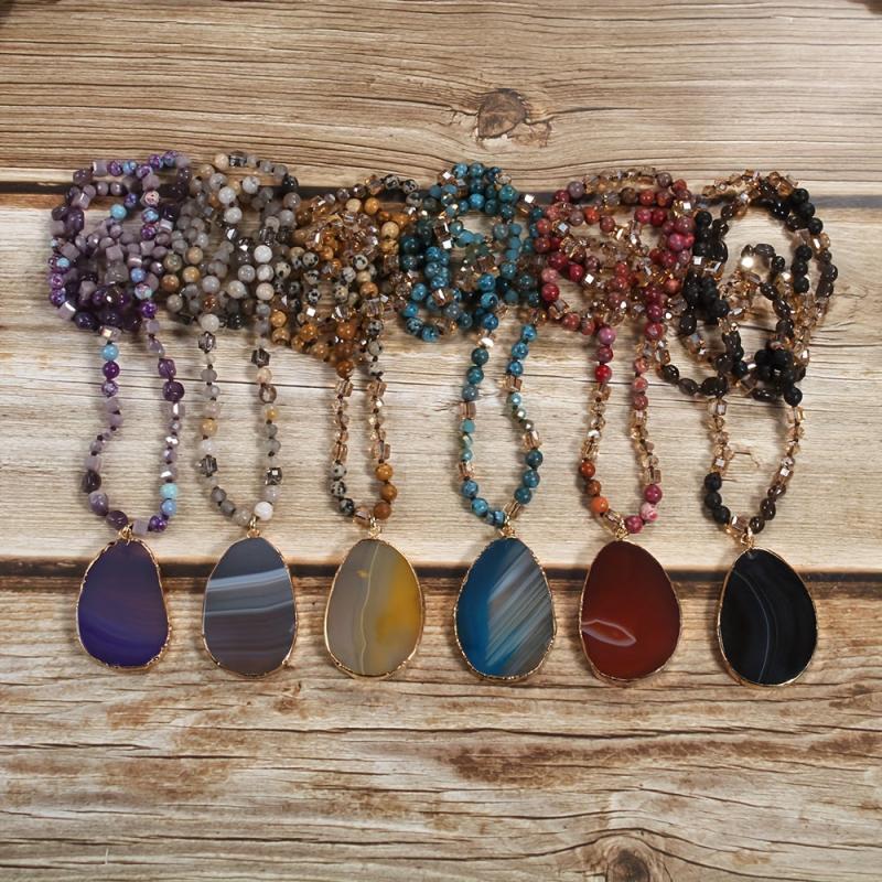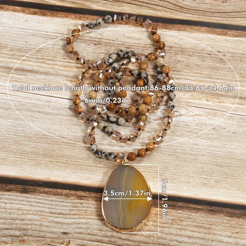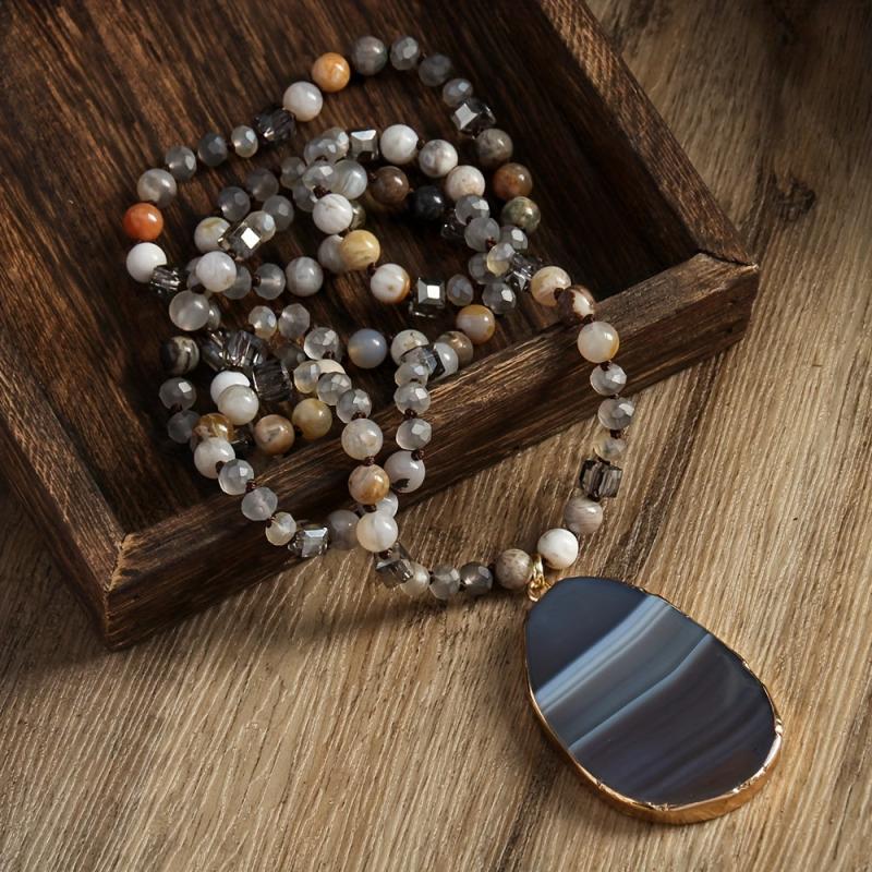 Add a touch of bohemian flair to your spring and summer outfits with this stunning necklace featuring a natural stone glass knot design and a striped agate drop pendant. Perfect for daily wear and a great gift for mothers.