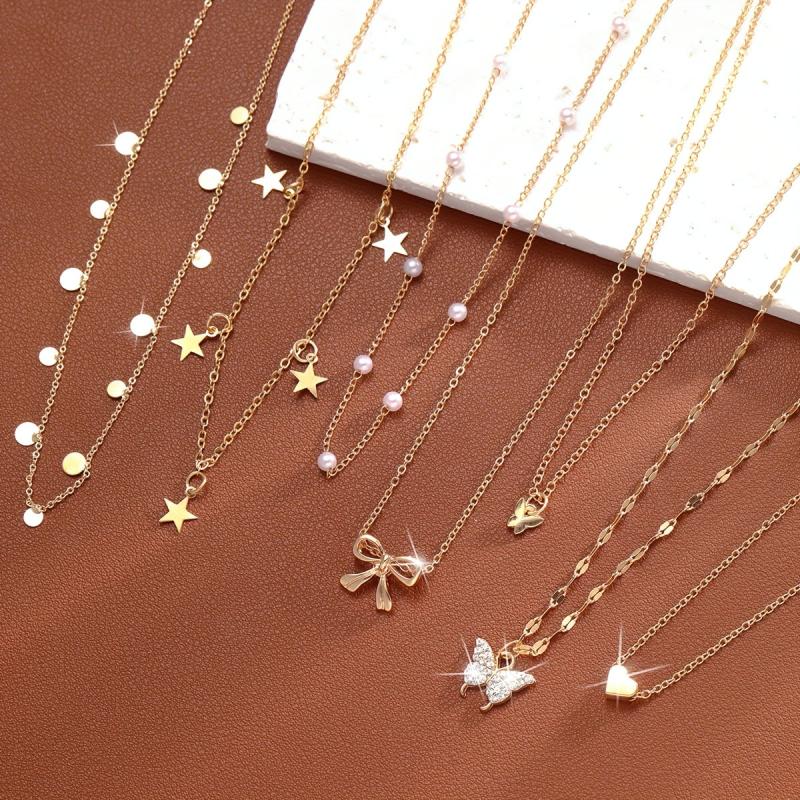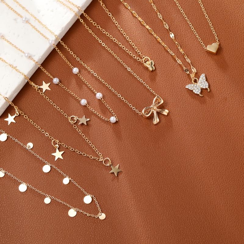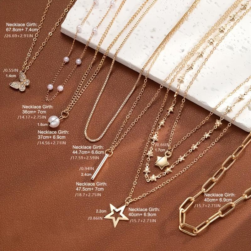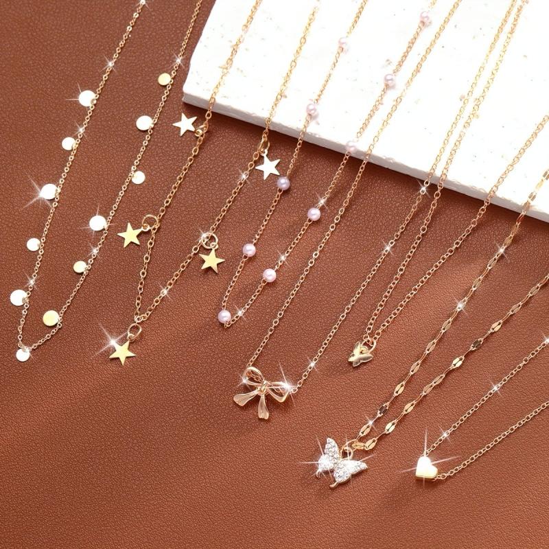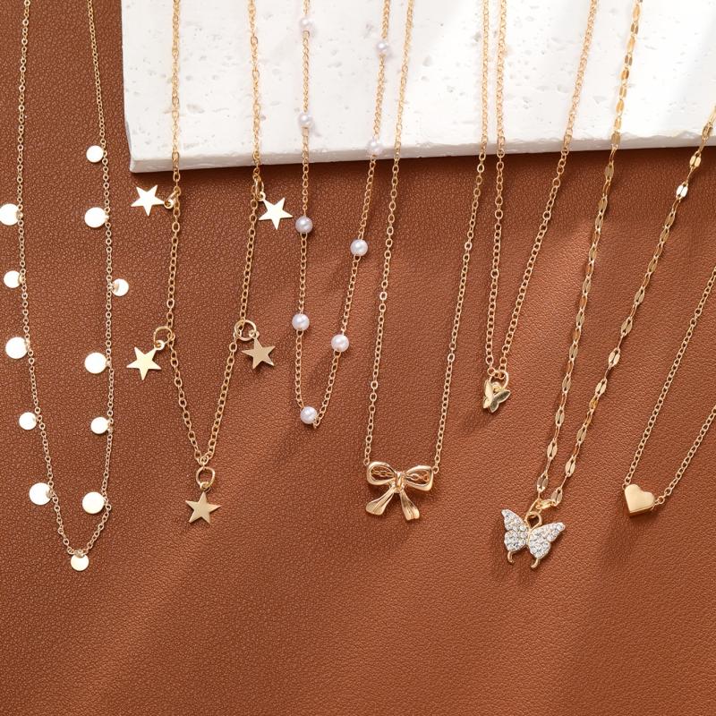 Elegant necklace set featuring faux pearls and rhinestone pendants in star, heart, and butterfly motifs. Ideal for vacation, parties, and dates. Makes a perfect gift for Christmas, Valentine's Day, or any special occasion.