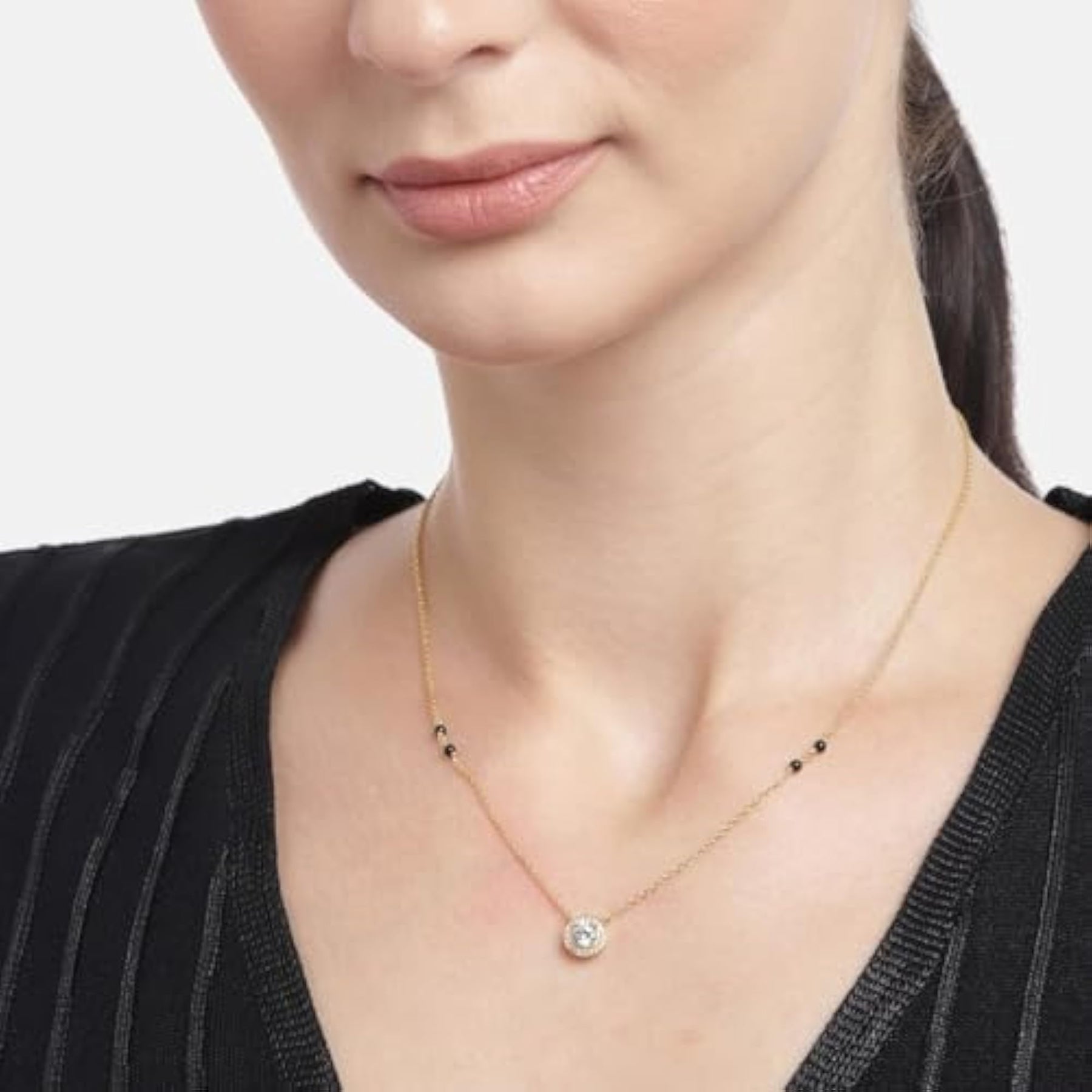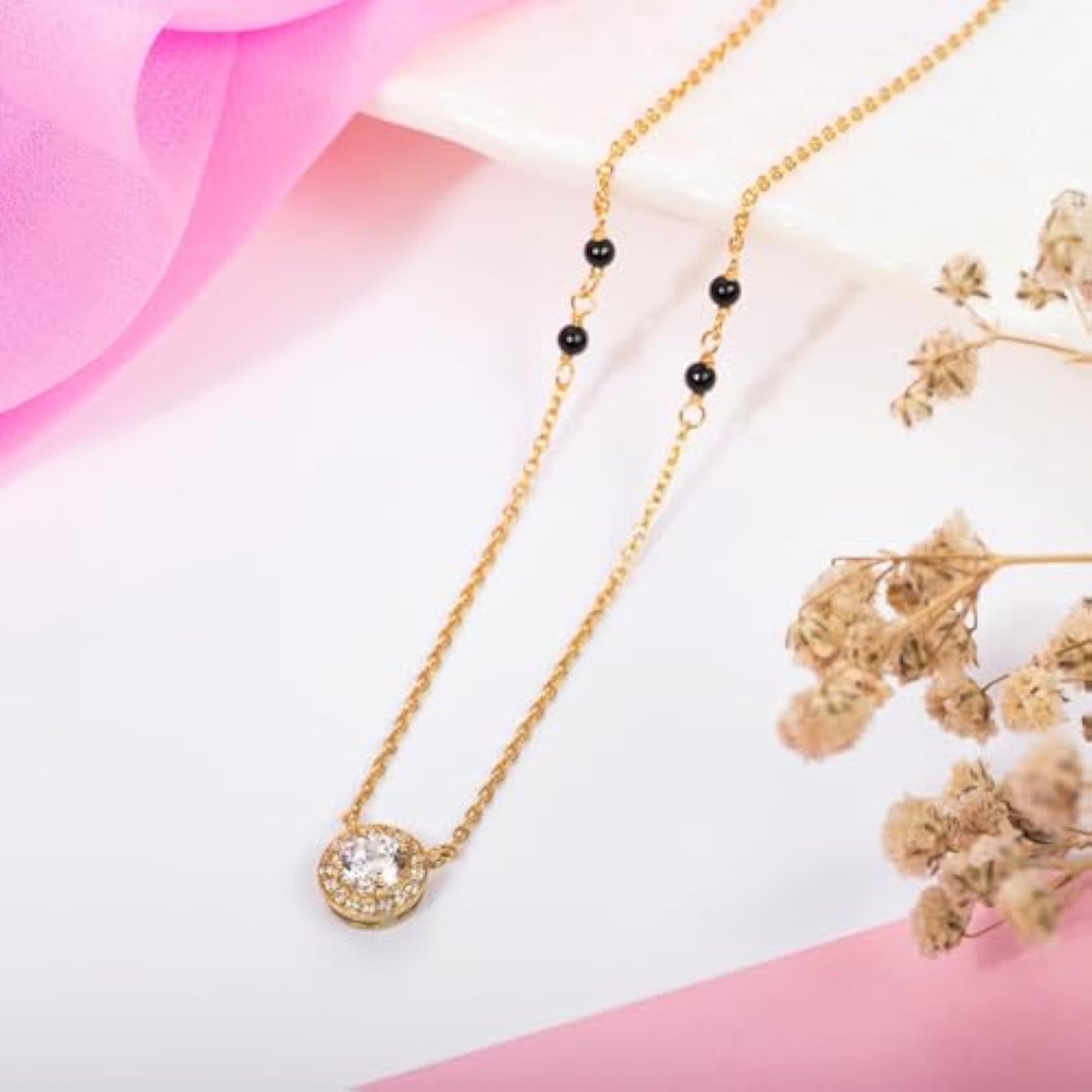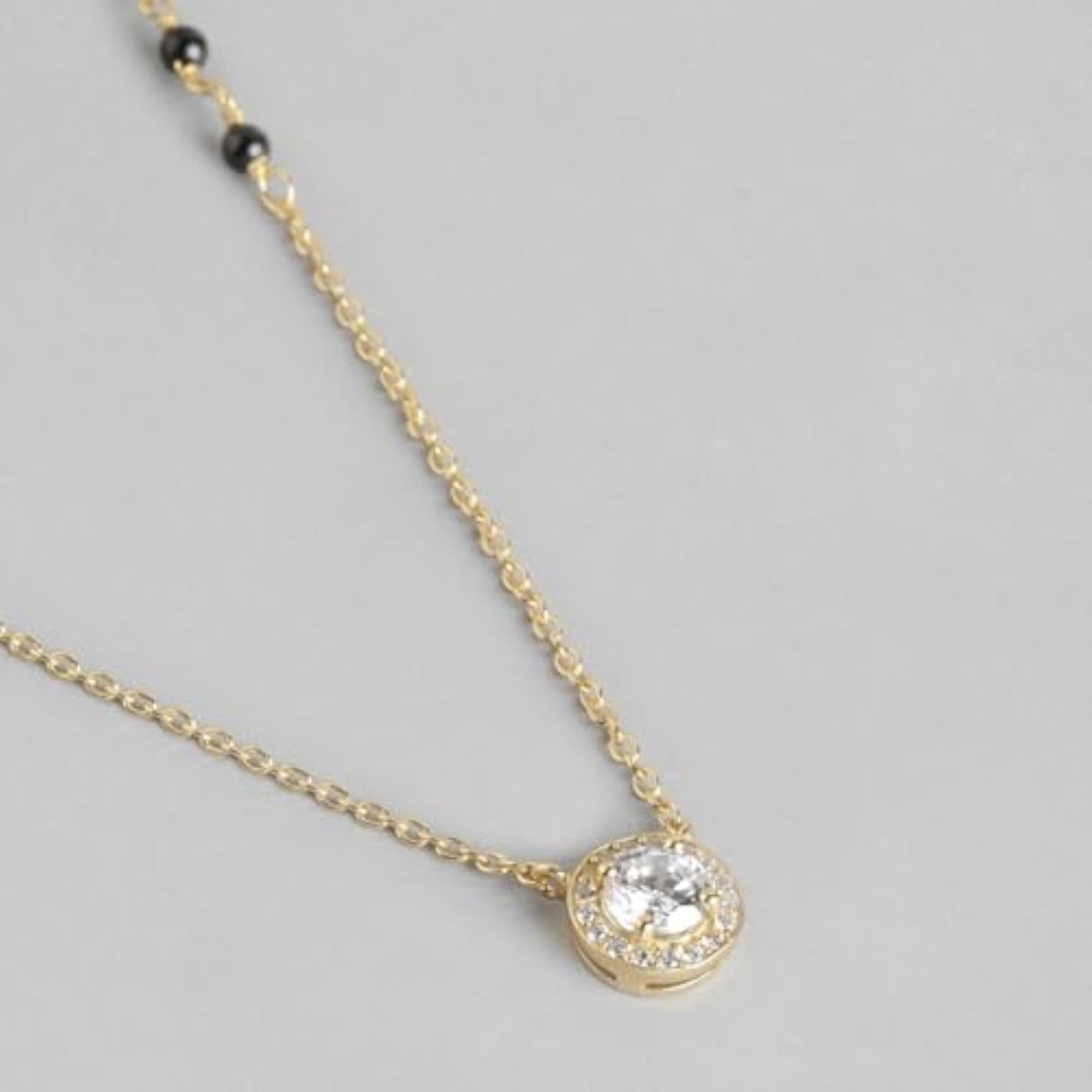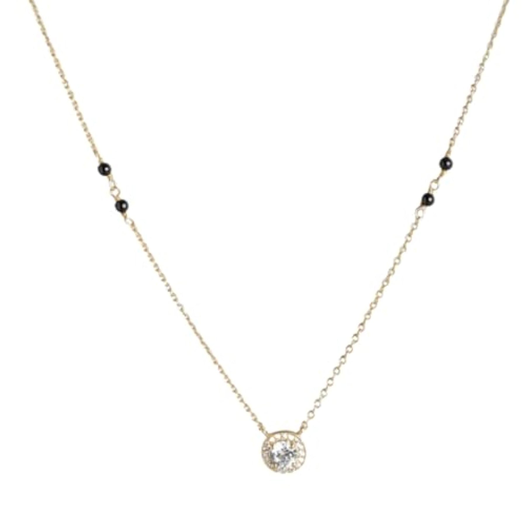 This stunning 925 sterling silver solitaire halo with beads plated mangalsutra is a perfect gift for women, especially for Mother's Day. The design is elegant and timeless.