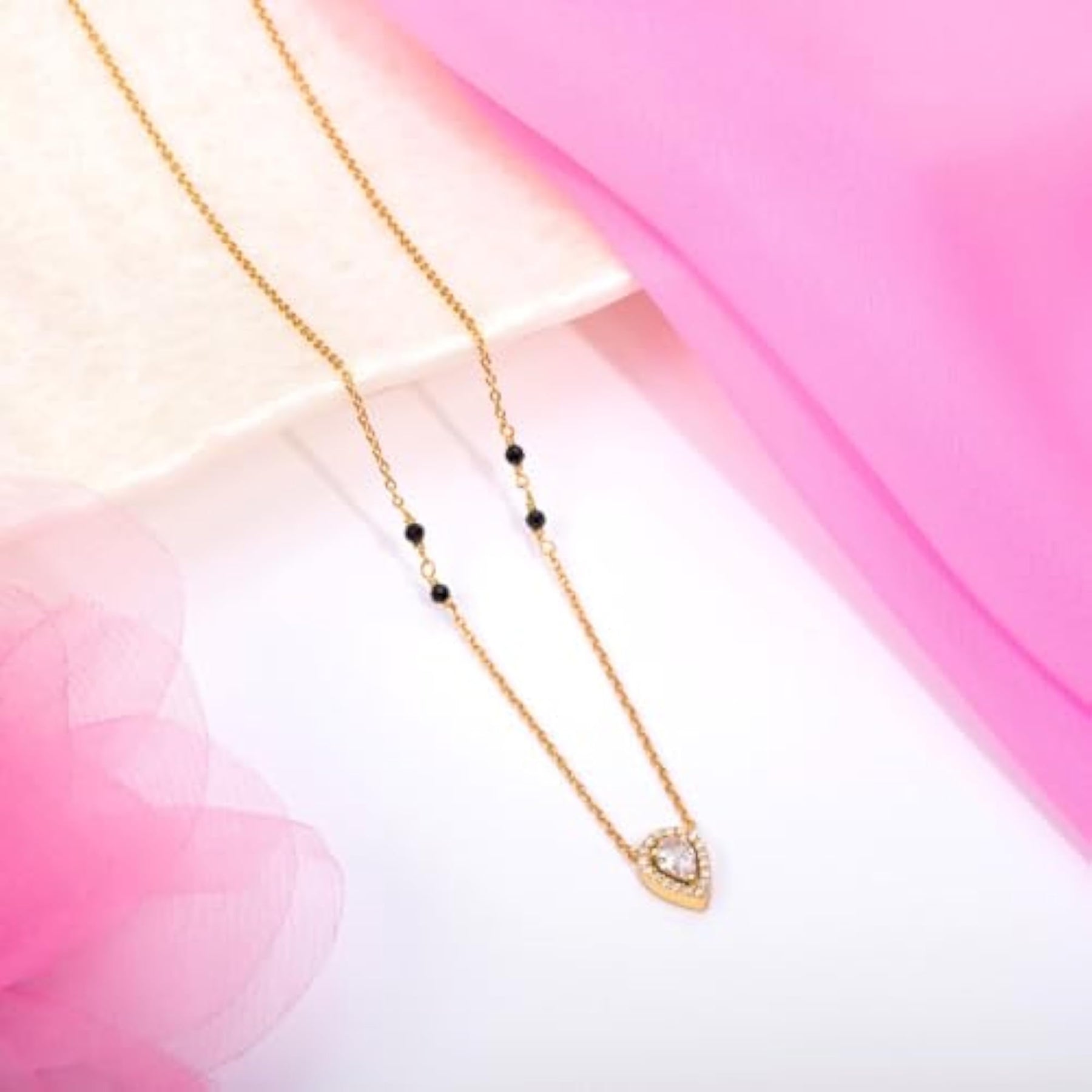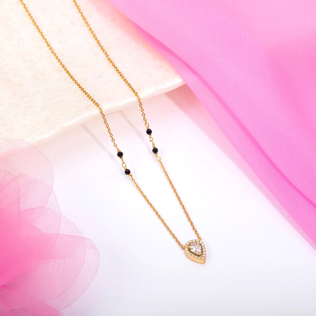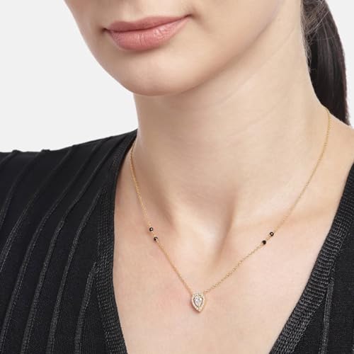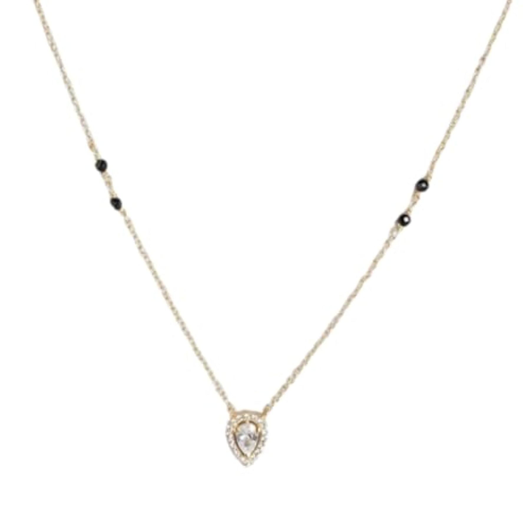 This stunning 925 sterling silver mangalsutra features solitaire halo beads in a tear drop design. It is plated for added elegance and comes with a 925 stamp of authenticity. A special gift for women.