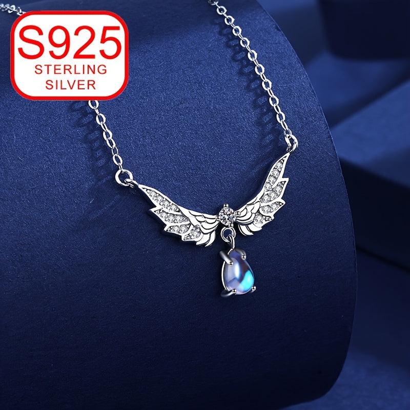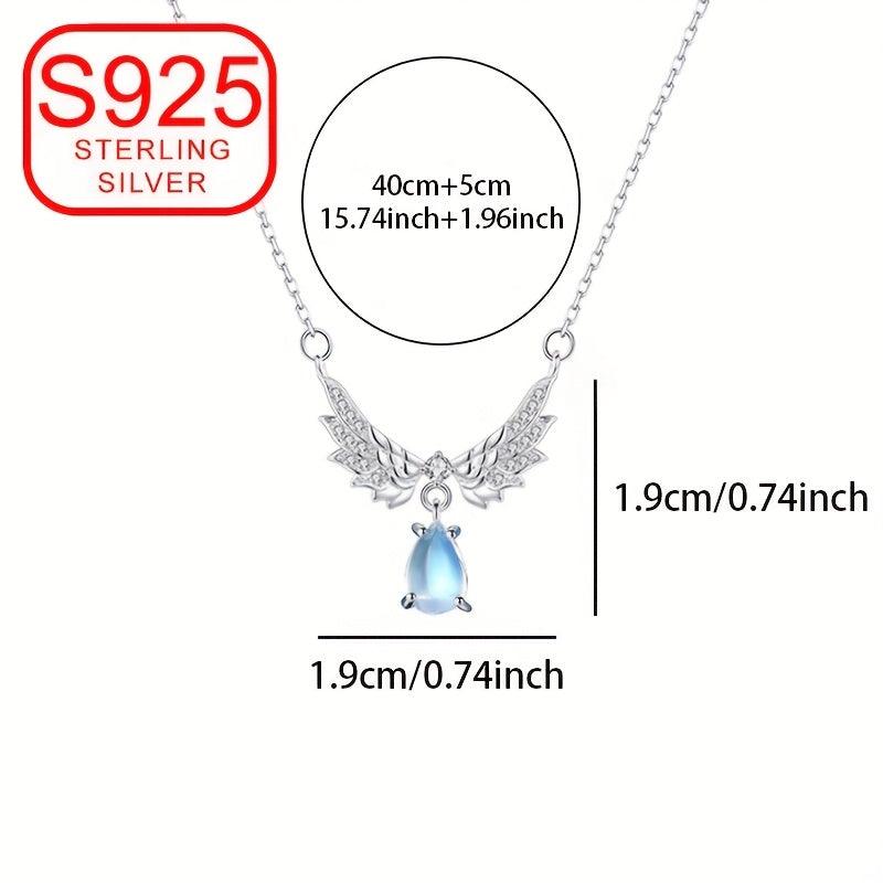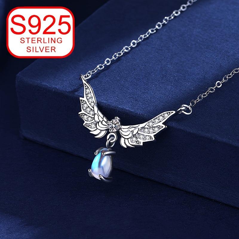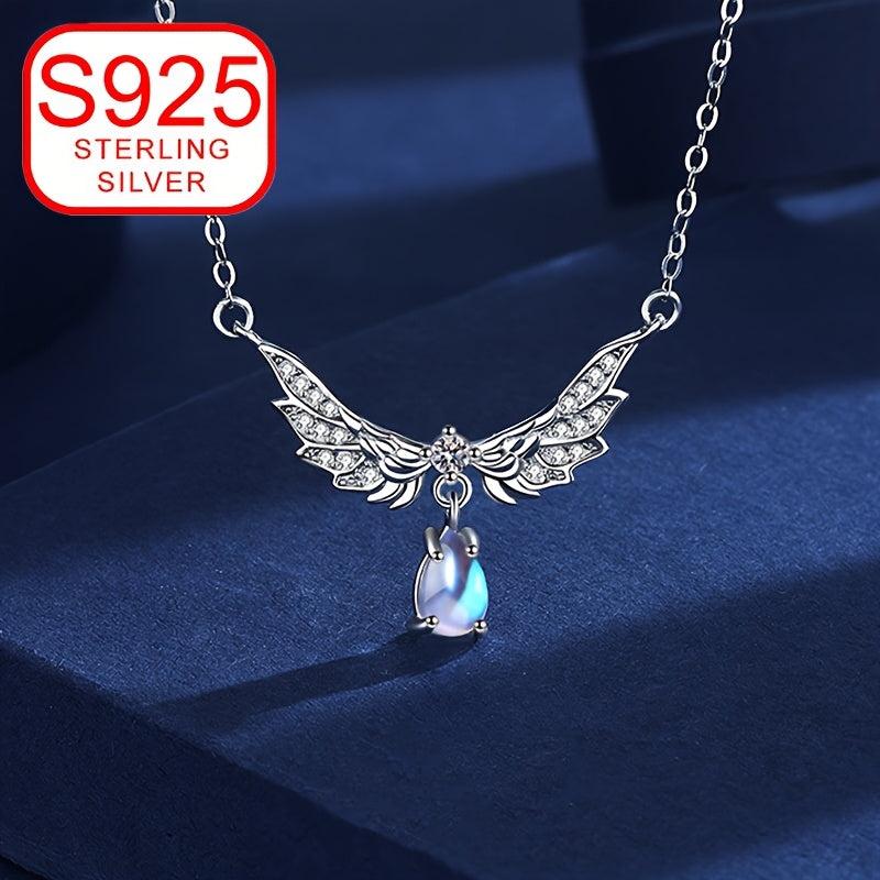 Elegantly crafted 925 silver necklace with a moonstone angel wing pendant. Hypoallergenic and fashionable, suitable for any occasion.
