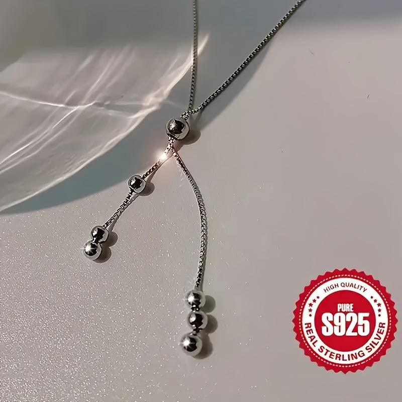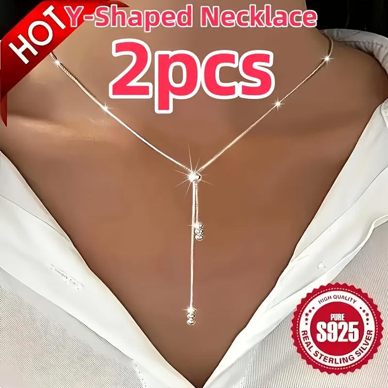 This classic silver plated necklace features a Y-shaped design with adjustable bead sliders for a customizable fit. It is a stylish and elegant accessory suitable for everyday wear or special occasions.