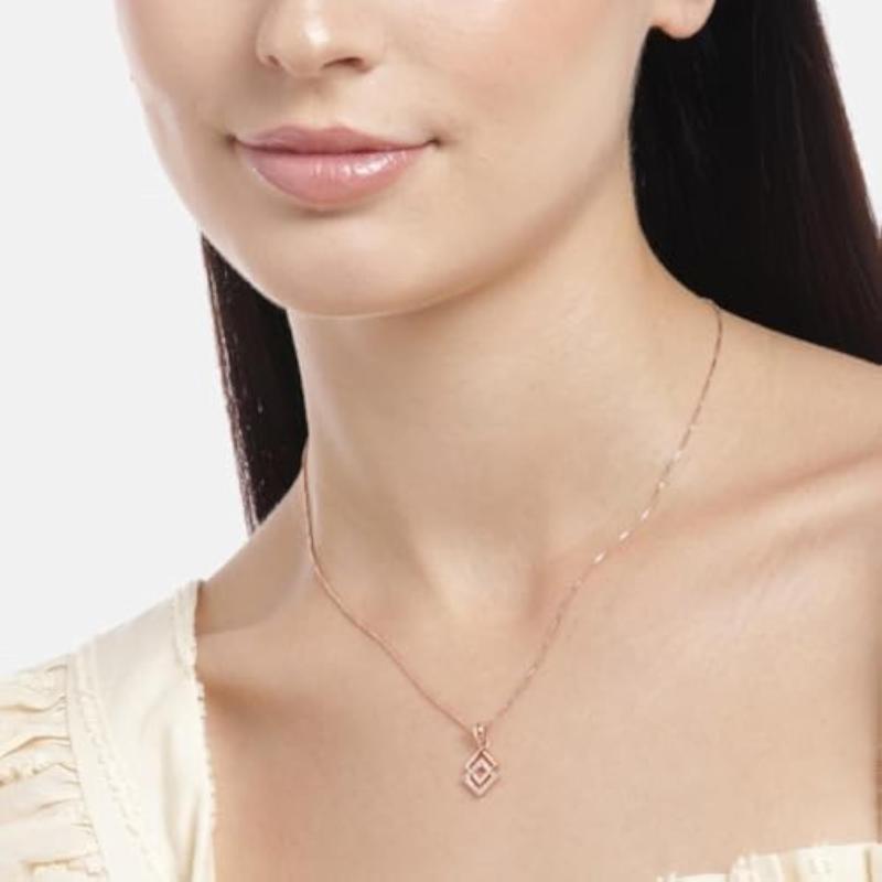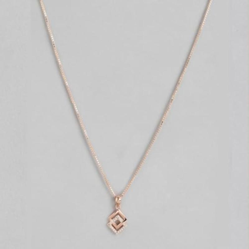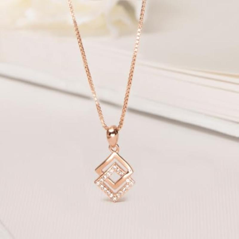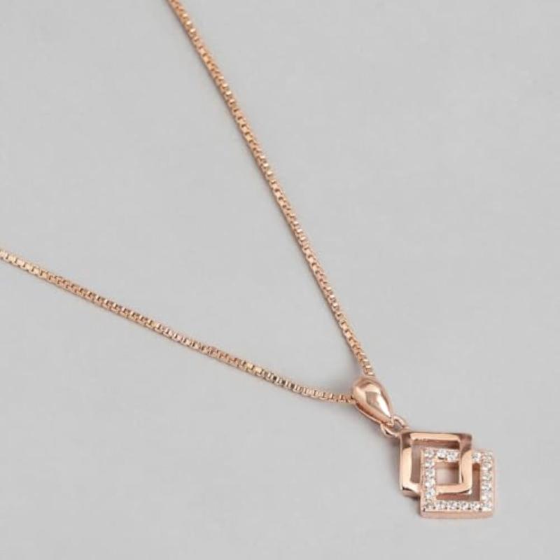 This elegant pendant features a dual square design adorned with sparkling cubic zirconia stones. The rose plated finish adds a touch of glamour to any outfit.