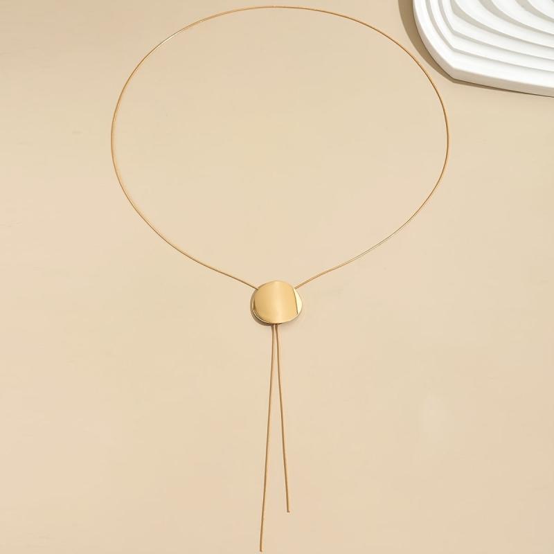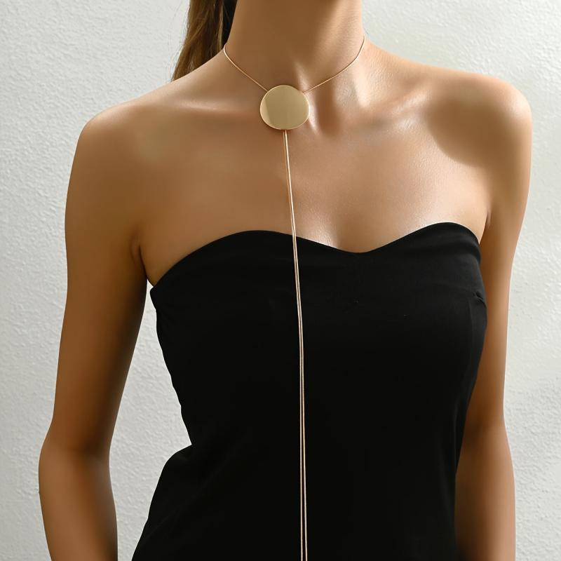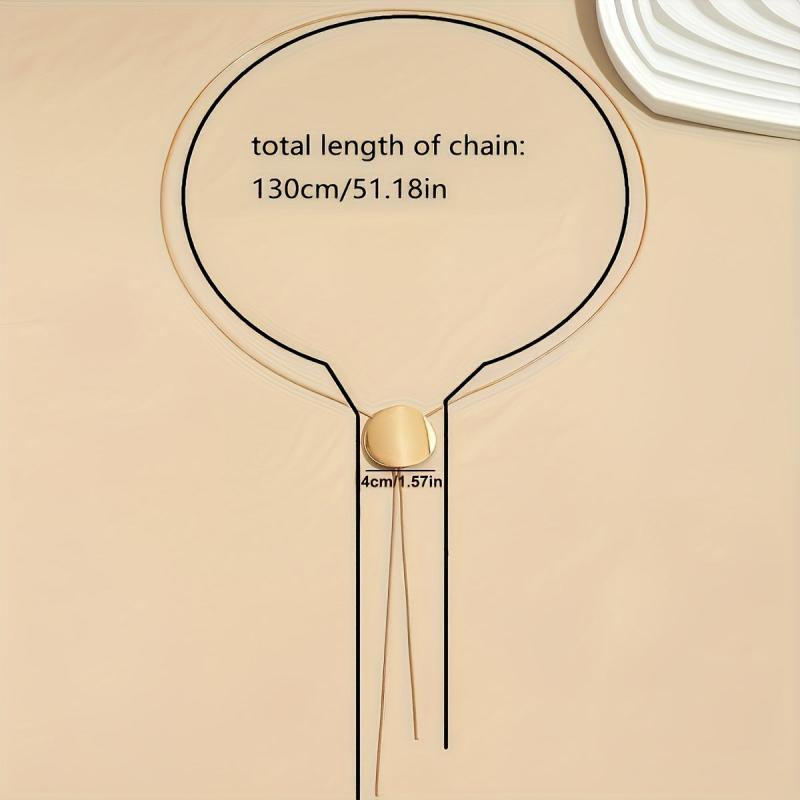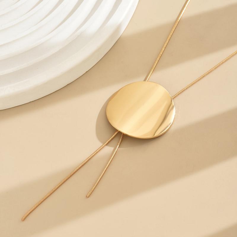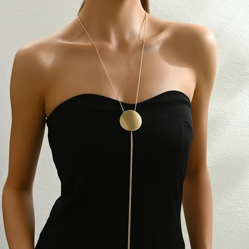 This versatile long necklace features a round golden pendant, perfect for daily wear or formal occasions. The high-quality metal construction ensures year-round style.