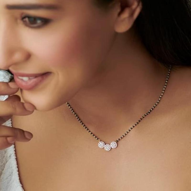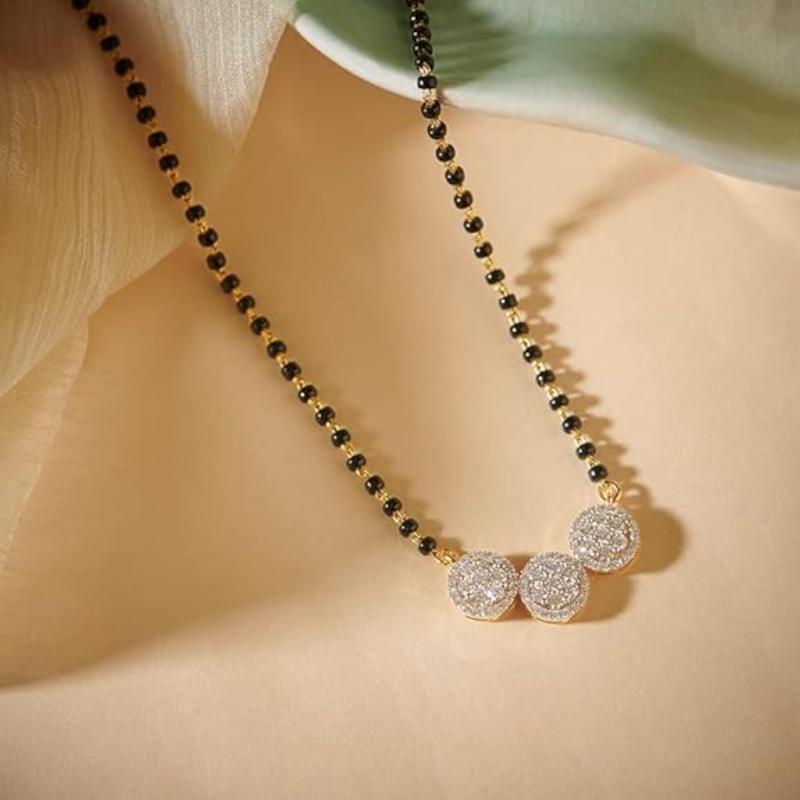 Elegant and stylish traditional mangalsutra with American diamond plated single flower design. Made with high-quality materials for a stunning look.