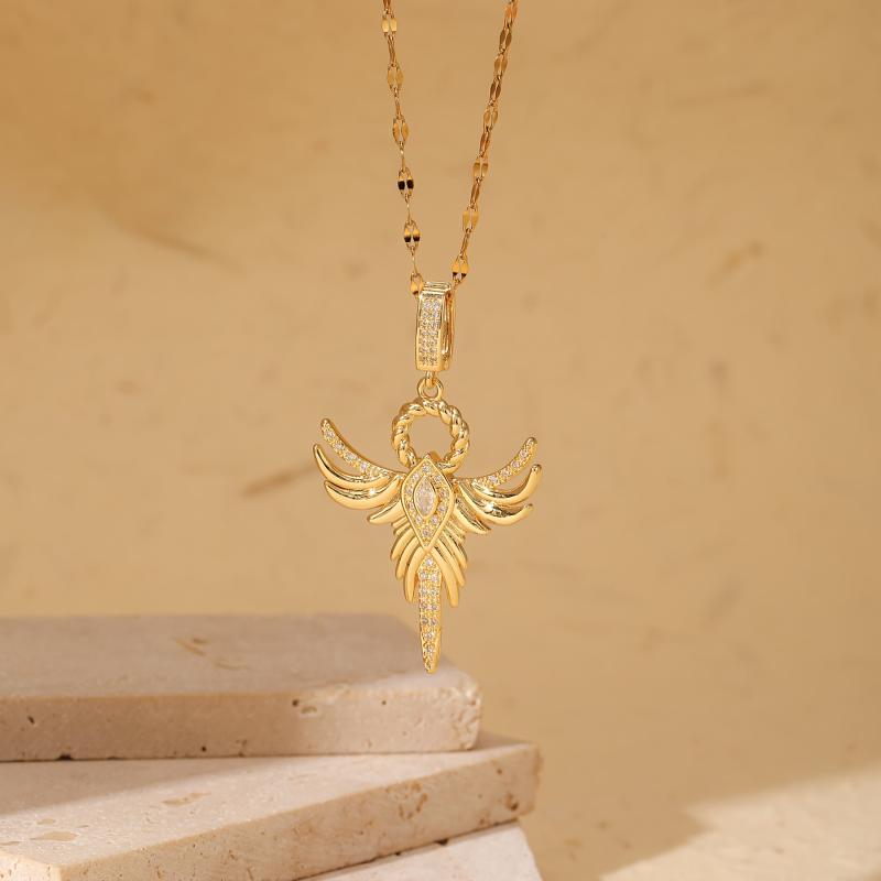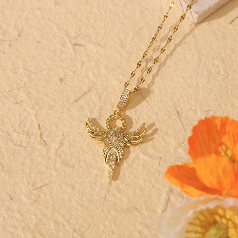 Elegant necklace with angel wings design, perfect for daily wear and vacations. Made of low-allergy stainless steel with synthetic zirconia stone for added sparkle.