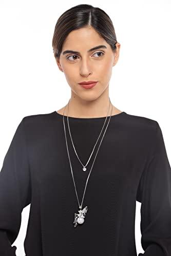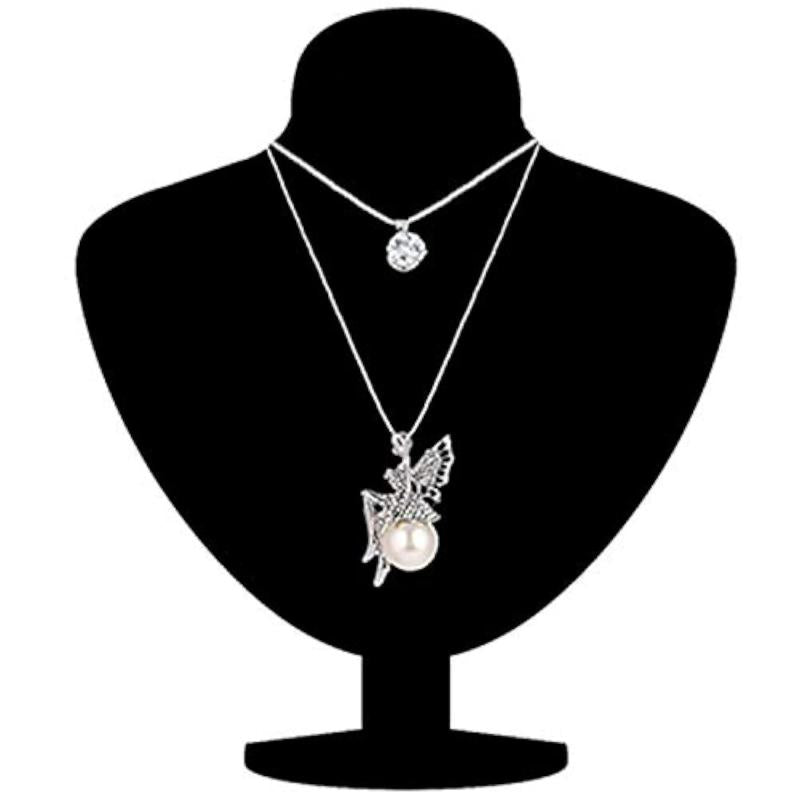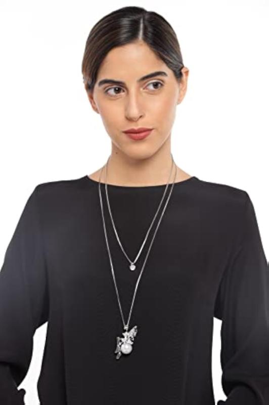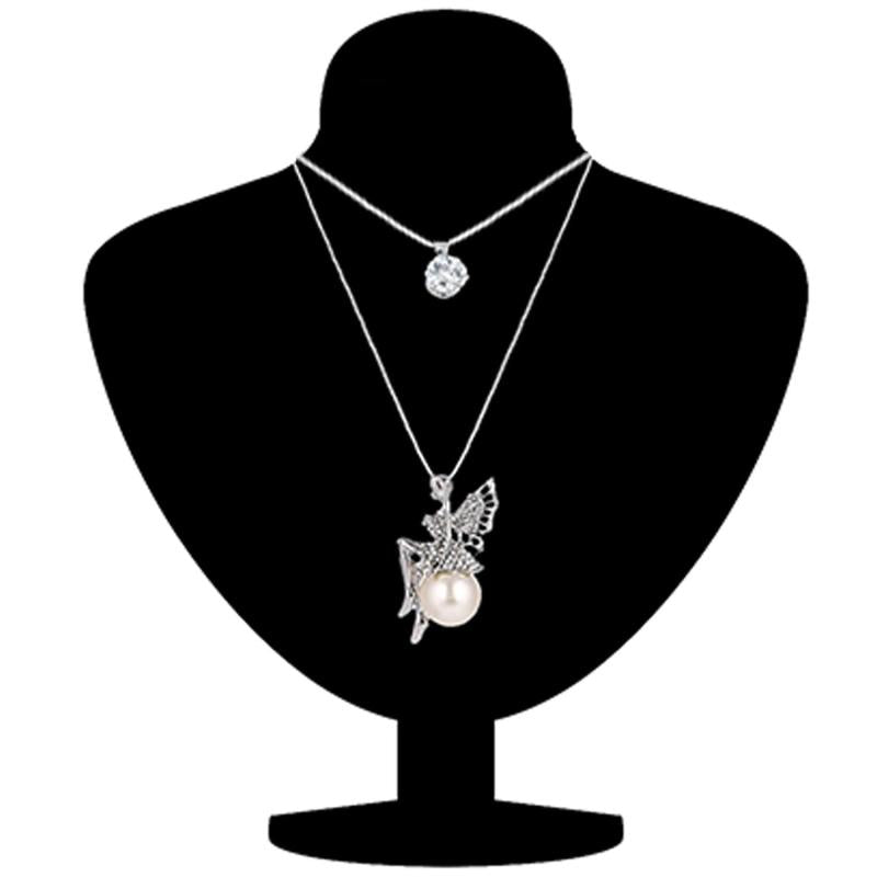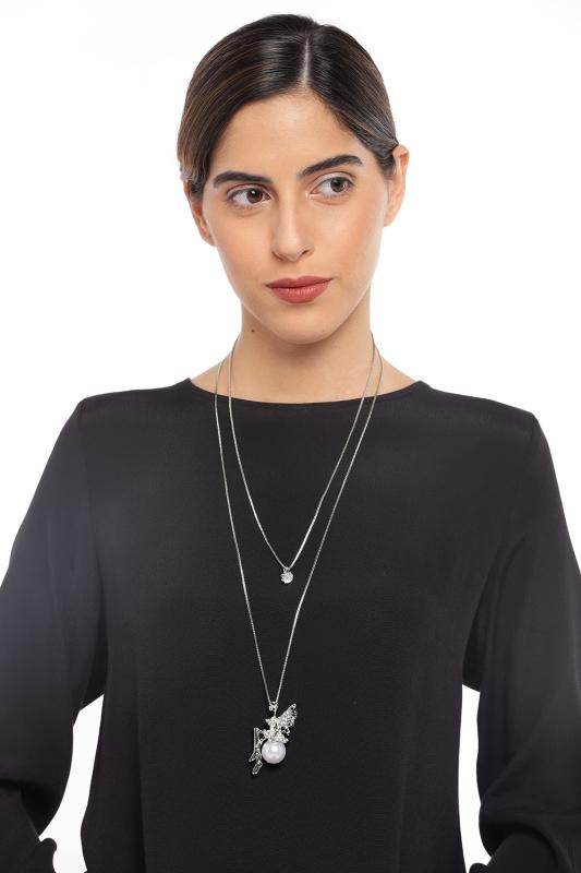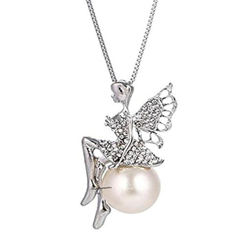 Elegant rhodium plated long chain pendant featuring angel wings design with a beautiful artificial pearl.