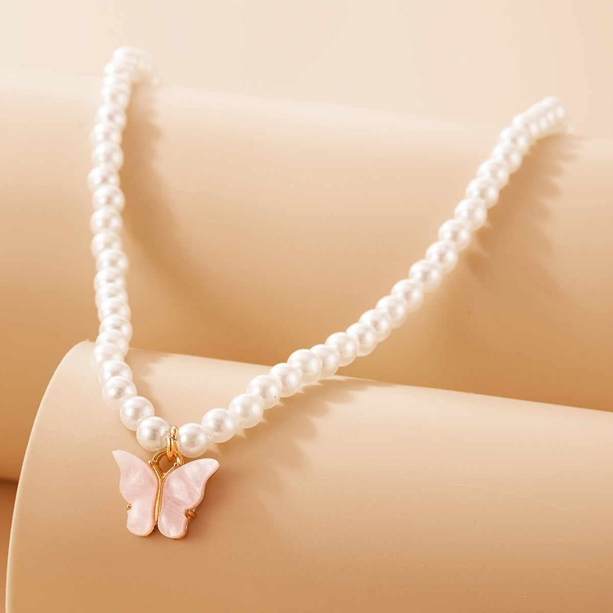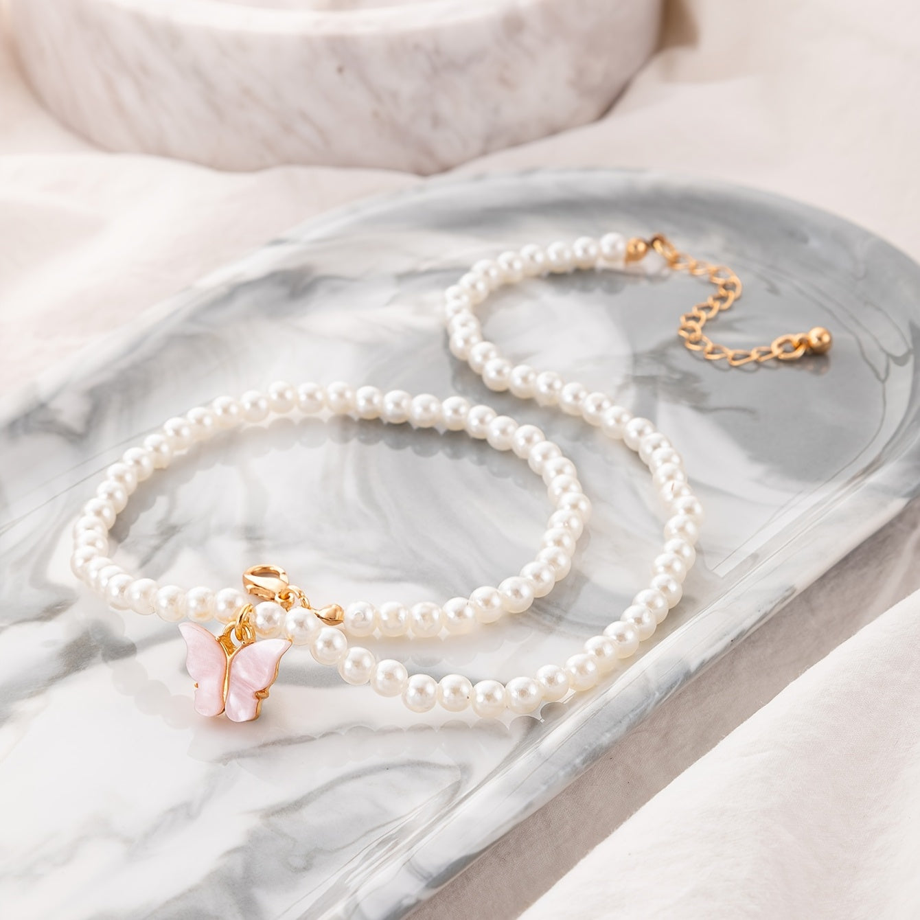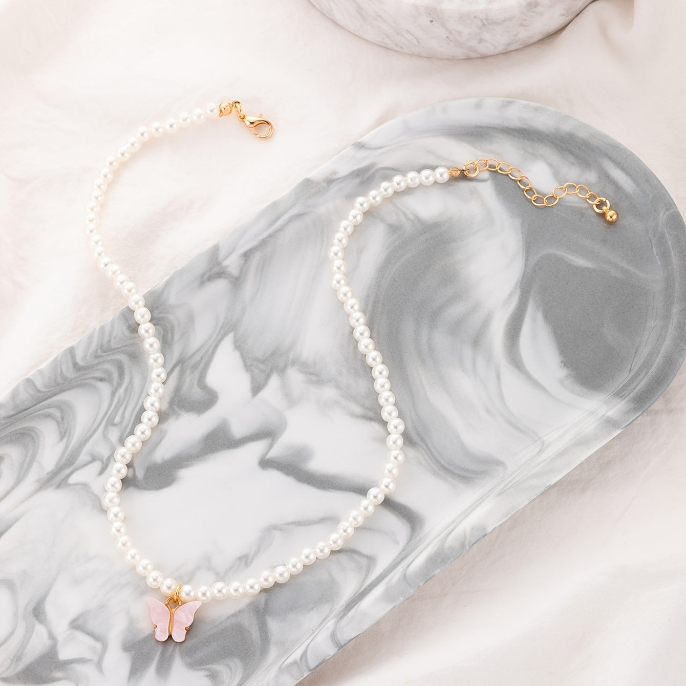 This elegant beaded necklace features faux pearls and a butterfly shape choker design, perfect for weddings and special occasions.