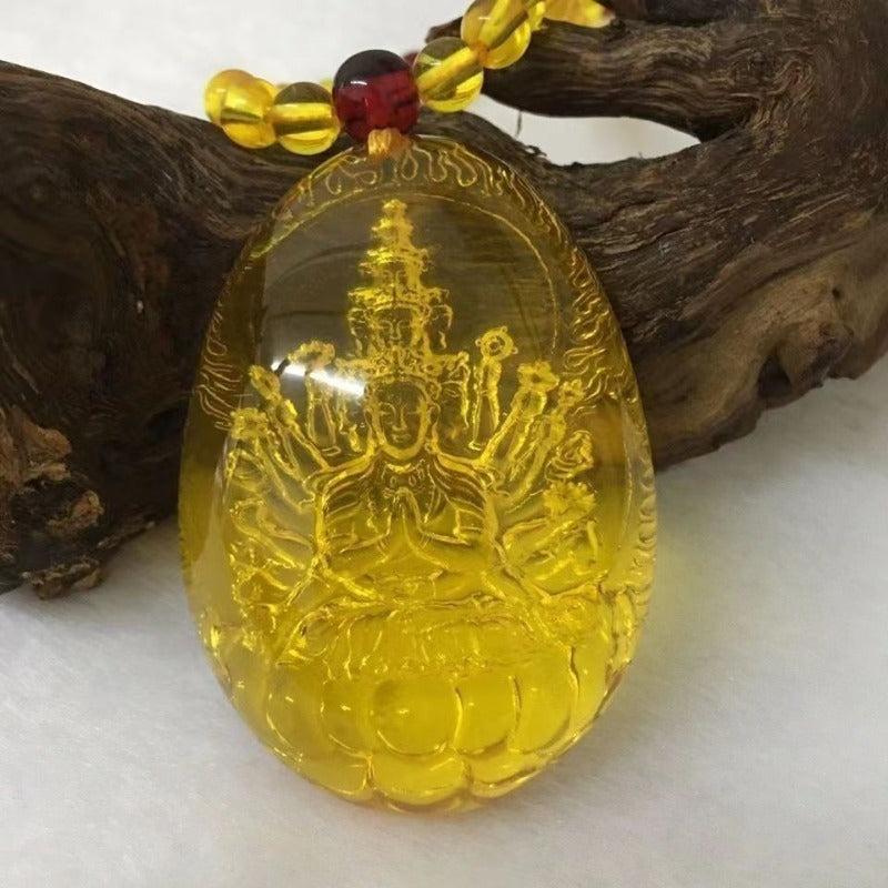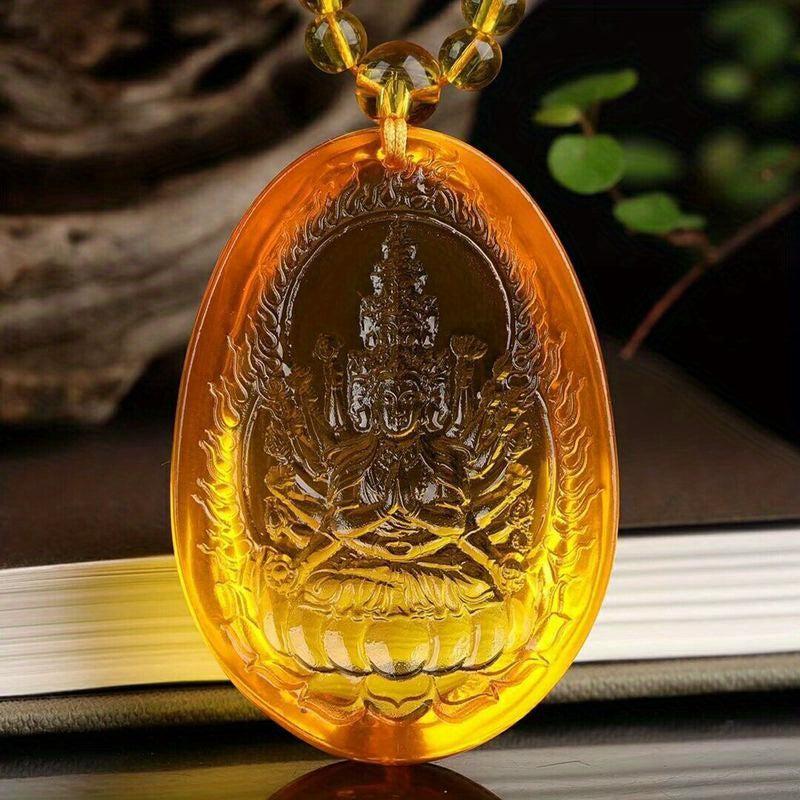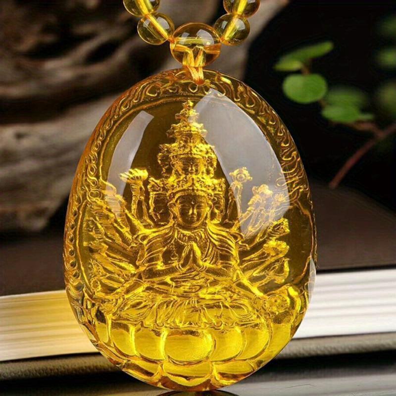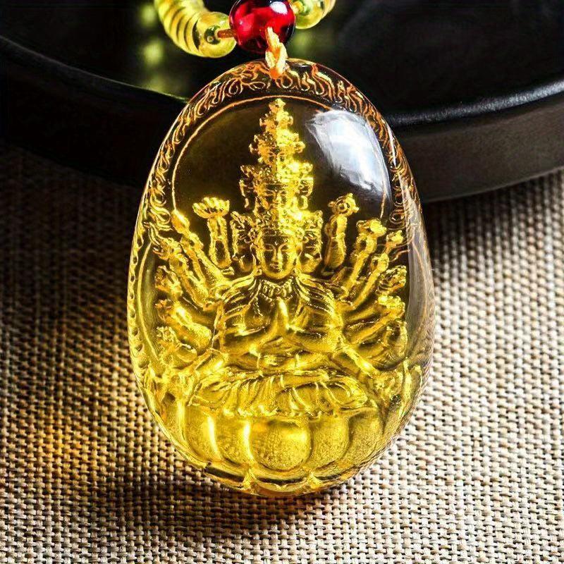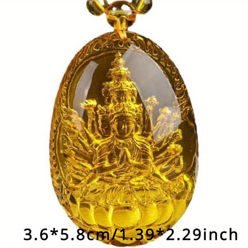 This unique pendant necklace features a Guanyin Bodhisattva design made of beeswax with golden tone accents. Perfect for spiritual individuals looking to add a touch of Bohemian style to their wardrobe.